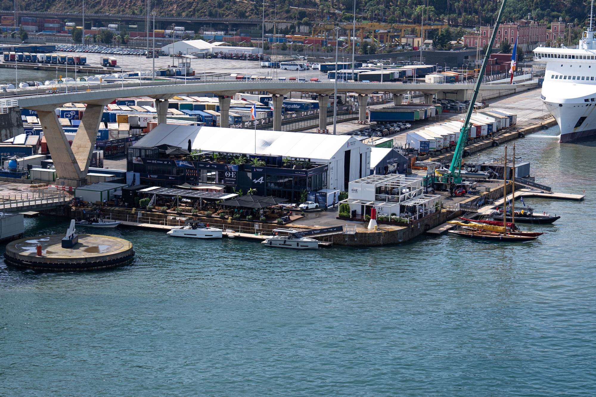 El equipo francés está situado un poco más lejos de los demás, en el Moll de Ponent, hacia el puerto de cruceros. Al igual que la base anterior, no es accesible para el público en general. La única forma de echarle un vistazo es desde más lejos, por ejemplo desde el World Trade Center, desde el agua o desde el puente que hay encima.