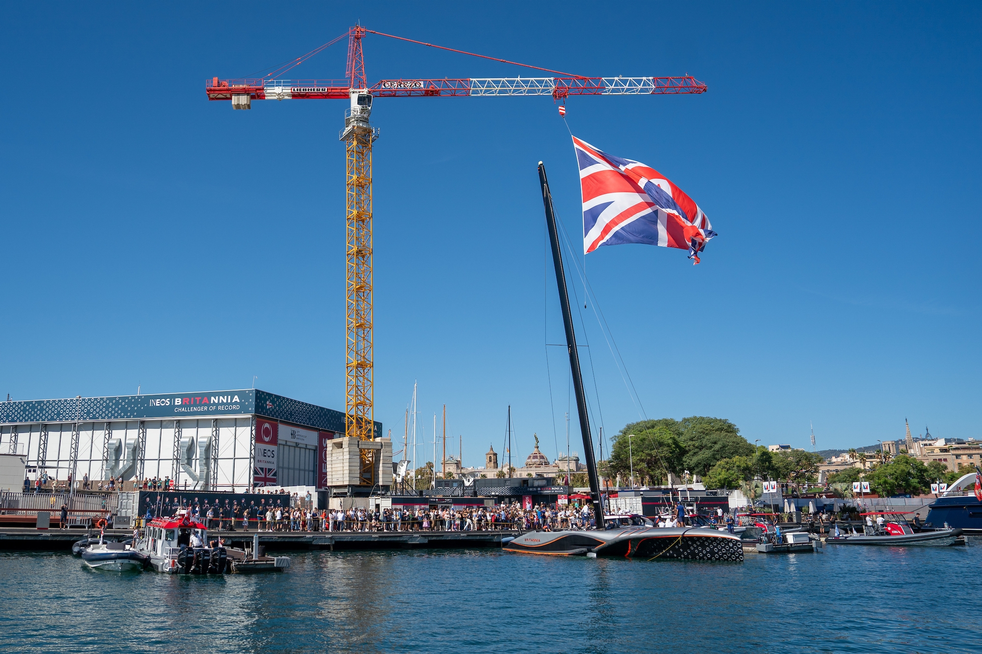 Es fácil ver a los fanáticos del INEOS Britannia reunidos para ver al elegante AC75 en acción, esperando ansiosamente la salida del equipo hacia el campo de regatas.