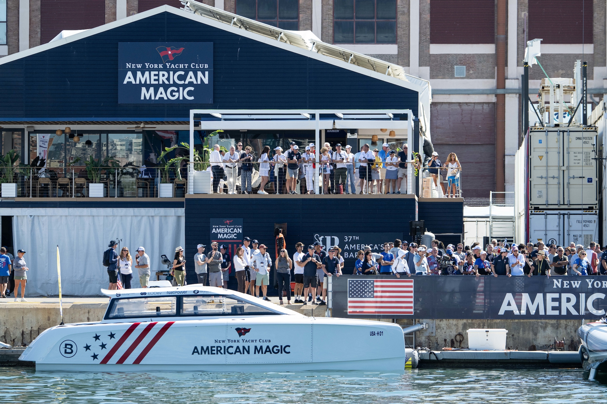 La base, situada justo en medio del puerto deportivo y rodeada de enormes barcos, está escondida y no es accesible al público. Esto dificultó ver de cerca el hermoso barco blanco AC75 y su equipo.