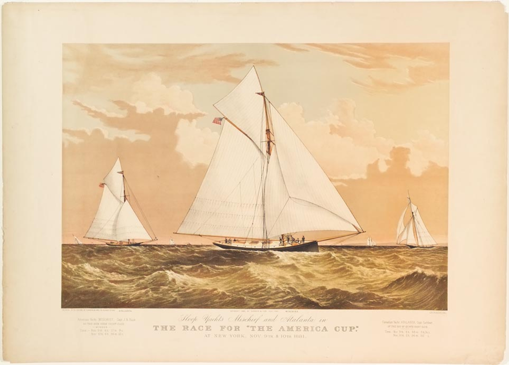 And defend she did, the Mischief romped away in a two-race series that was described as a ‘procession’ in the journals and failed to rouse much interest in the New York locals, so sure were they of a thumping victory. The margins of victory on corrected time were 28 and 39 minutes in the two races respectively and despite Captain Cuthbert wanting to winter in New York and challenge again in the following year with Atlanta, the new Deed of Gift subsequently precluded this, and she returned to Lake Ontario to compete successfully there.