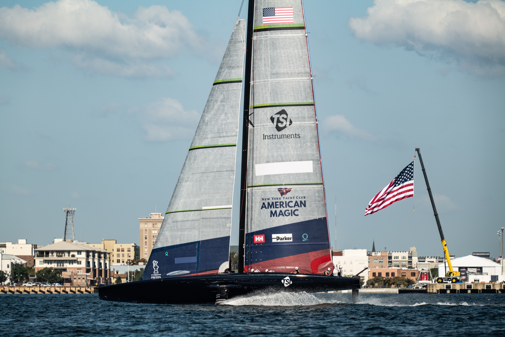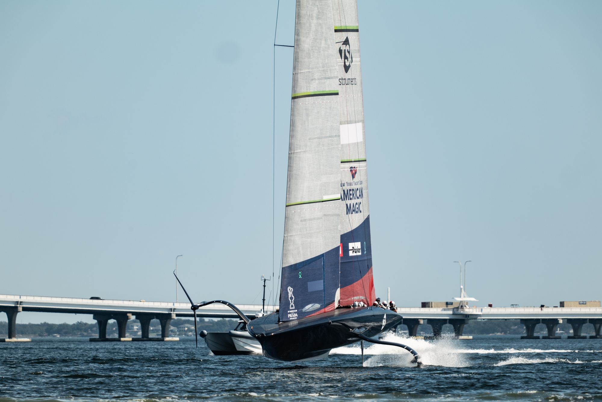 Looking highly impressive, stable and controlled, the New York Yacht Club American Magic Team once again caught the early morning breeze out in Pensacola, docking out at 8.28am sharp after a crane in before 7am. The team are bracing themselves for the incoming, late season tropical storm, Nicole, that the National Hurricane Centre are predicting could escalate to a category 1 hurricane as it hits landfall