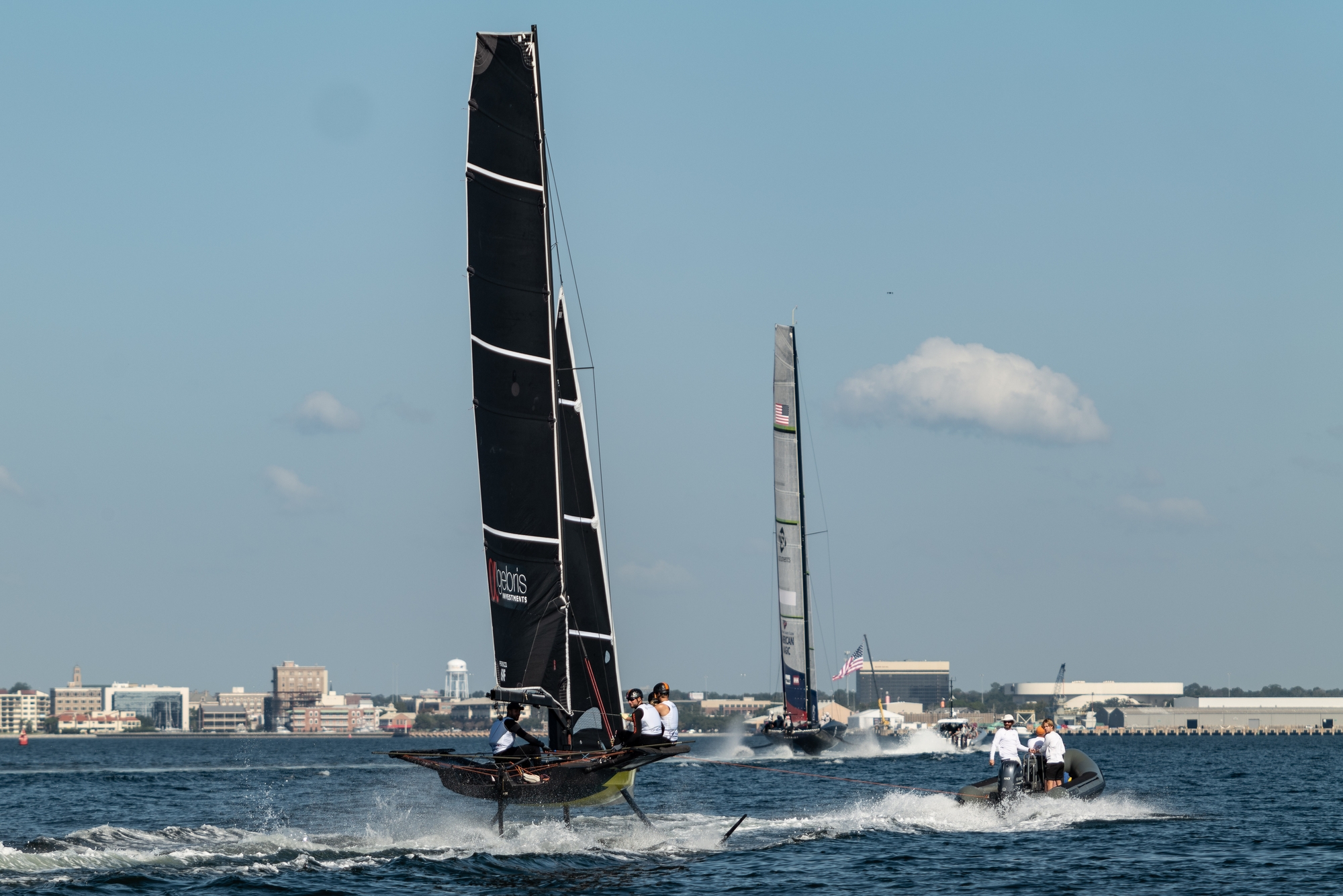 Patriot was towed to the south end of bay to have an upwind start. Approximately 6 up/downwind legs were completed before the breeze died. Subsequent efforts resulted in frequent touch downs/tow ups. By the end of the day Patriot was reaching for short distances then making attempts to complete foiling tacks.