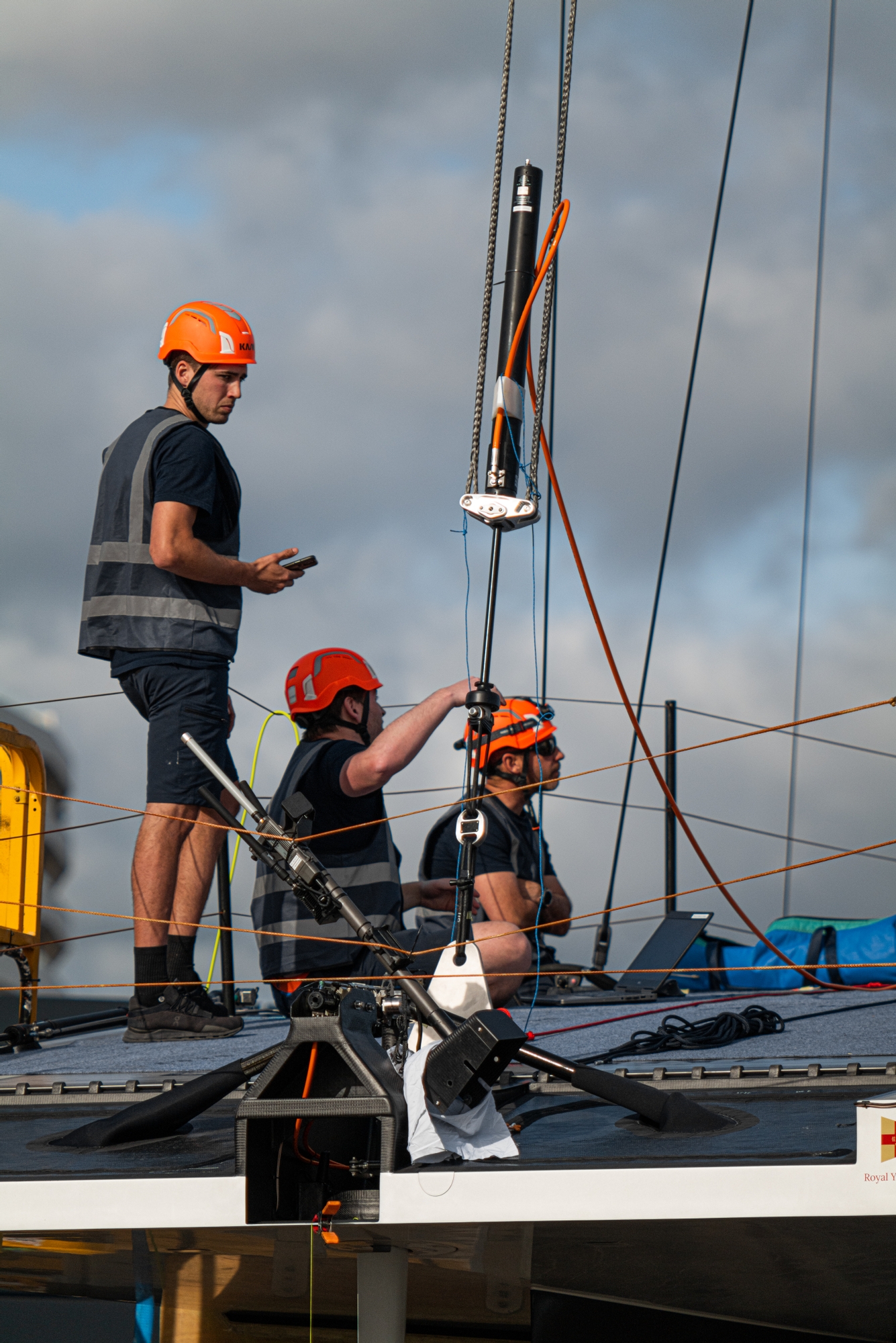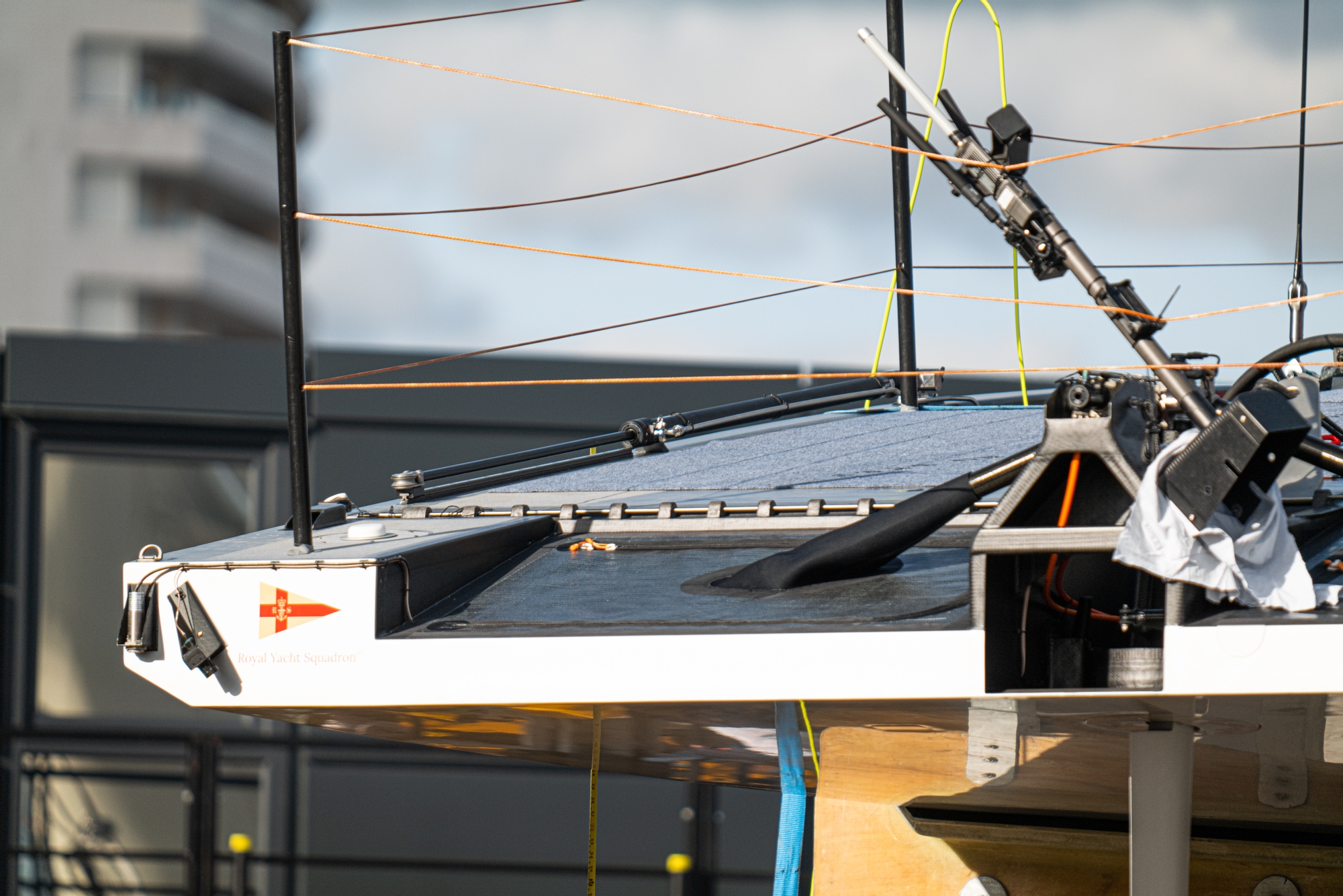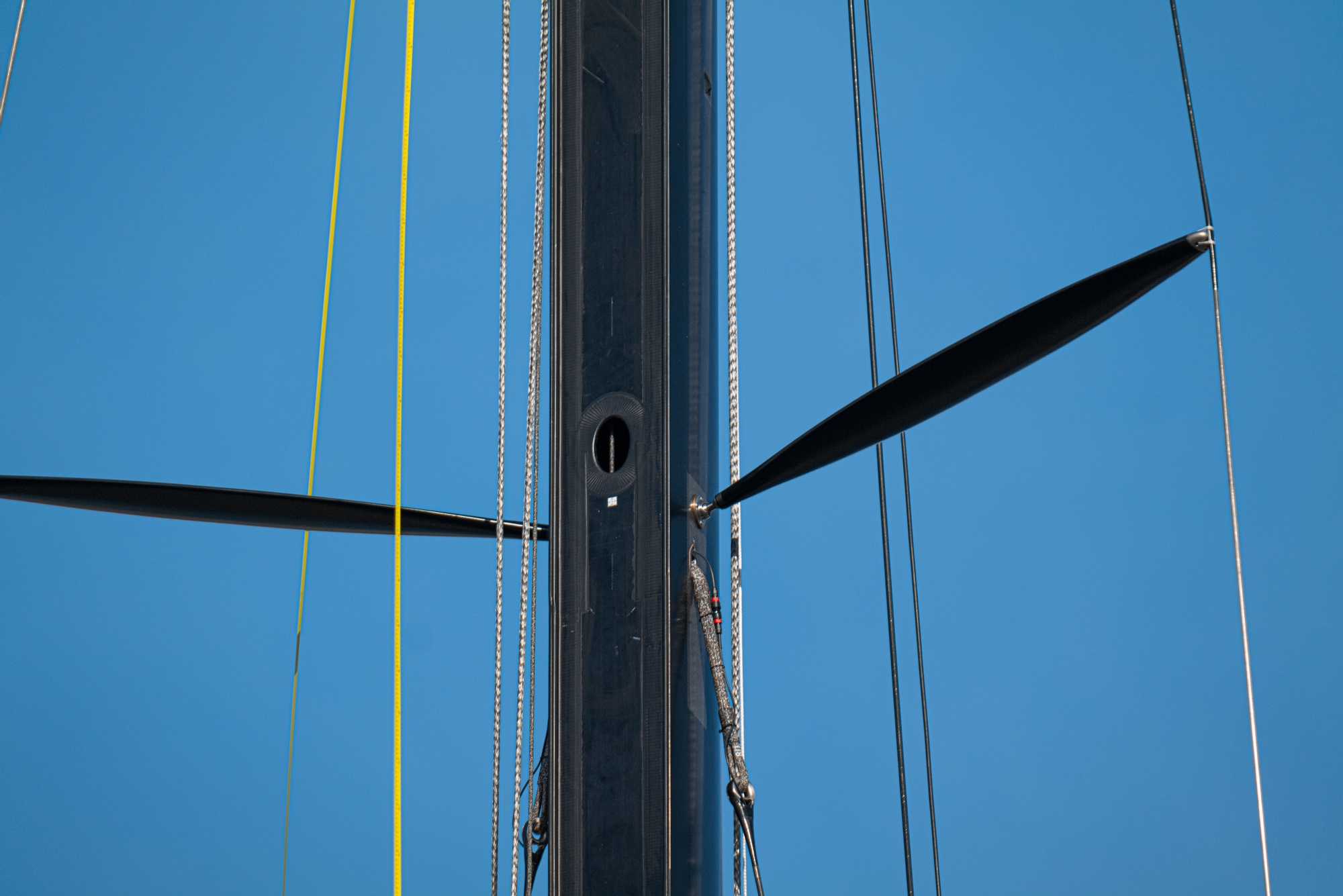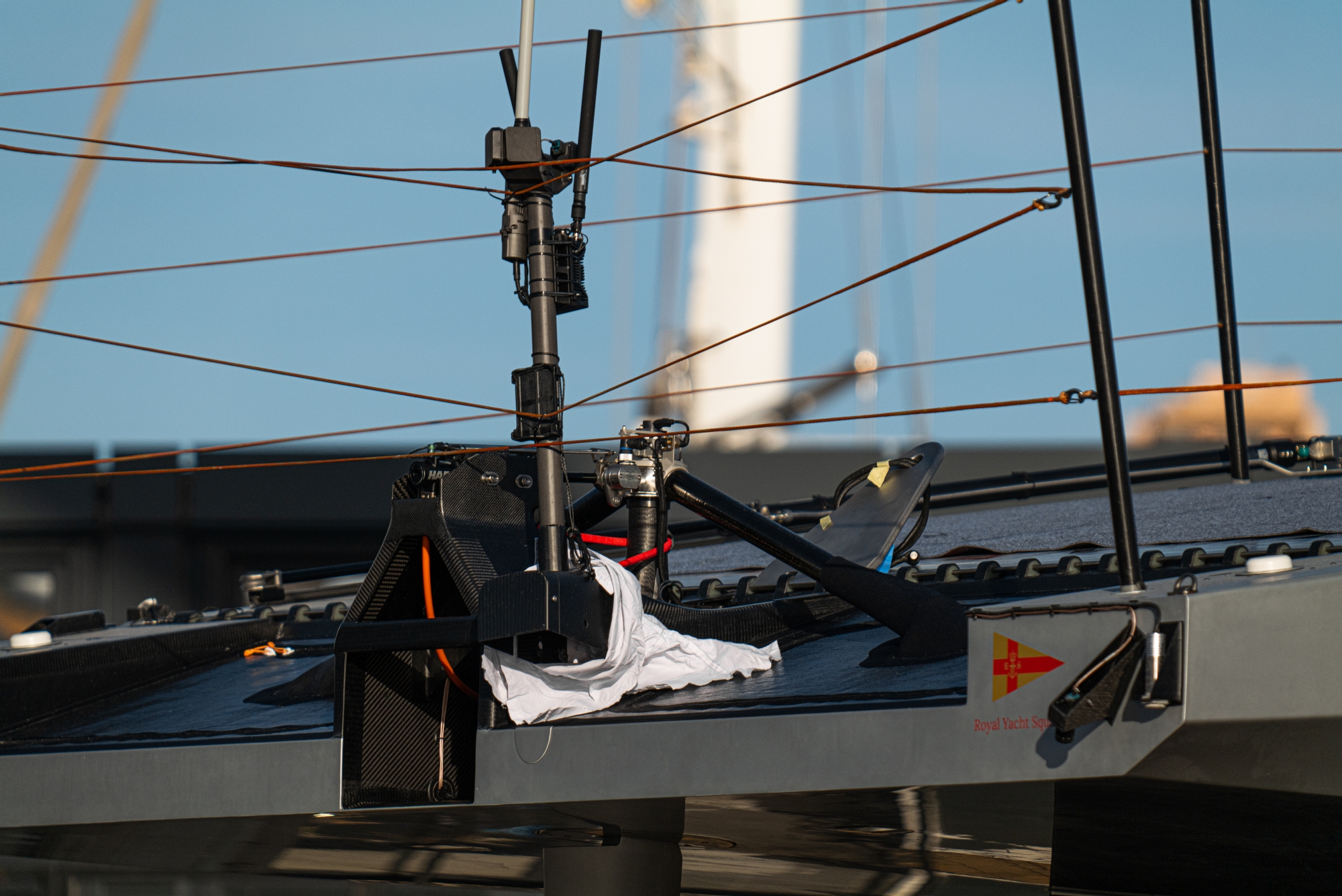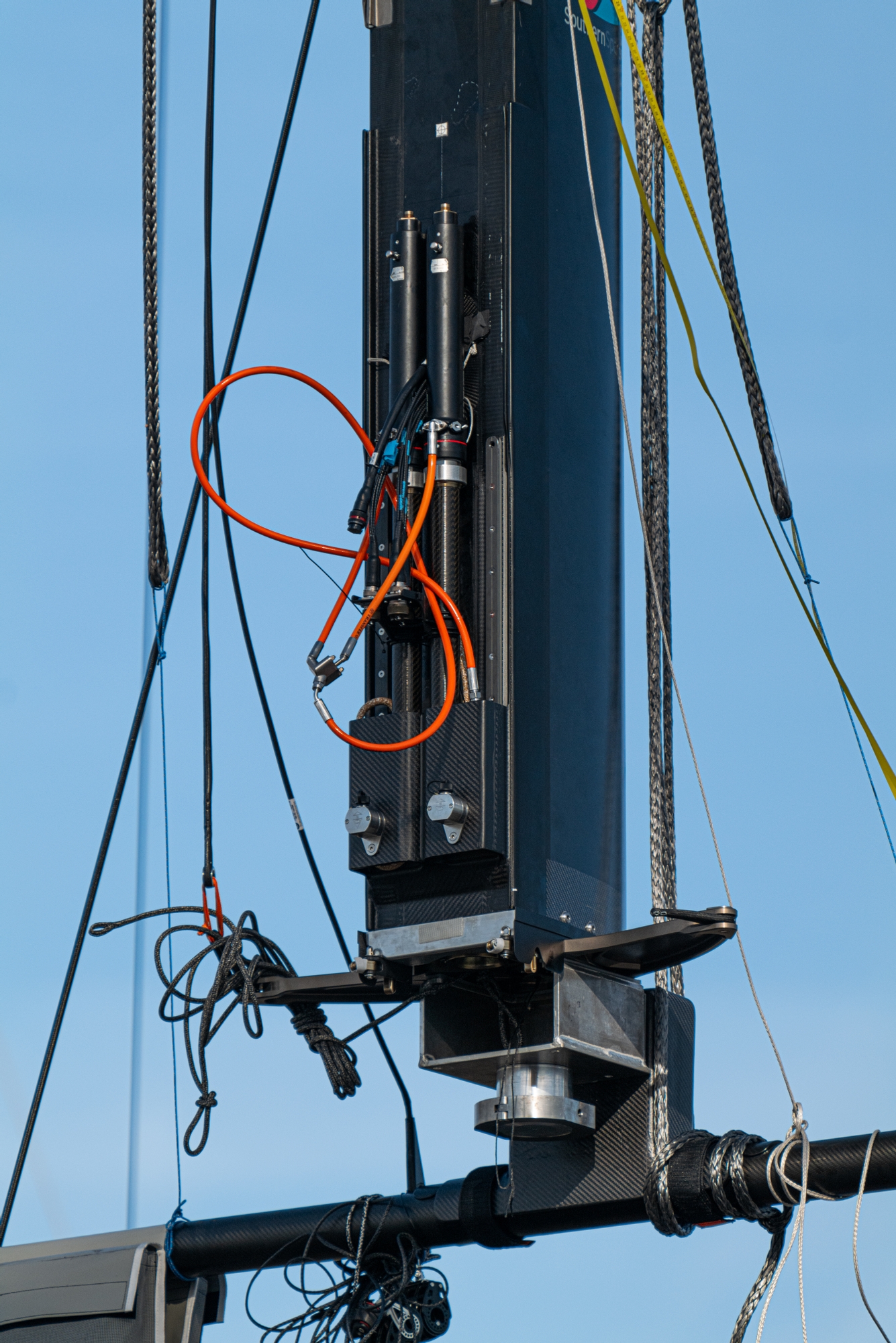 The on-site recon team heard a loud noise early in the afternoon, indicating that load testing was ensuing, and several hydraulic rams could be seen – one for the backstay and two either side on tracks at the aft end of the decks. Plenty of detail could be seen up the rig with what’s assumed to be very neat camera mounts hidden behind carbon cloth for perfect aero, punctuated at distances from top to bottom either side as specified below.