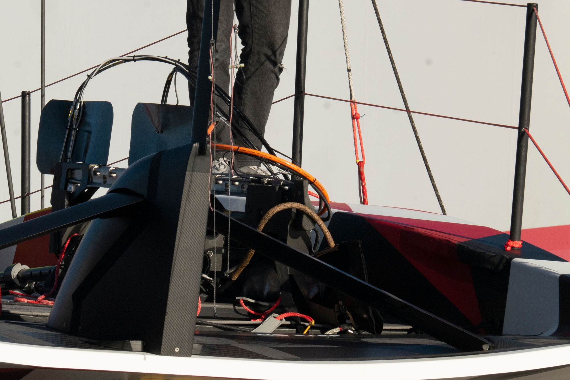 The Italians looked well under control today, harnessing huge power whilst maintaining low flight upwind with the quite mesmerising uber-control of the mainsail being aggressively trimmed through any lull to keep maximum power on. The precision of the trim was a marvel and the team showed why many commentators feel that this training regime is the one making the biggest gains and extracting the most from their considerable sailing time.