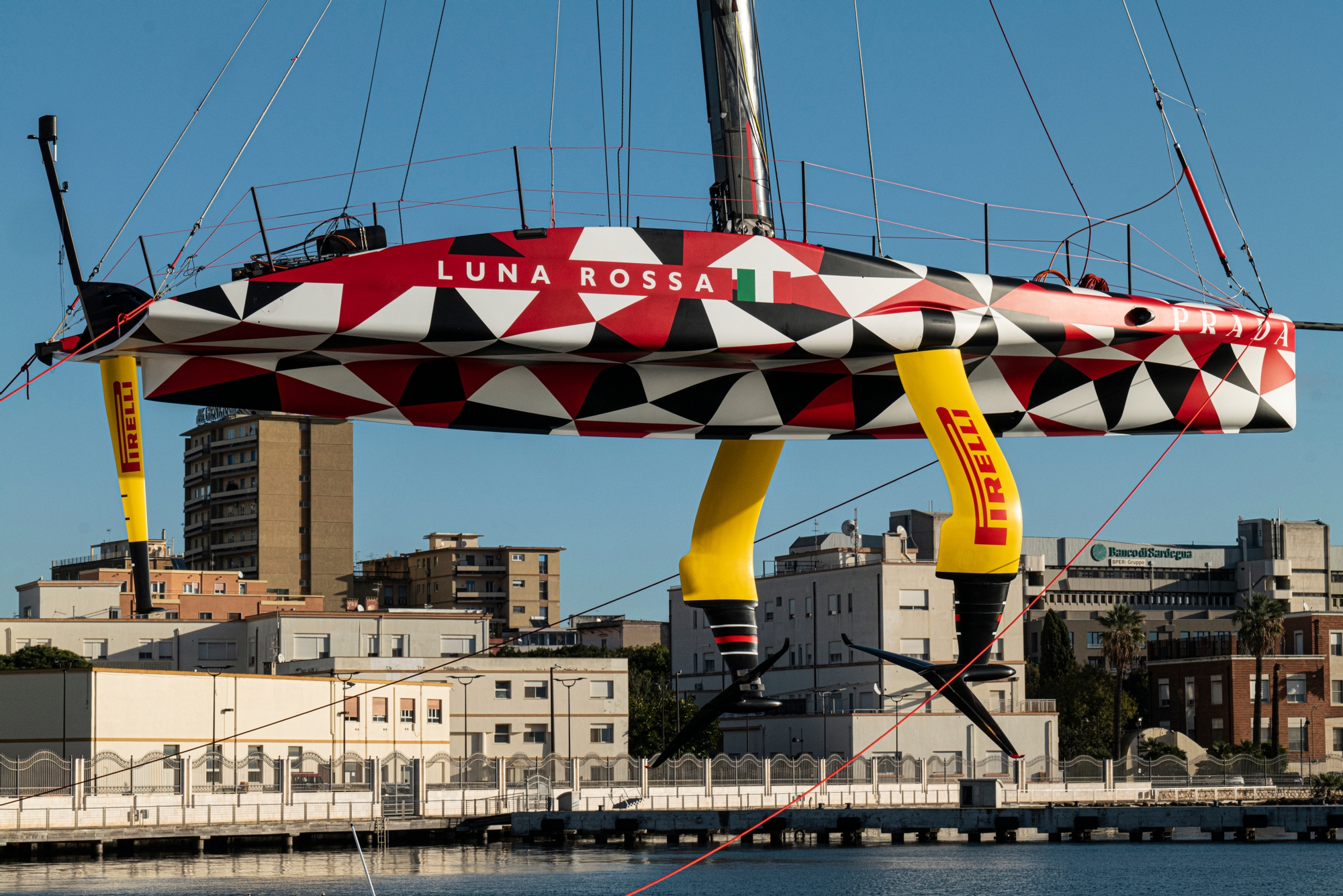 The envelope is being pushed. The modifications are coming onstream fast. And today, Luna Rossa Prada Pirelli’s sailors had the pedal to the floor on a perfect day of training on the Golfo degli Angeli in Cagliari. When the wind came in, it was sublime to watch the team click together with very smooth flight control, full commitment through the tacks and gybes and solid transitions afterwards.