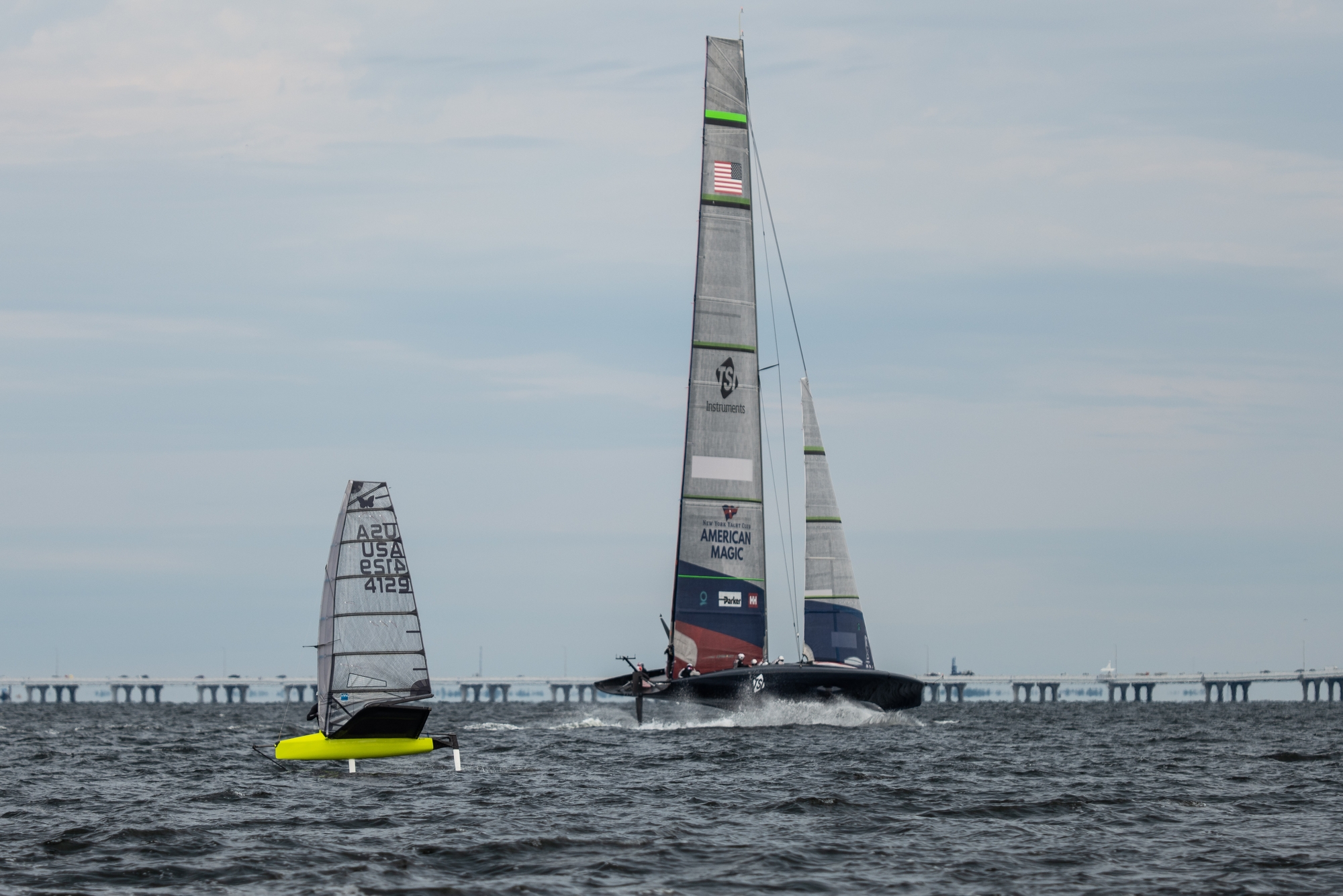 Notes: Patriot was on foil a combined total of 113 minutes. Flight times ranged from 5 minutes to 29 minutes (10, 20, 12, 4, 18, 6, 9, 29, 5 minutes respectively). Five headsails were loaded into the support rib today.