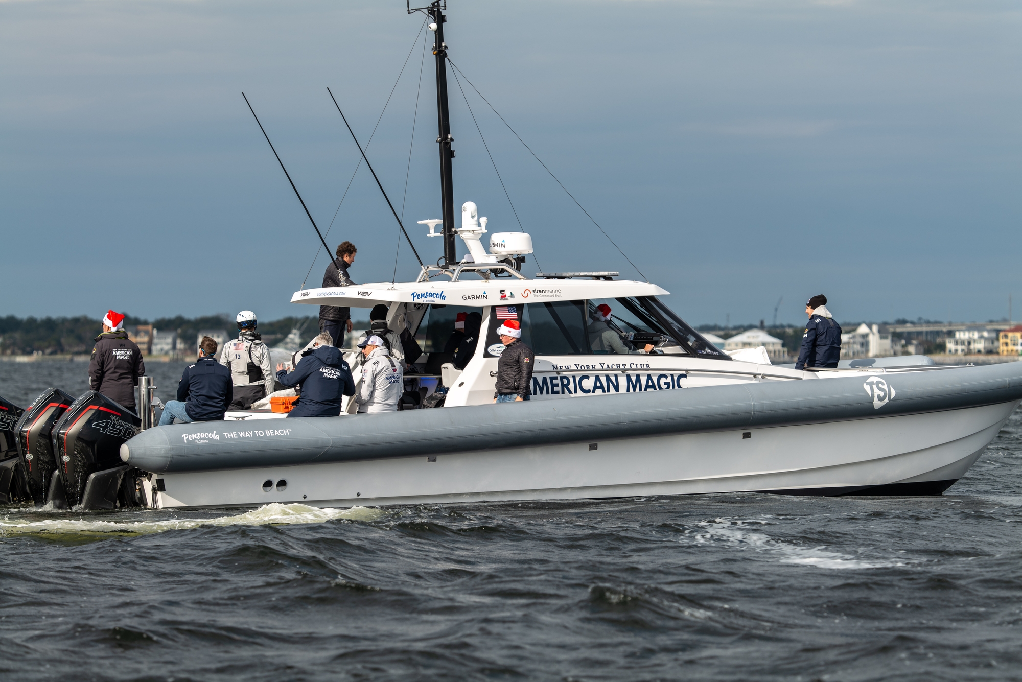 They had their Santa hats on at the crew briefing this morning before the New York Yacht Club American Magic Team docked-out early and took to the water for a Saturday blast around a blustery Pensacola Bay. And it was one heck of a sail with the team covering some 54 nautical miles and throwing in a total of 65 manoeuvres. No Christmas break for the rotating cyclors today.