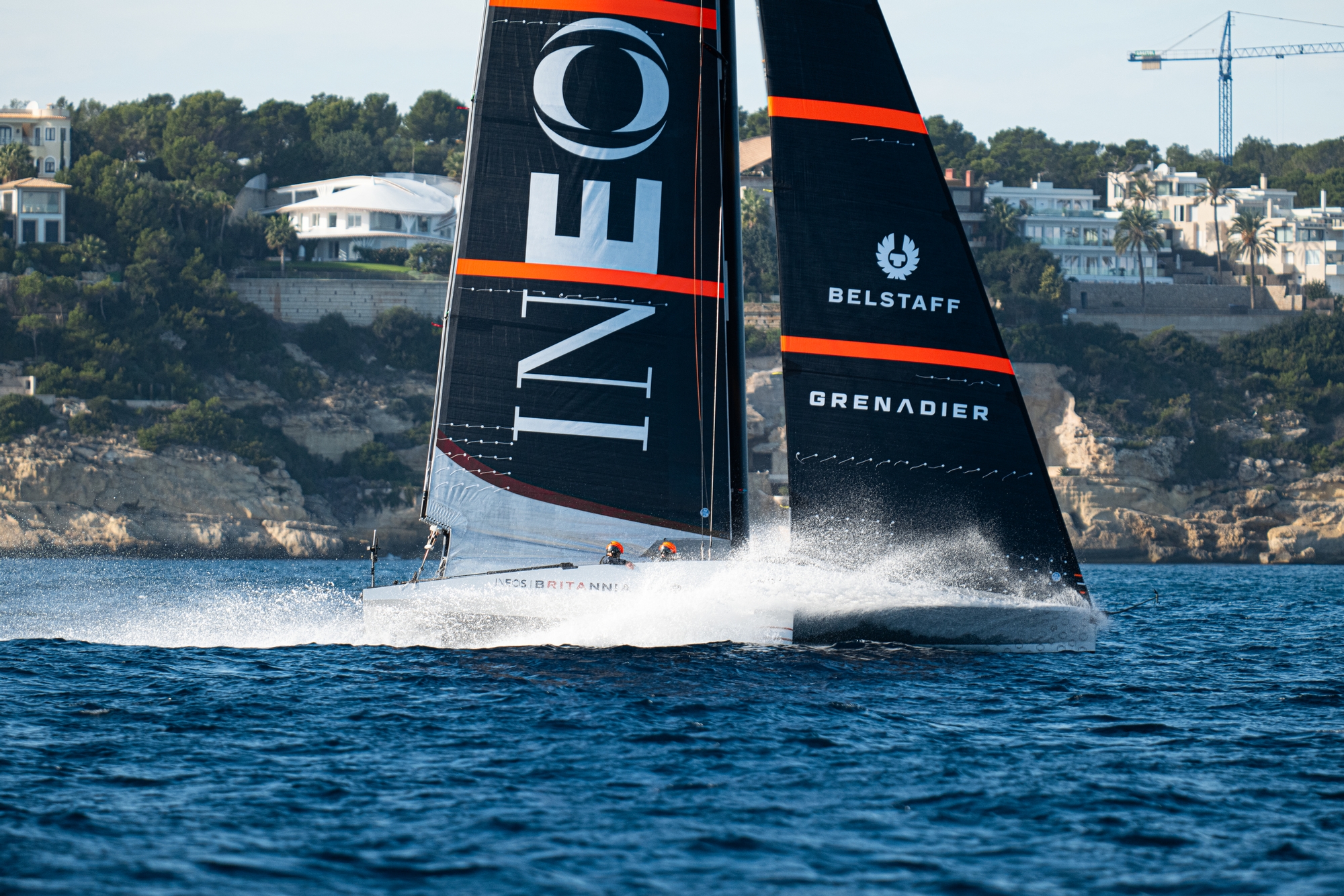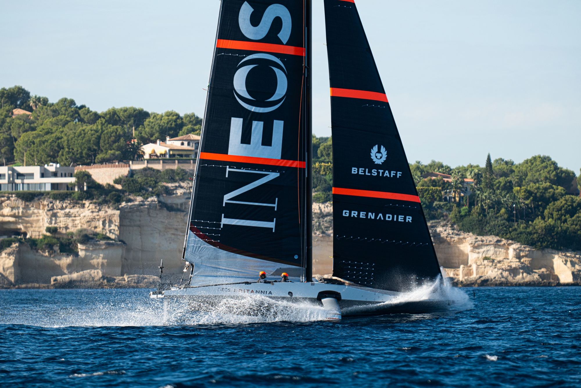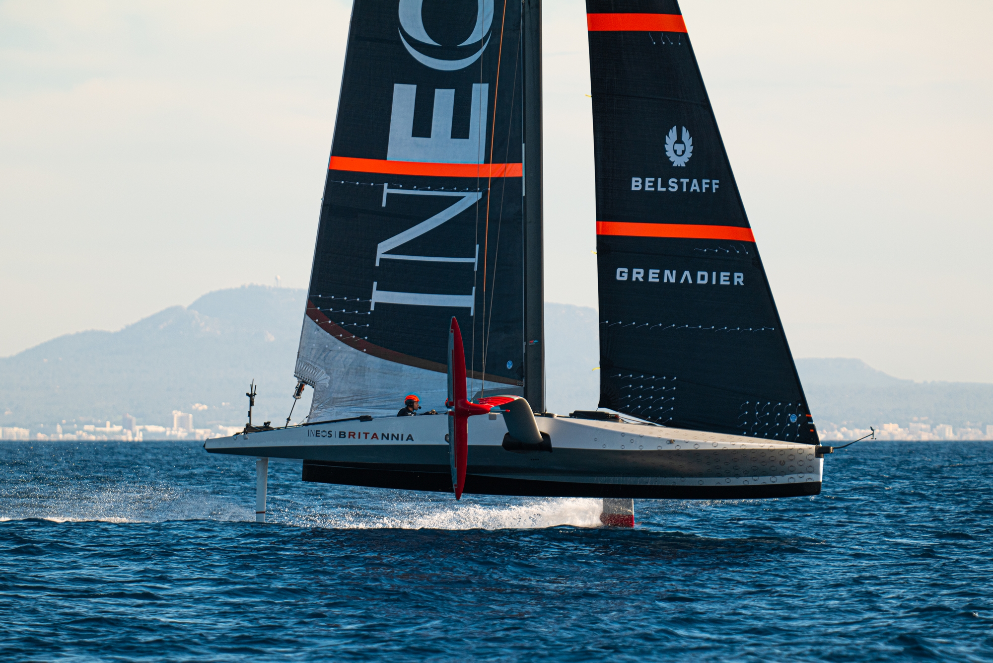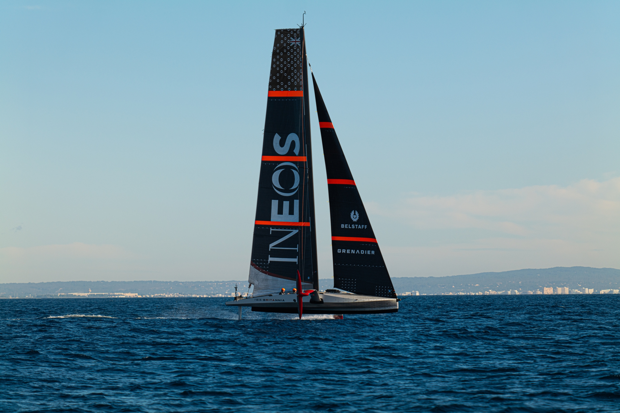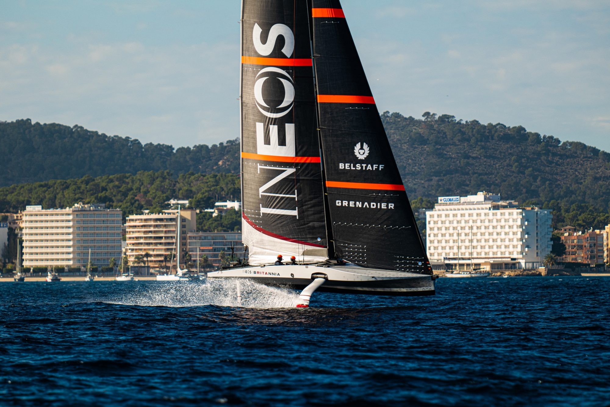 On-Water Recon Unit Notes: Conditions in Palma, Mallorca for INEOS Britannia’s first proper day of sailing could not have been better today with sunny, warm, flat calm conditions early this morning as the British shore crew rigged and launched the boat and 8 - 12 knots of breeze and flat water in the afternoon when the five person crew of the team’s LEQ12, codenamed T6, sheeted on with purpose to quickly accelerate and lift her hull clear of the water for the first time without outside assistance.