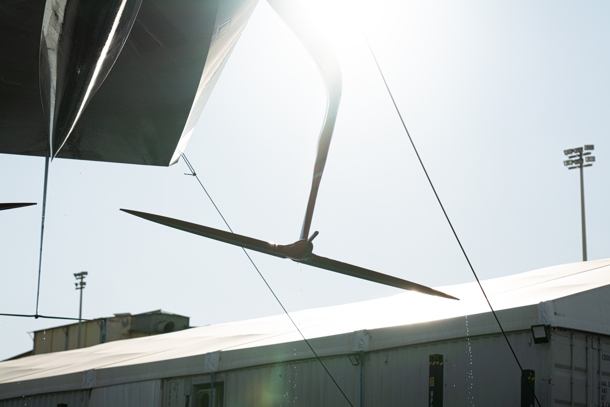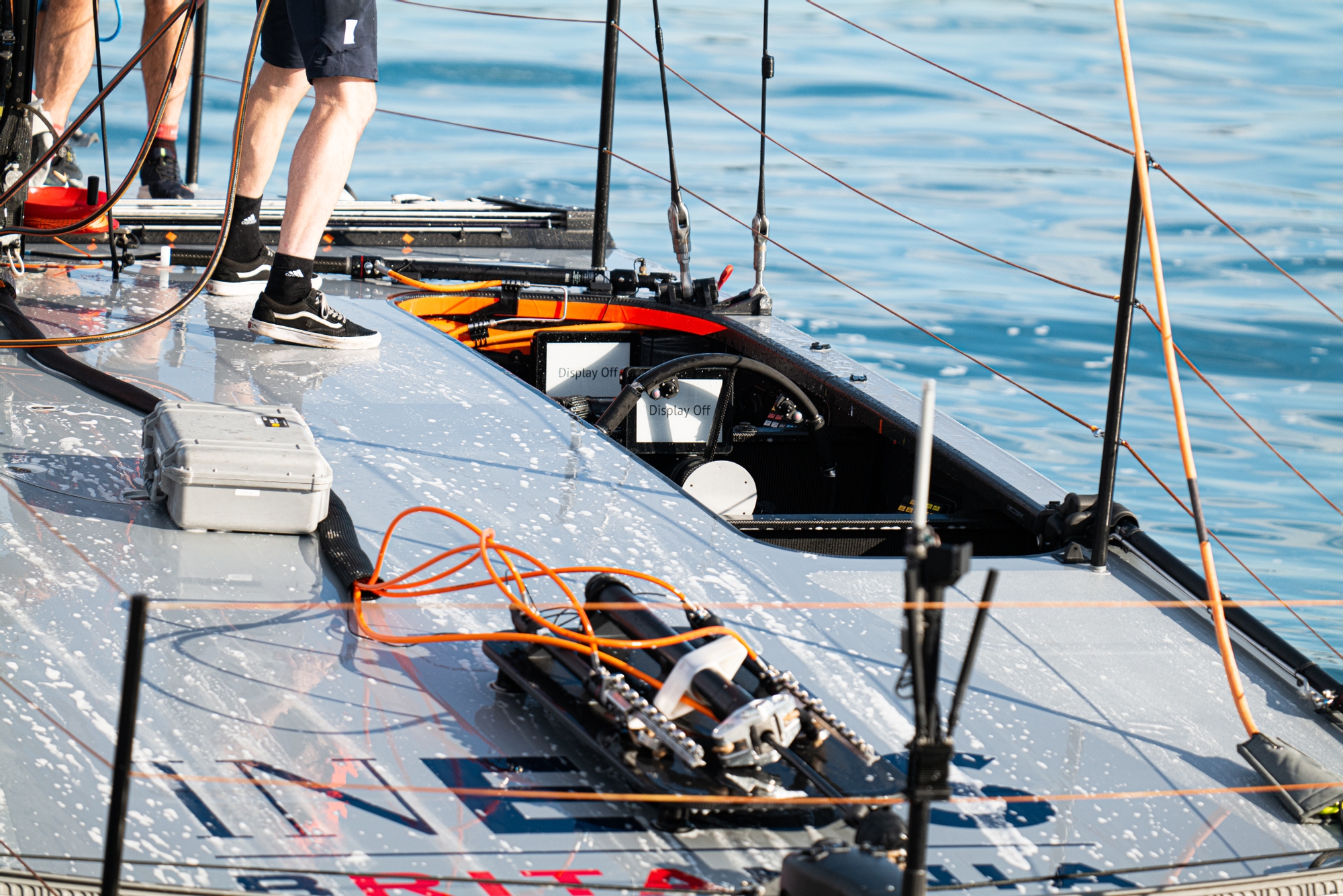 Some interesting technology and thinking was being deployed today around the clew area with a rod positioned at a downward angle that ran from the mainsheet ram to around 5 feet forward into the foot of the boomless mainsail. This appears to be a key area for the teams and as we saw today on American Magic, even more radical solutions are being adopted to bring drive and control into this lower quarter area towards the clew. The T6 solution looked highly effective in promoting, inducing power as well as de-powering almost immediately post take-off.