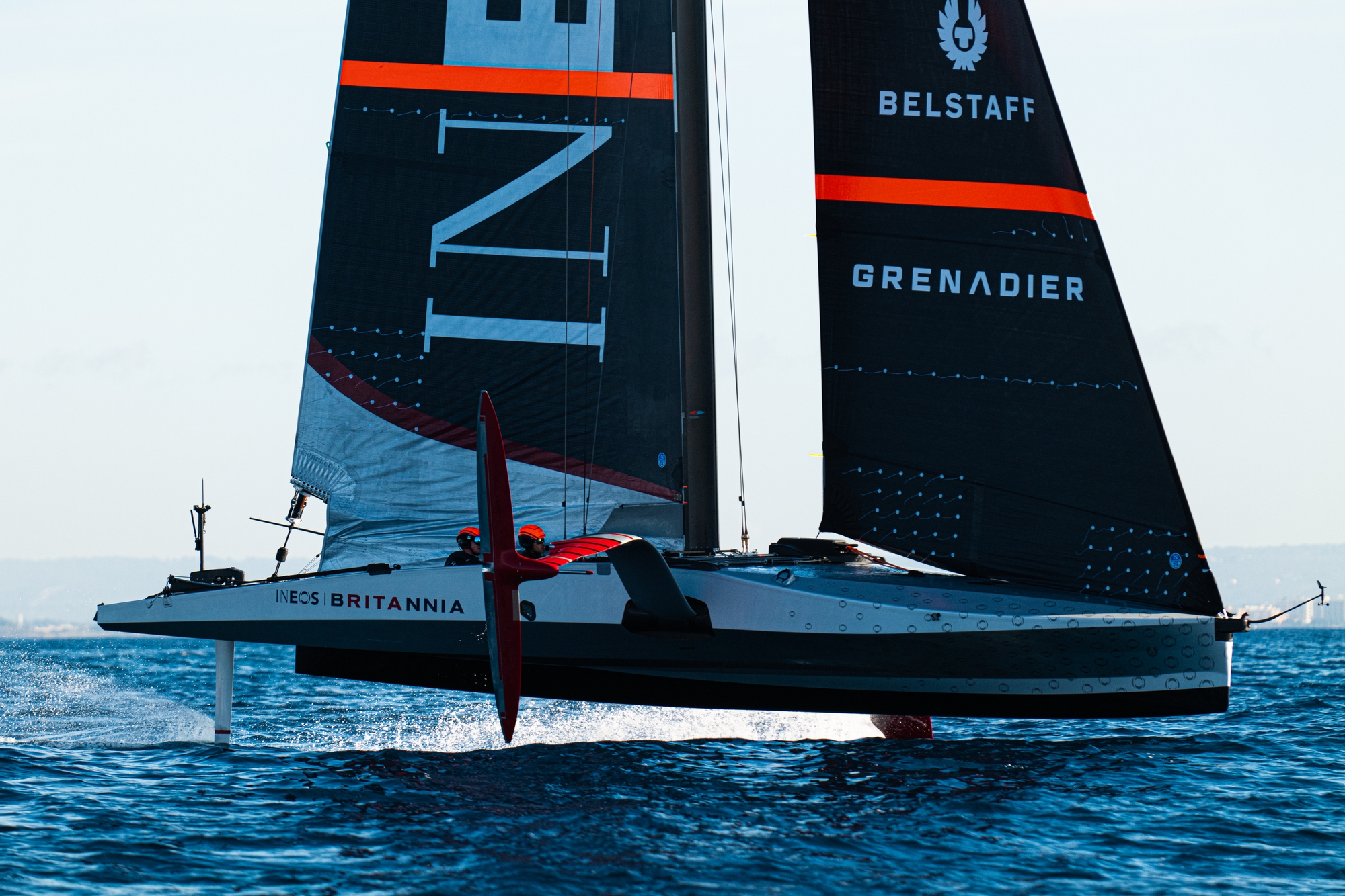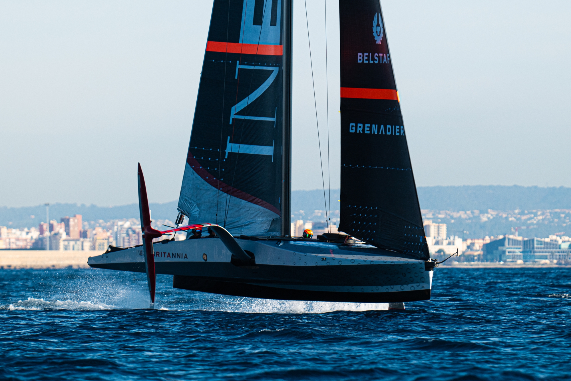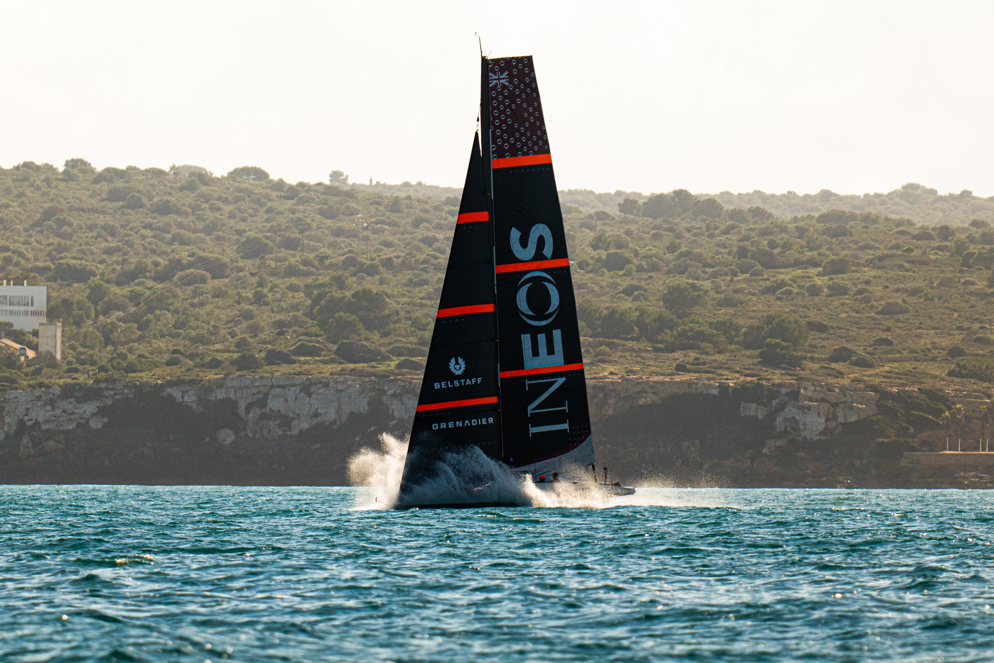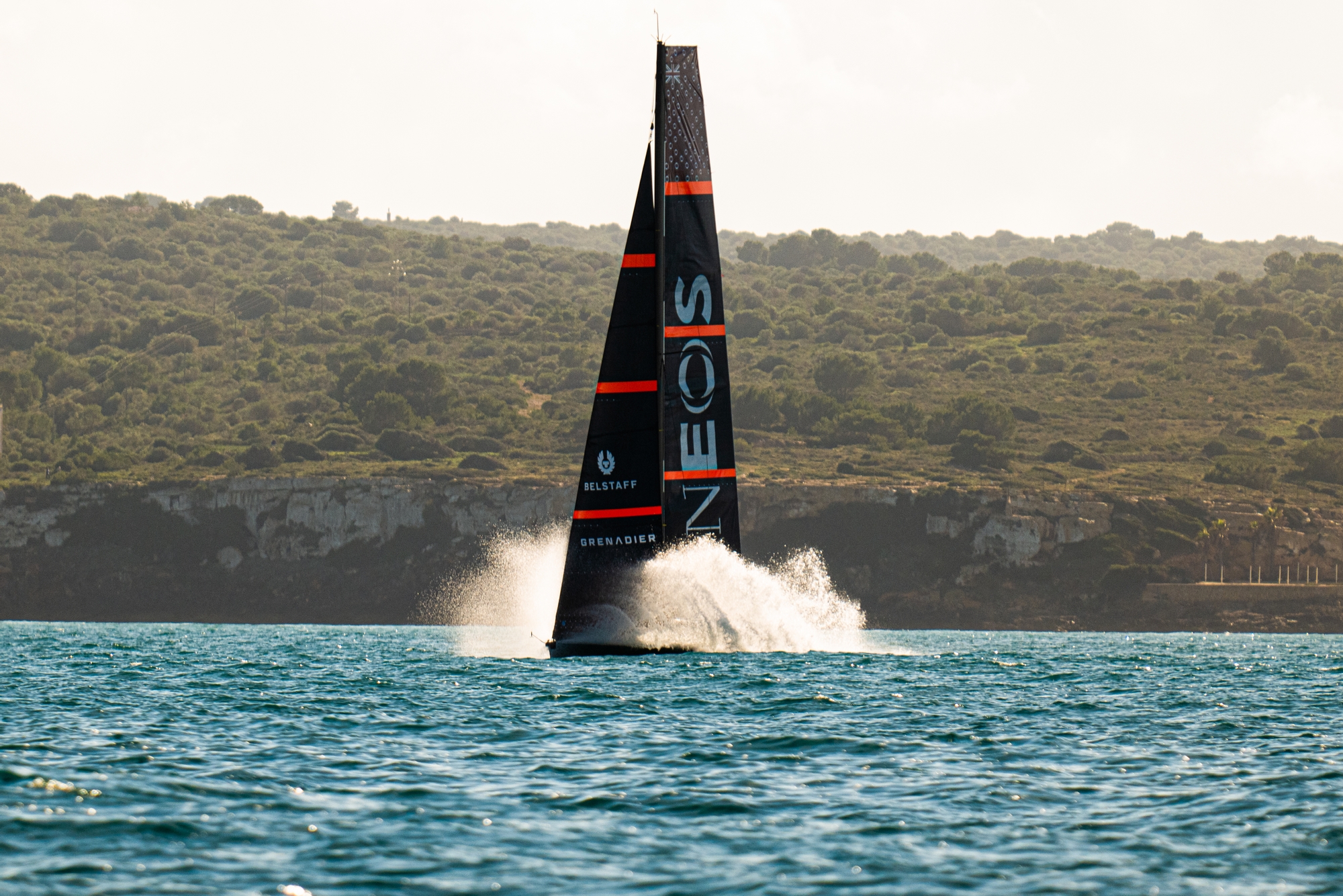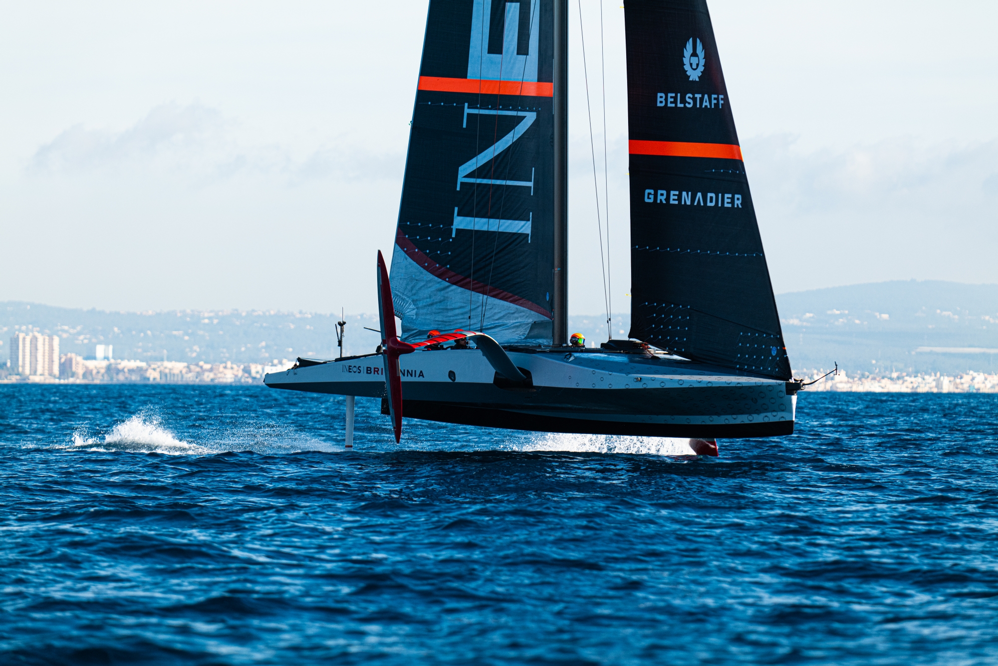 When INEOS Britannia decided to adopt the Bay of Palma as their winter training base, today was the kind of the day that everyone had pictured in their mind’s-eye. Sunny with barely a cloud in the sky, a solid 12-13 knots and Barcelona-type waves that could almost have been imported from the 37th America’s Cup venue. It was perfect, and the sailing team looked remarkably calm and collected for this thoroughly entertaining all-afternoon training session that had it all. Giles Scott and Ben Cornish once again shared the helming duties aided by Bleddyn Mon and Leigh MacMillan who had T6 flying with absolute ease, showcasing some terrific control across a full range of sea states.