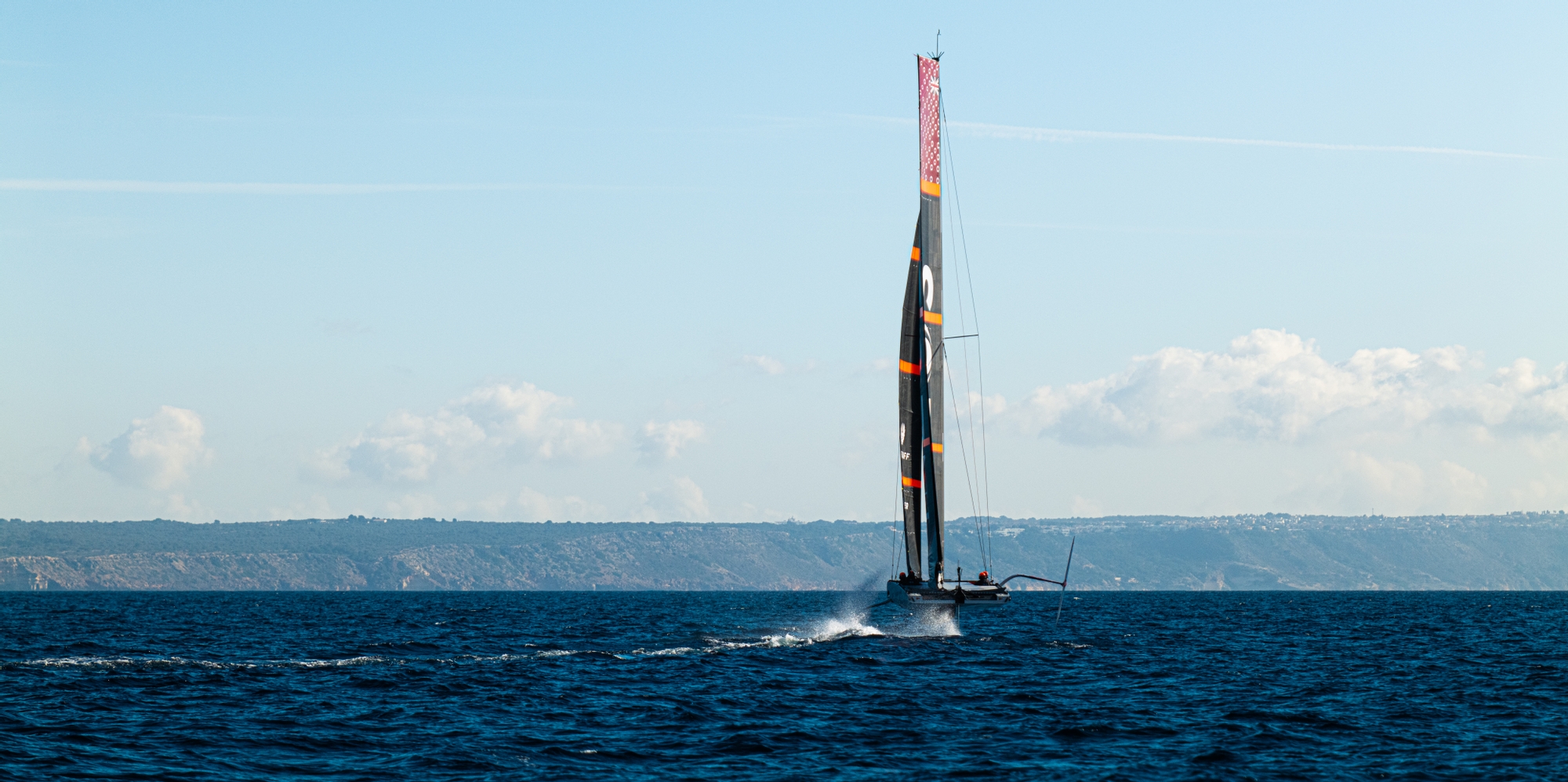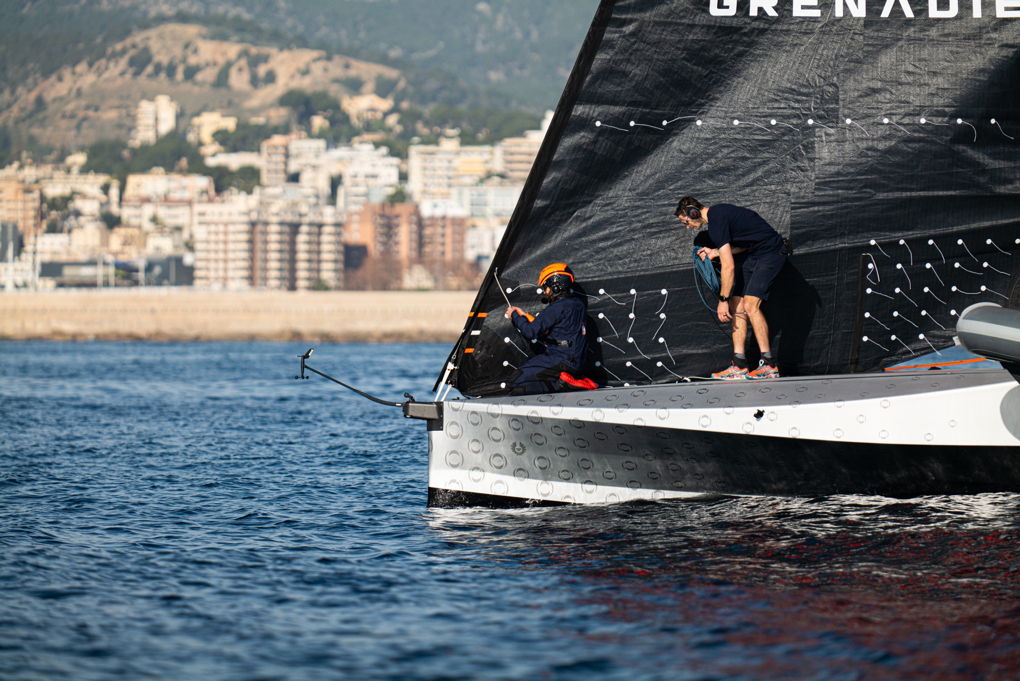 Outside the harbour the wind was similarly light, necessitating a slow side-tow out to the south in search of the slowly building southerly breeze. Once well offshore the breeze built quickly to a solid 12 - 13 knots, although – after just a couple of self-foiling runs in the west side of the Bay of Palma – the breeze became patchy and unstable in that area and the boat was towed on two foils all the way over to the east side of the Bay where the breeze had filled in properly from around 220 degrees.