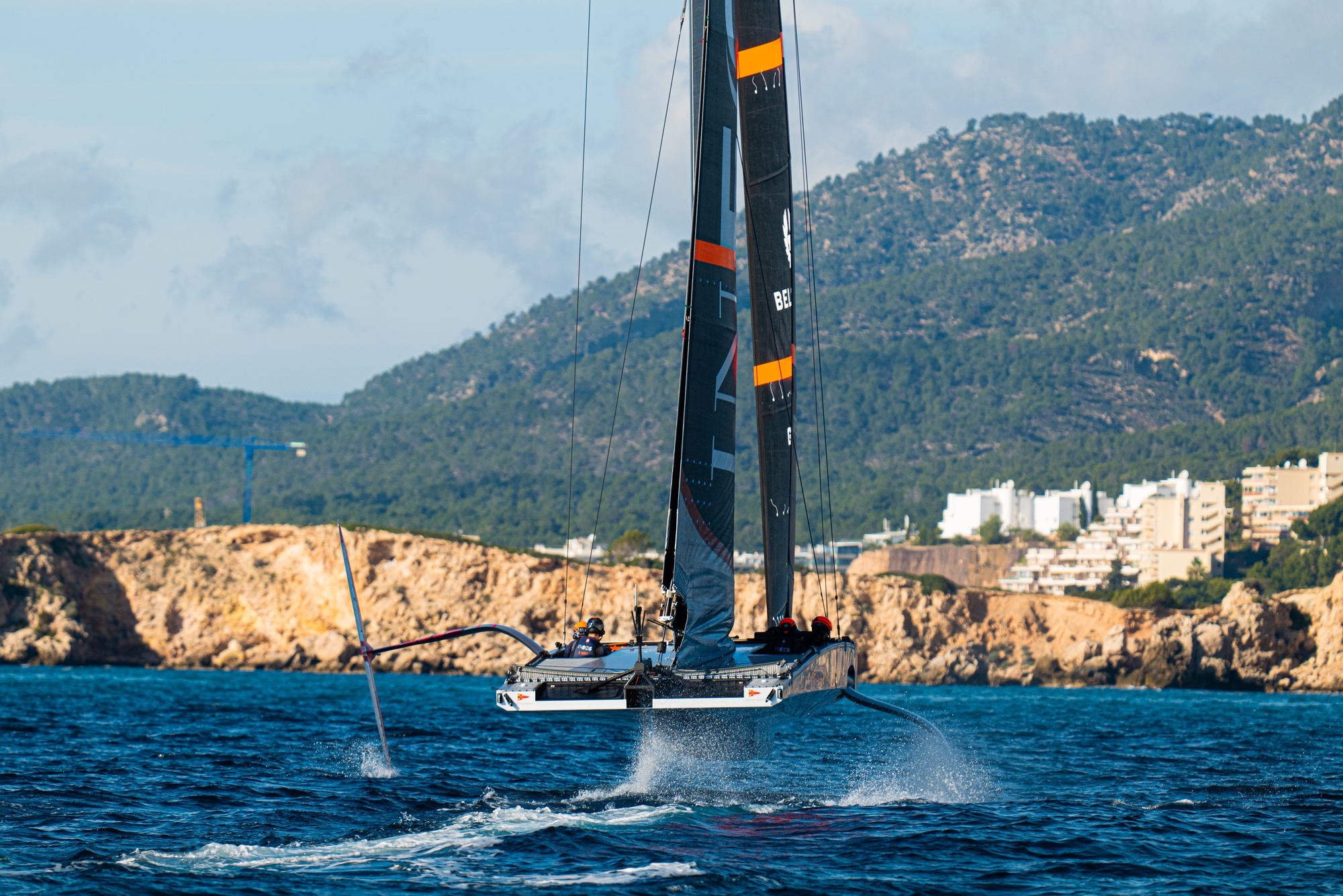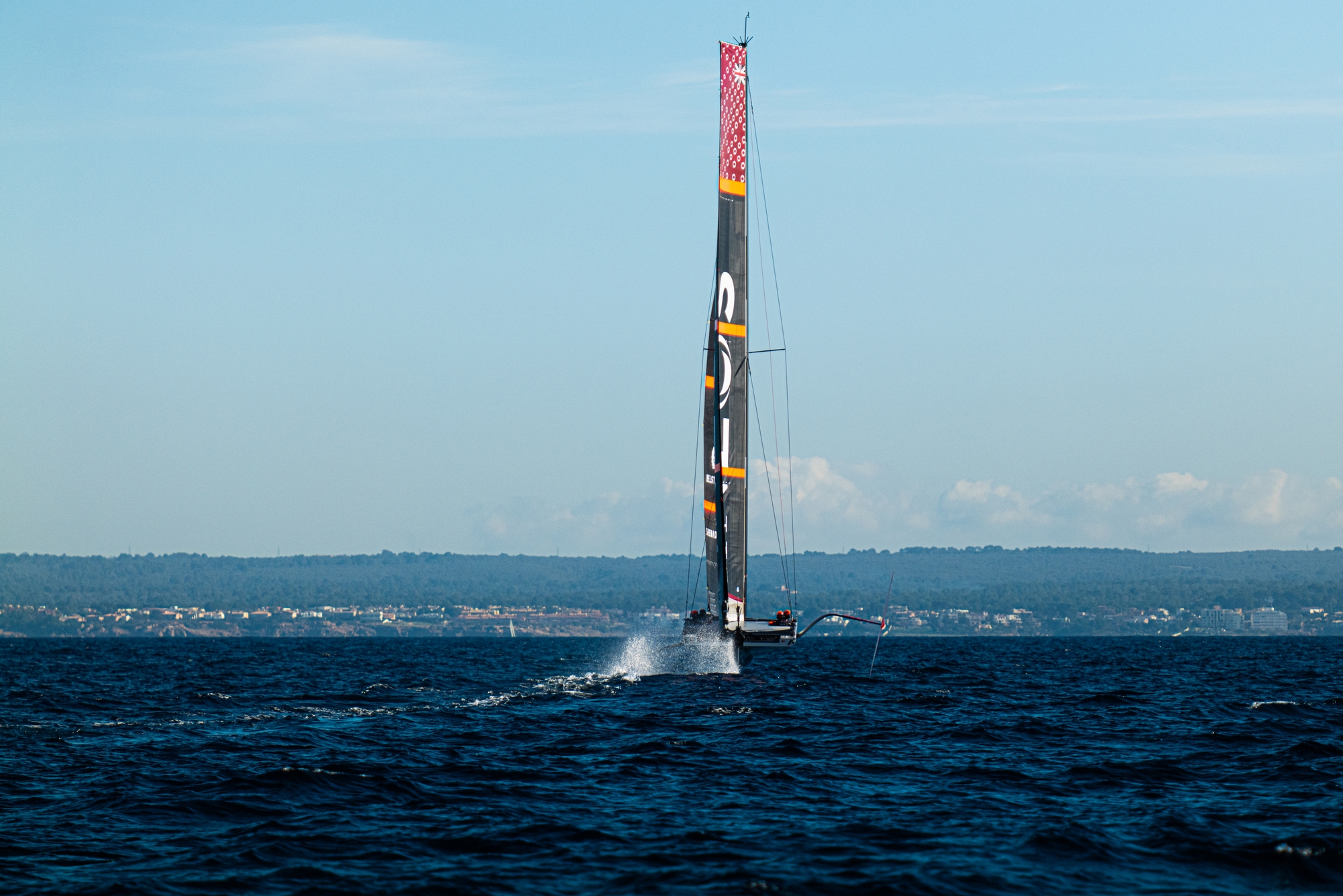 Once again, the same crew from the previous day – helmsmen Giles Scott and Ben Cornish, with trimmers/flight controllers Leigh McMillan and Bleddyn Mon – seemed comfortable to push the boat a little harder still. They racked up around 41 kilometres of sailing over the day, with multiple foiling runs that took them the length and the breadth of Palma Bay’s eastern section – including a spectacular fast fly-by of a fleet of Laser sailors out on a mid-bay training session.