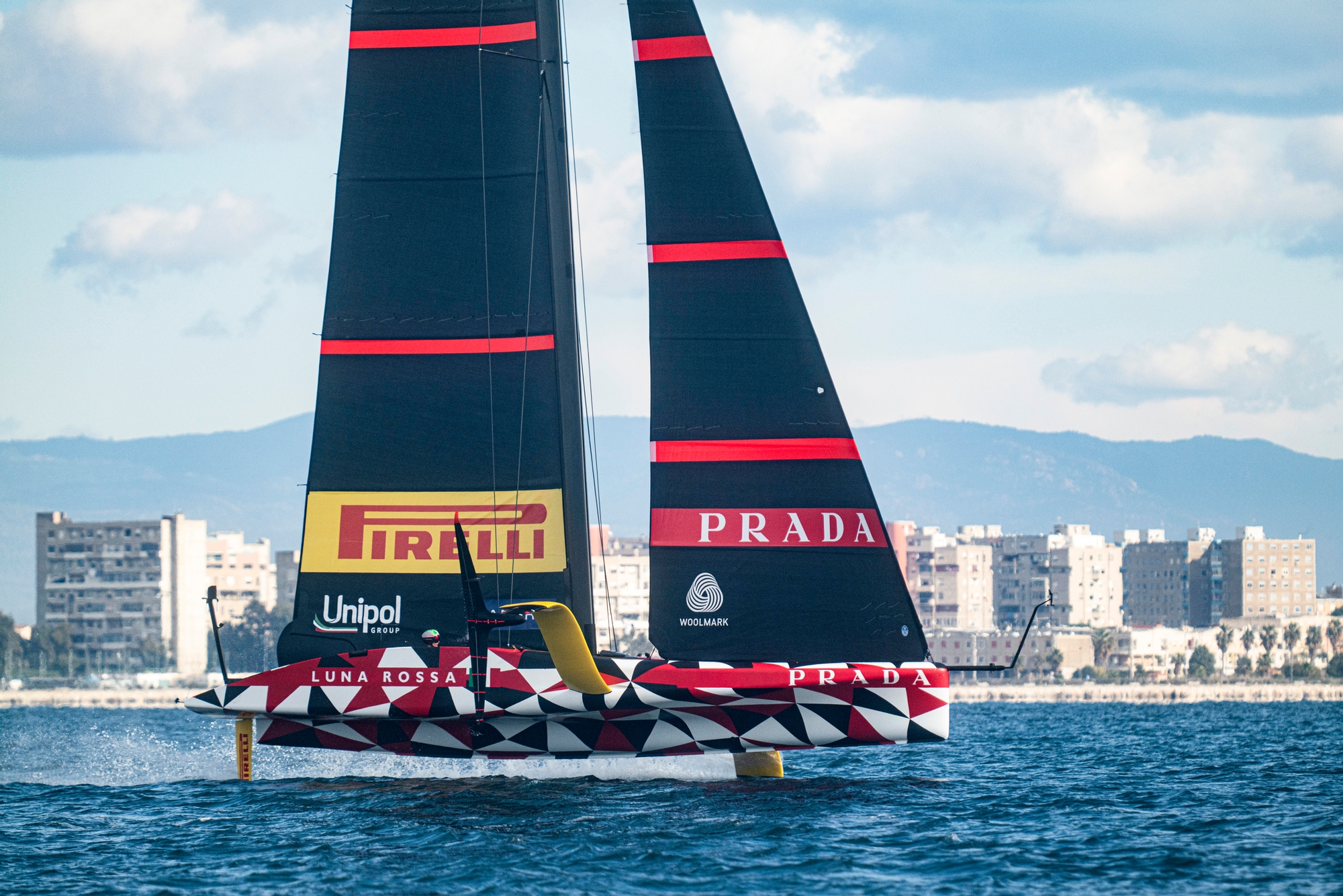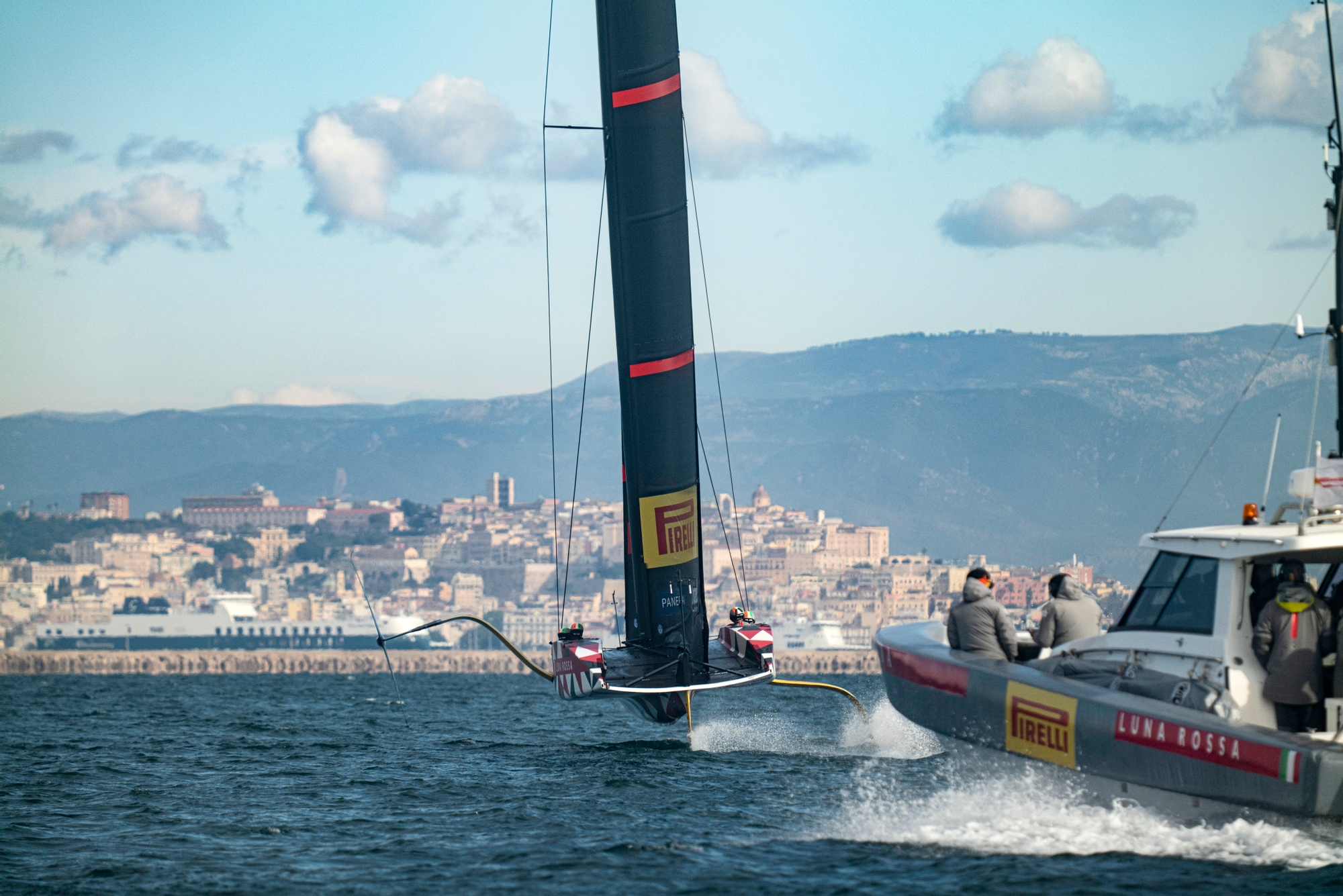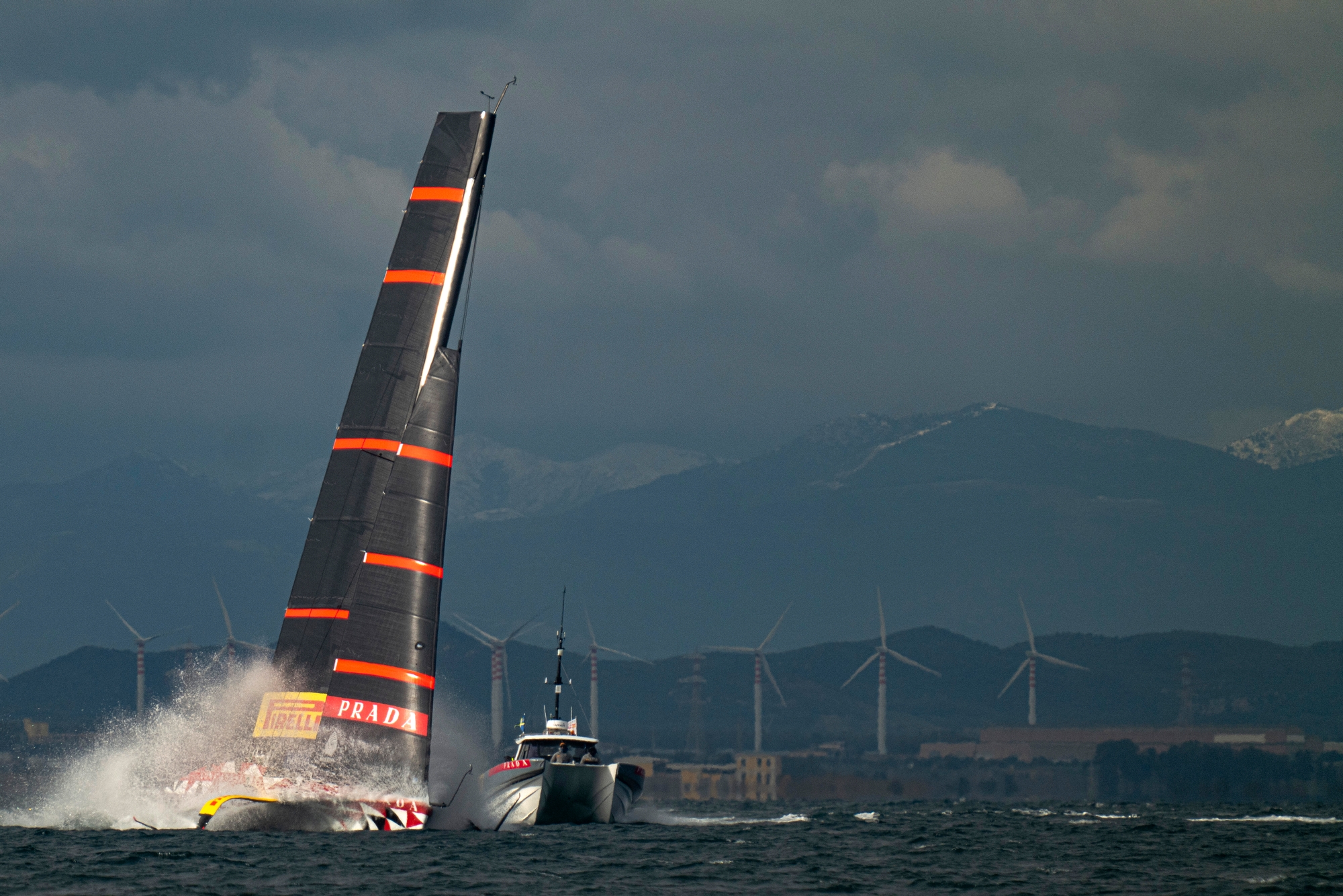 On Water Recon Unit Notes: After five days of seeking of good sailing conditions between stormy and very windy days, the Luna Rossa Prada Pirelli team finally finds an acceptable window with steady NW breeze and remaining south-westerly sea state on an unusual very cold and frosty day in Cagliari.