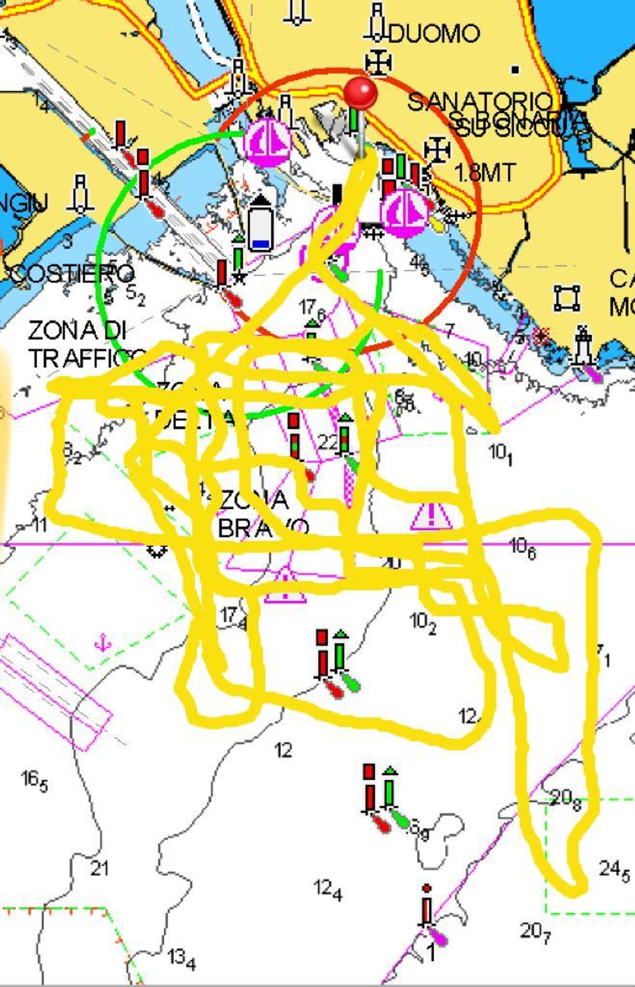 Starting the day at 8:30 the Italian LEQ12 rolled out with some of the previously seen GoPro setup on suction and pressure sides of the starboard wing facing foil arm stock and flaps where some attached strips, in addition to the already seen red marked lines on suction side outboard this time, have been observed. It remains to be clarified what exactly is to be monitored, perhaps any occurrence of ventilation, cavitation or simply the flow streamlines for any separation.