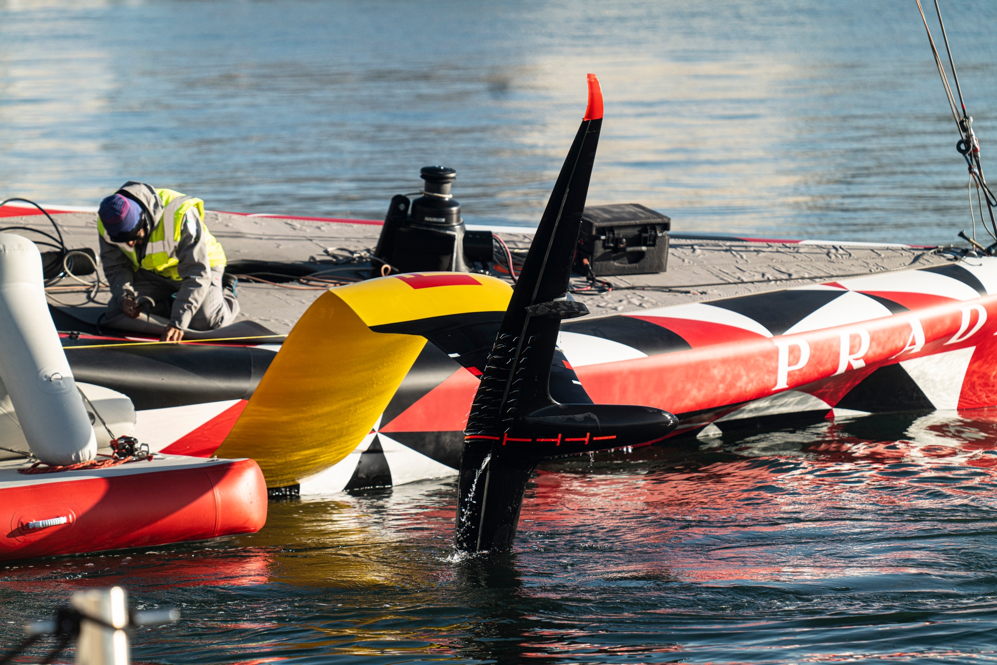 In a session that lasted just over three and a half hours, the Italian flight control appeared so spot-on to be almost perfect and with the new starboard anhedral foil being wired up with the now ubiquitous GoPro cameras and flow strips, aquatic tell-tales almost, it was expected that the team would spend a long time on the starboard foil. The recon unit however noted long runs on the port foil but overall, the day would have produced valuable data on both sides for the design team shoreside.