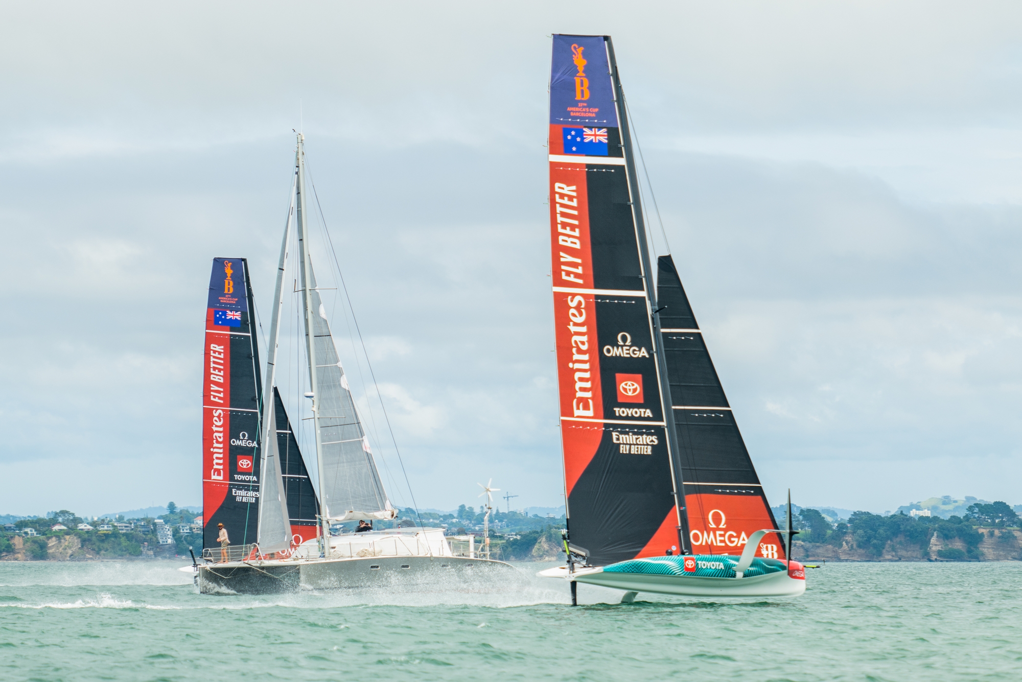 After some pretty horrendous, almost biblical, weather in Auckland over the weekend that made national news around the world, thankfully the rains passed and what was left over was a near-perfect 10-12 knot breeze in the ‘Back Paddock’ that had both boats at 40+ knots at times and within a few laps, the natural Kiwi tendency to race and throw tactics at each other was too tempting for the helms. Lee-bow tacks, VMG gybing downwind, rapier-fast roundings and bear-aways – it was as though the America’s Cup had started already.