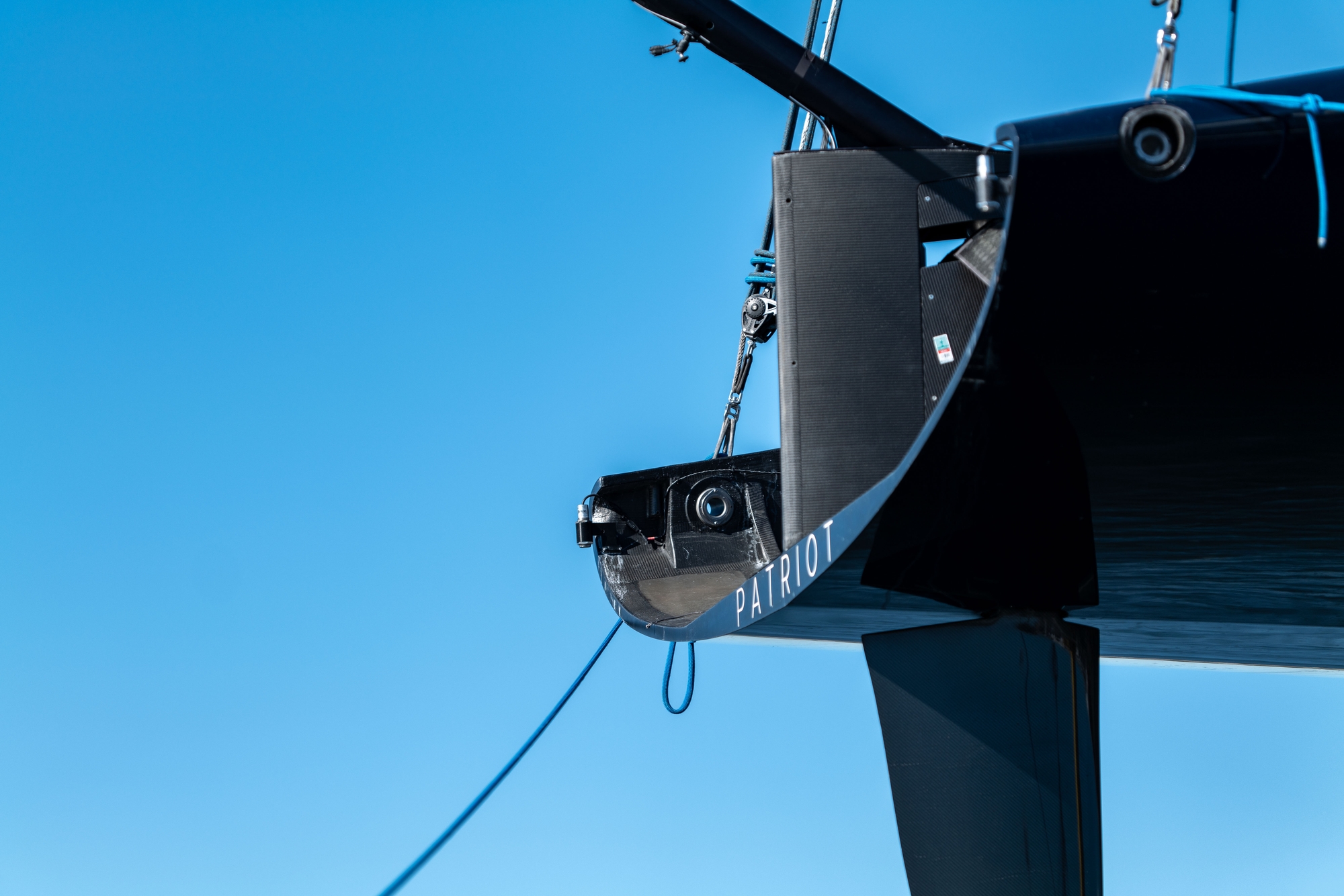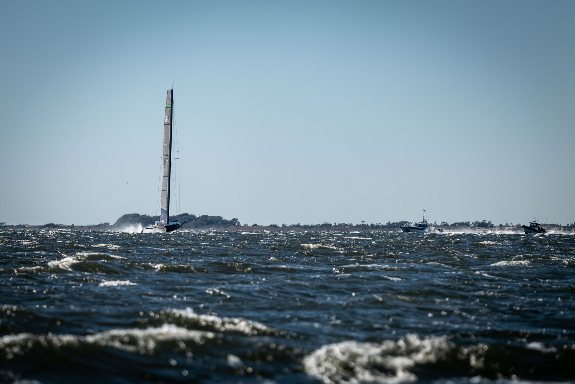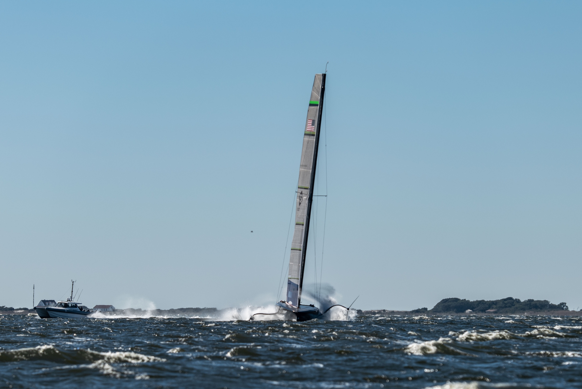 On-Water Recon Unit Notes: Patriot sailed inshore today, covered approximately 57 nm, comprised of 14 W/L legs. Three headsails were loaded into the support RIB, 1 was used. Sailing began at 12:11, completed 34 manoeuvres and ended sailing at 14:40. Patriot had a total flying time of 76 Minutes. Top speeds were approximately 42k upwind (measured by GPS aboard RIB) and 50k downwind (according to interview). Patriot started the day by getting a tow to the south end of the bay to have an upwind start in top end wind conditions. The yacht looked stable for the majority of the day with only a couple of unplanned touch downs. The bear-aways and harden ups looked a bit nervous. The day consisted mainly of short foiling runs with a fewer than average number of manoeuvres, with five-to-fifteen-minute breaks/meetings in between foiling sessions. Frequent adjustments were made inside the mainsail skins in the leech/foot area.