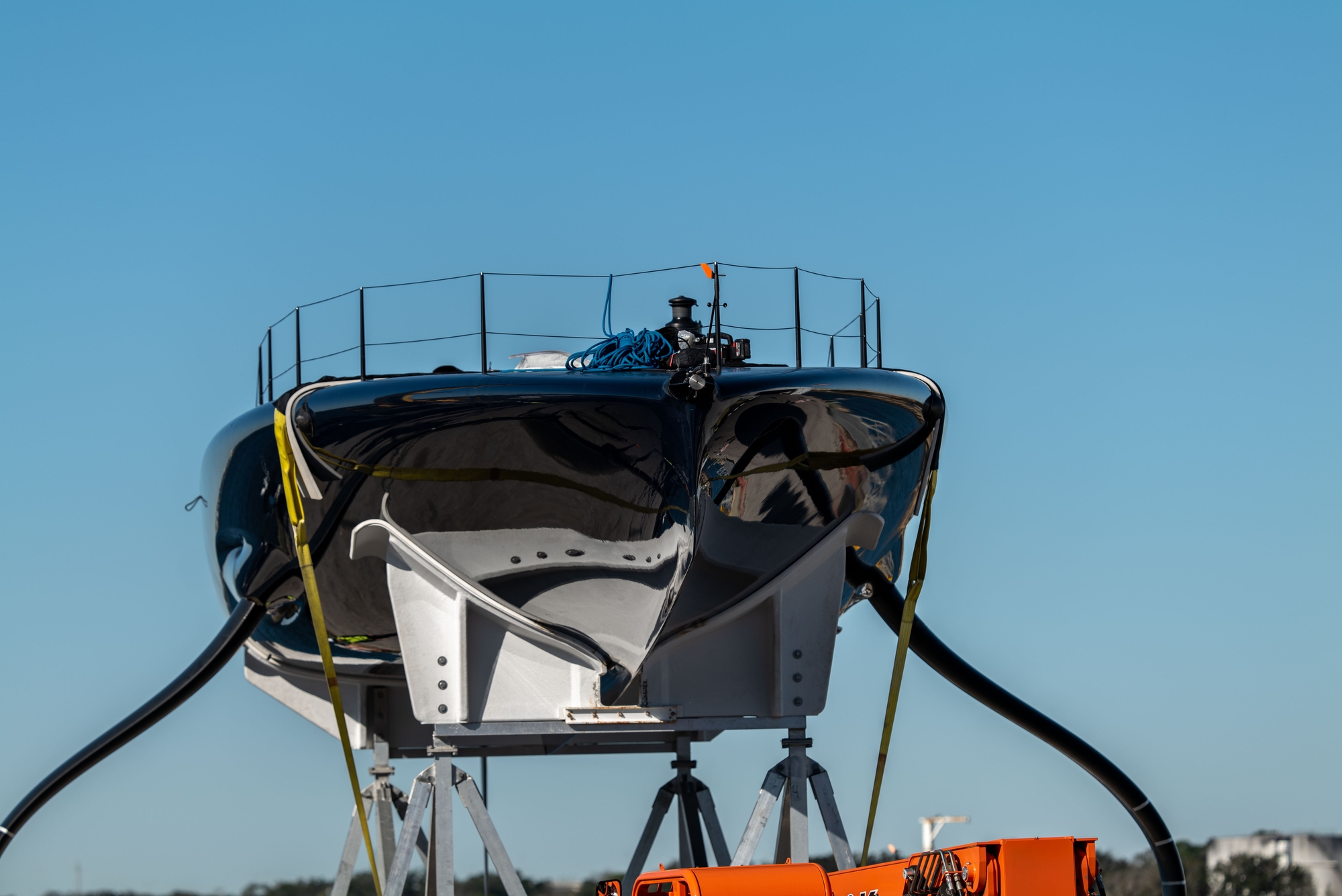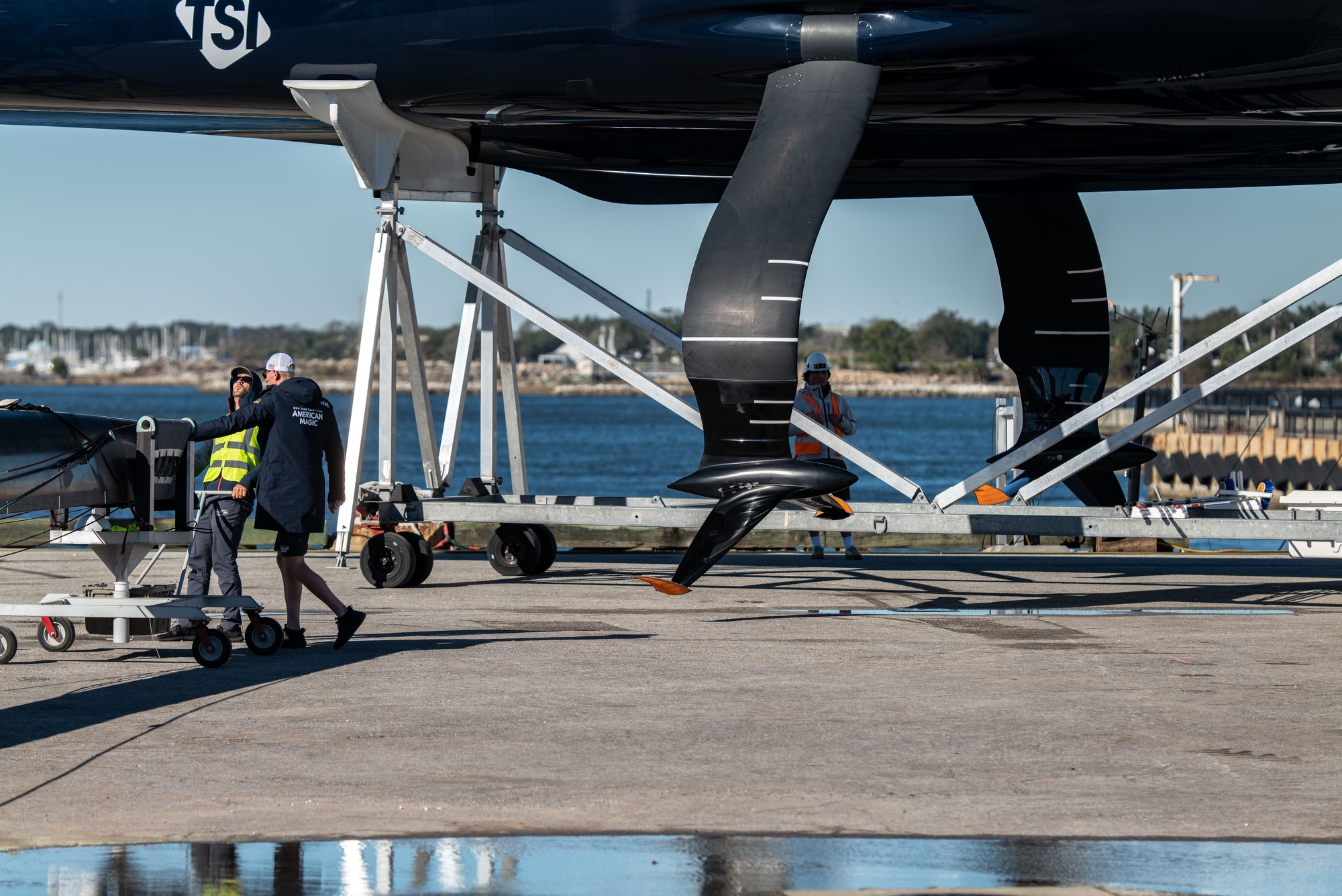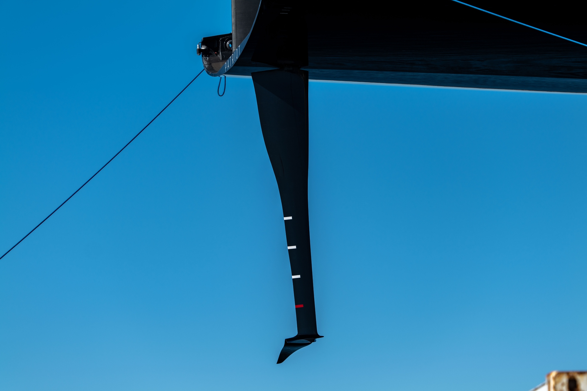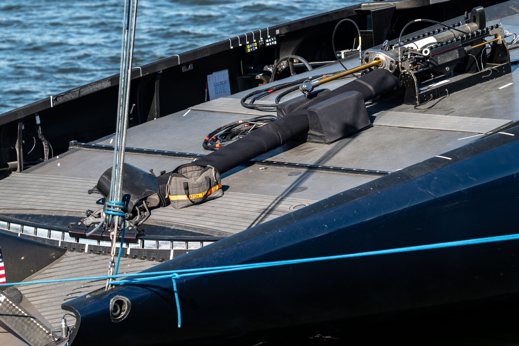 On-Water Recon Unit Notes: Patriot sailed inshore today, covered approximately 57 nm, comprised of 14 W/L legs. Three headsails were loaded into the support RIB, 1 was used. Sailing began at 12:11, completed 34 manoeuvres and ended sailing at 14:40. Patriot had a total flying time of 76 Minutes. Top speeds were approximately 42k upwind (measured by GPS aboard RIB) and 50k downwind (according to interview). Patriot started the day by getting a tow to the south end of the bay to have an upwind start in top end wind conditions. The yacht looked stable for the majority of the day with only a couple of unplanned touch downs. The bear-aways and harden ups looked a bit nervous. The day consisted mainly of short foiling runs with a fewer than average number of manoeuvres, with five-to-fifteen-minute breaks/meetings in between foiling sessions. Frequent adjustments were made inside the mainsail skins in the leech/foot area.