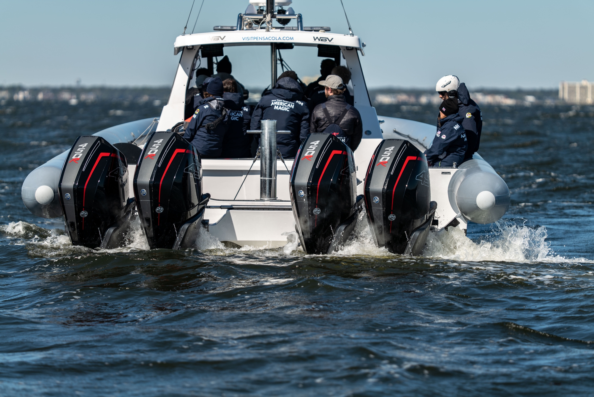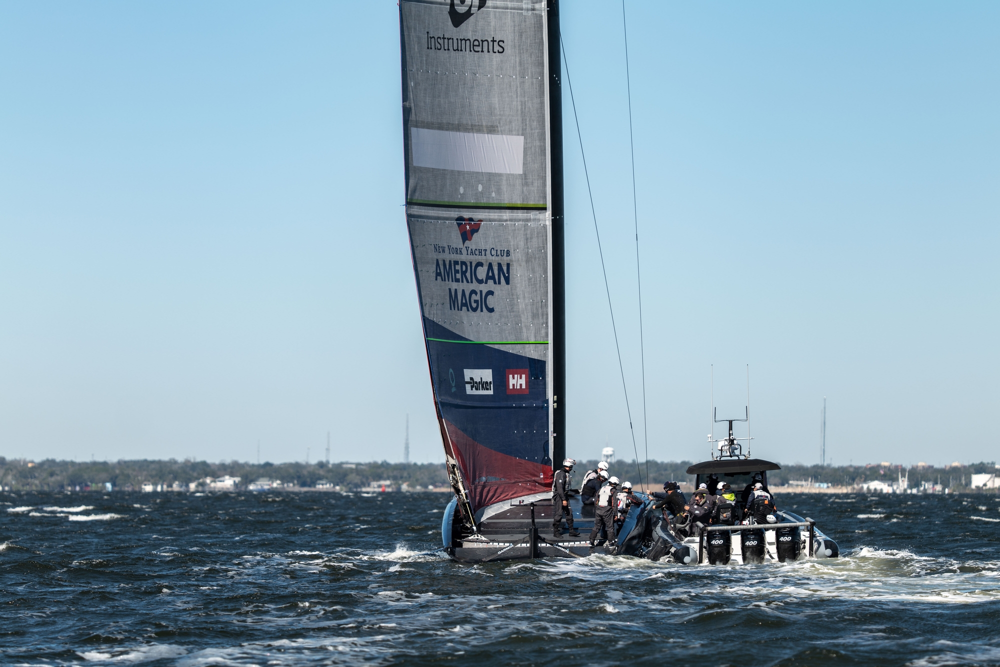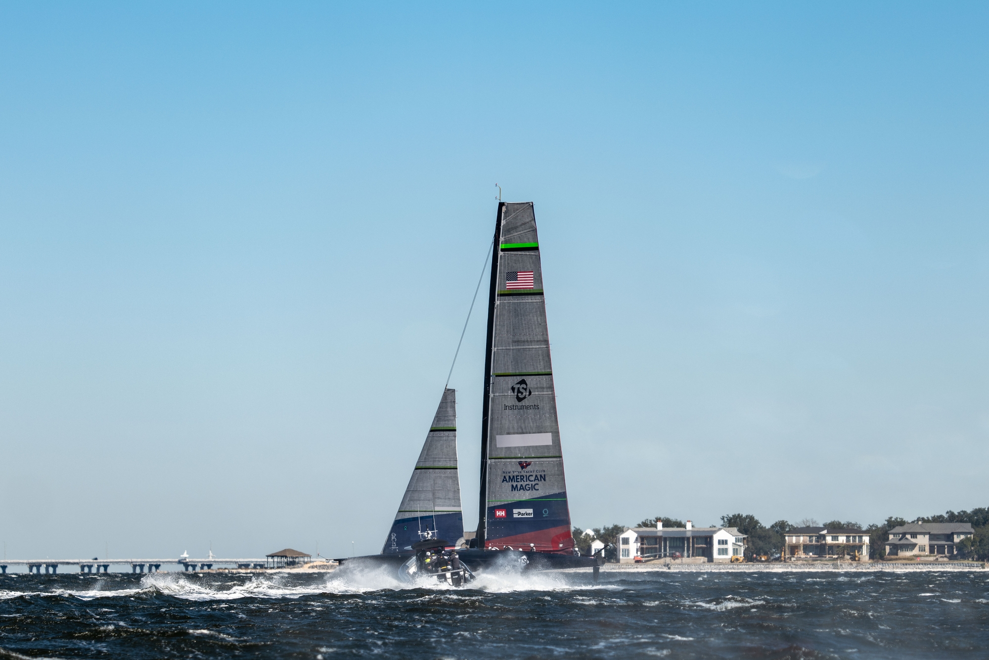 It was full-on in Pensacola on Friday as the New York Yacht Club American Magic team put the pedal to the floor in 24 knots of angry Bay breeze and let Patriot rip hitting speeds over 50 knots at times. Colten Hall, one of the new breed of cyclor athletes hired in to the team, summed it up with youthful enthusiasm saying: “It was kind of funny we kept looking down and seeing 50 knots consistently so it was wild to be on that yeah it was just so fast and we just had our heads down fully grinding… it was definitely pretty chunky out there I mean definitely top end range for our part in the power group and we were definitely fully torqued. It was definitely a good one out there, good rip for the boys and a lot of fun.”