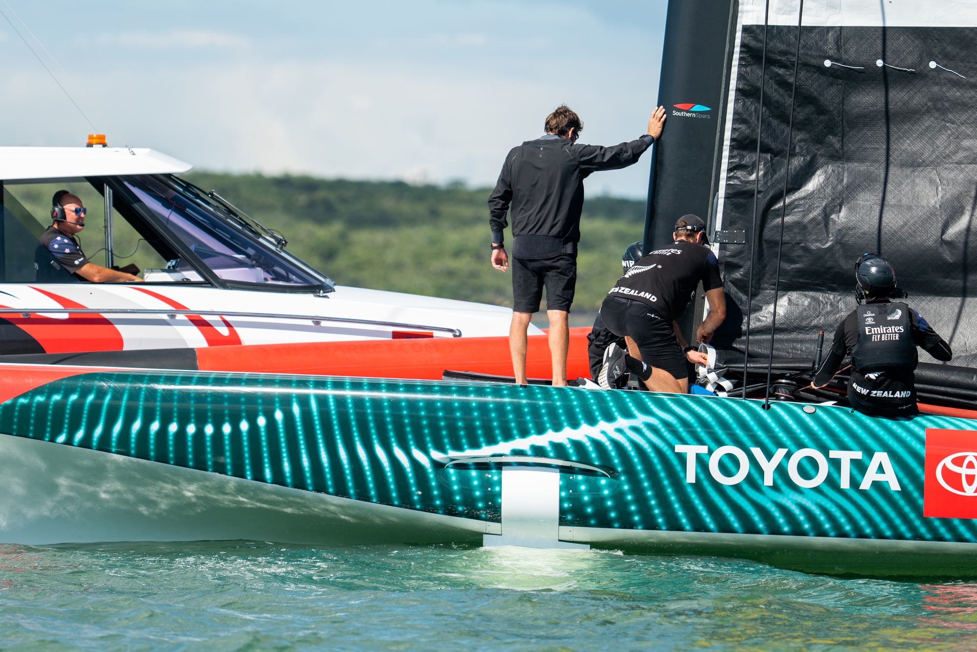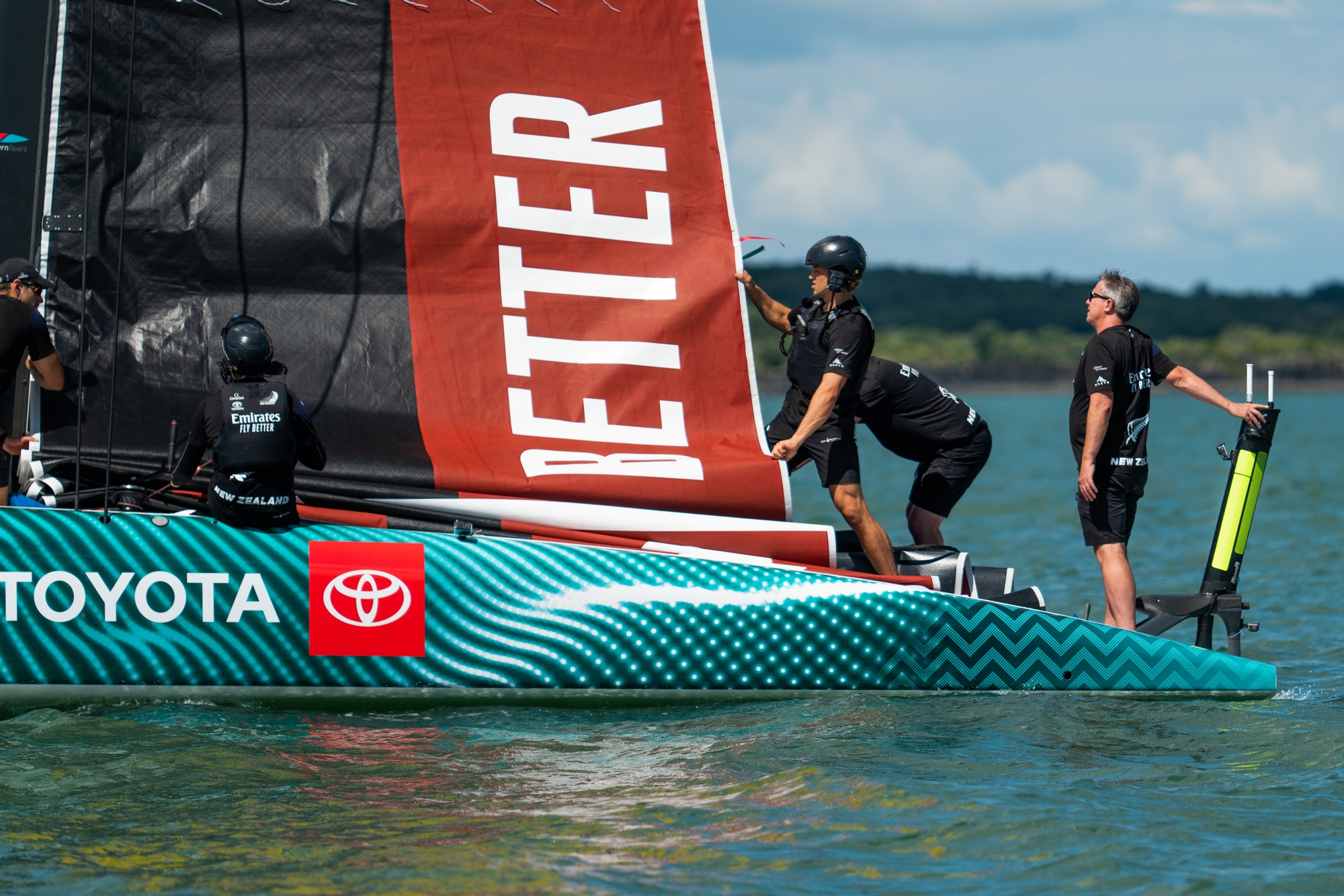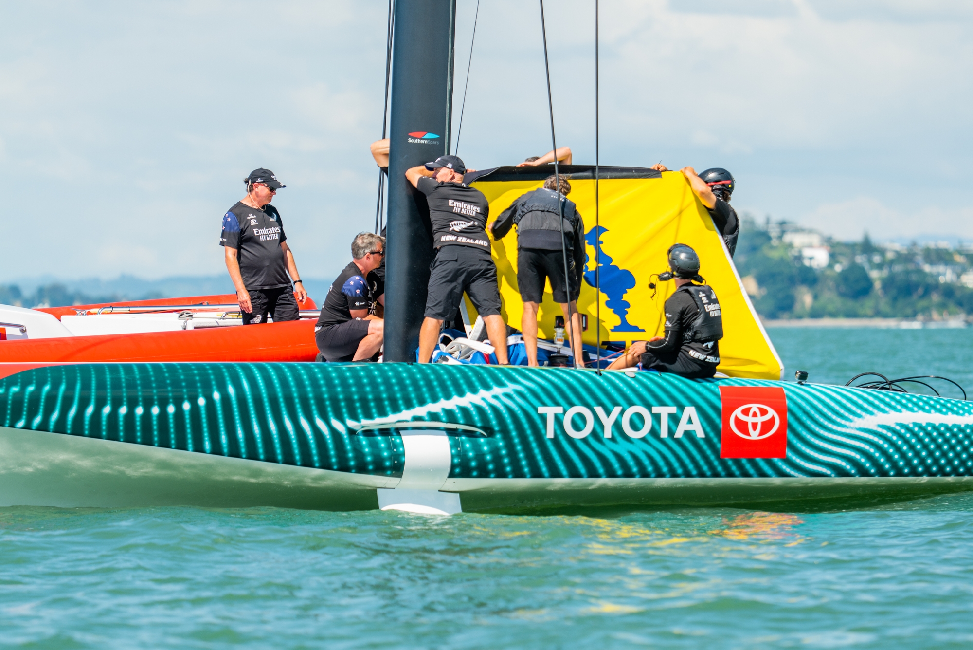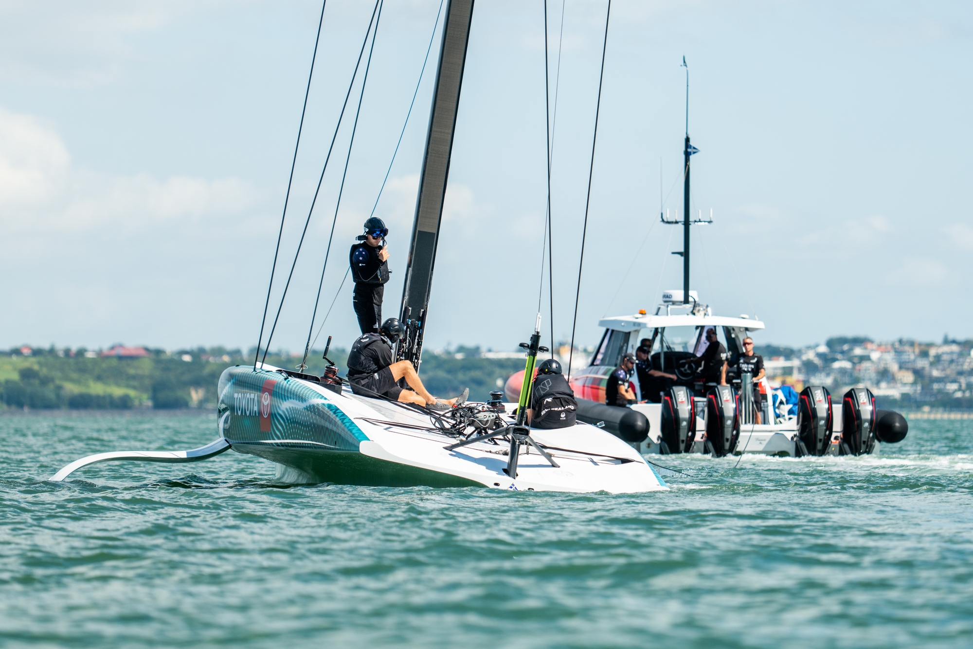 Curly Salthouse, the legendary Kiwi head of on-water operations who is now in his tenth America’s Cup campaign summed up the short afternoon session accurately saying: “We waited for the breeze, sort of a typical sea-breeze day here in Auckland…and left the dock about 2.30pm something like that, unfortunately on one of the boats we've made a little change to the sail configuration, and we’ve done some damage to some battening, something that we couldn't really replace and keep going on the water. So, one boat’s back in early and we’ll lift that out and fix it for tomorrow, that's not a big job, but it's just something we’re trying…and it wasn’t up to the task, we’ll rectify that and go again.”