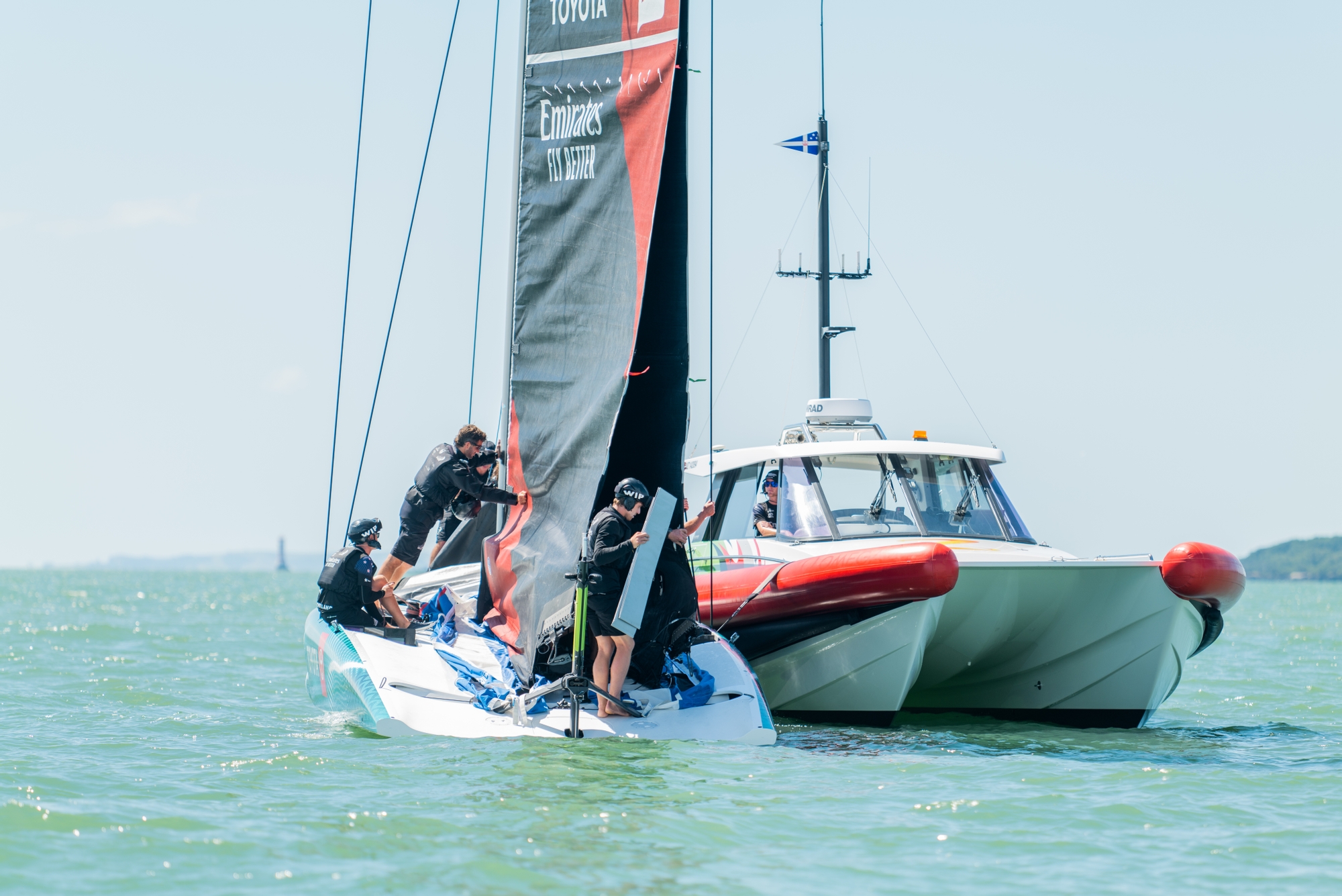 For the LEQ it took about 21 minutes to hoist her sails. She was off the chase boat and sailing at 15.13, upwind on starboard to begin with. The yacht tacked off Cheltenham, laying for about Saltworks on the Rangitoto shore, everything looked as normal until she tacked back onto starboard looking to line up with the AC40. A large wrinkle was noticed down the luff of the mainsail on its port skin. The LEQ12 tacked, sailed for another 2 minutes on port then slowly steered head to wind and dropped sails. As the sails were being lowered ‘Chase 2’ came alongside ‘Chase 1’ and some tech personel were exchanged then the LEQ12 was towed home to be craned out at 16.15