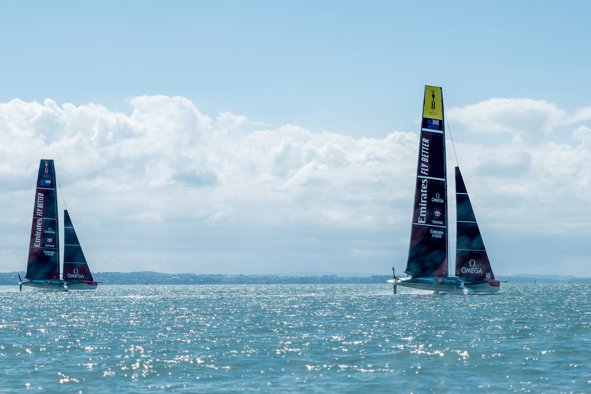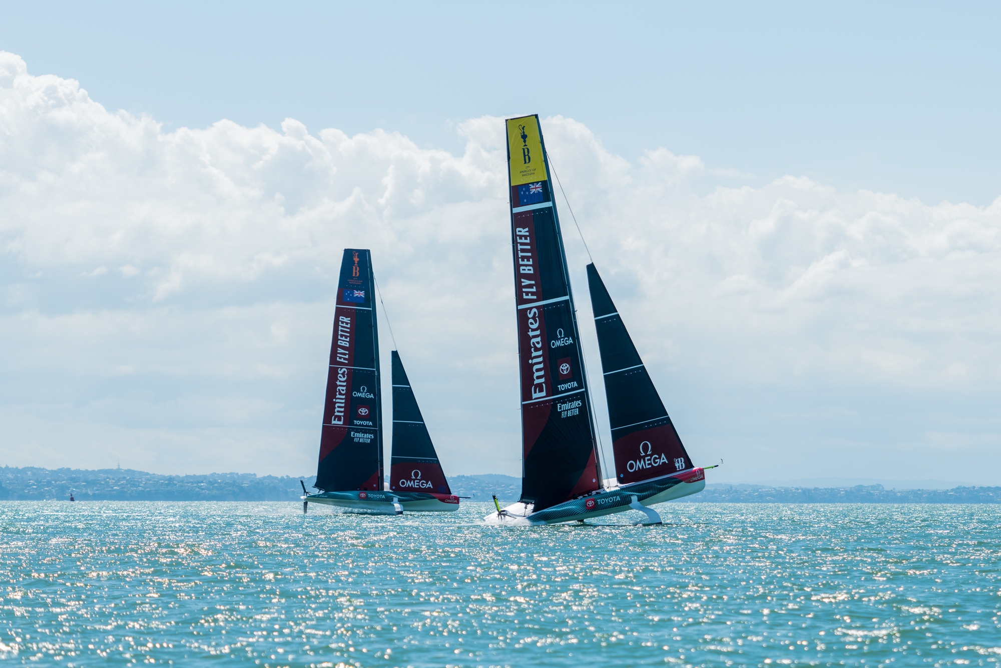 The defence of the America’s Cup is very much on with Emirates Team New Zealand taking to the crystal summer waters of the Hauraki Gulf today to line up the One-Design AC40 against its snarling sister, the LEQ12 in full teenage development mode.