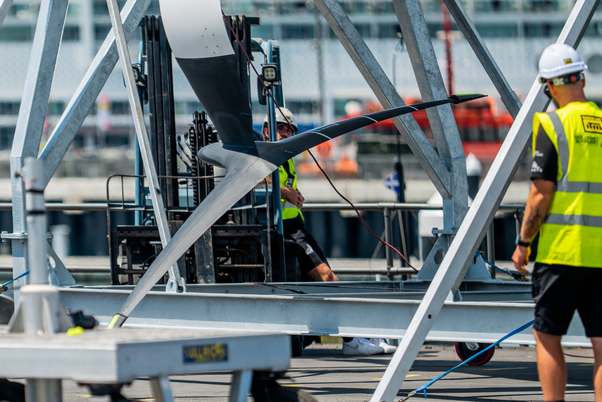 Compared to the AC40 it took a lot longer to hoist the main on the LEQ12 as it took six people about 10 minutes to load the headboards up the luff tracks. Again, close to full hoist there looked to be a lot of activity in between the main sail skins at both clew and tack ends.