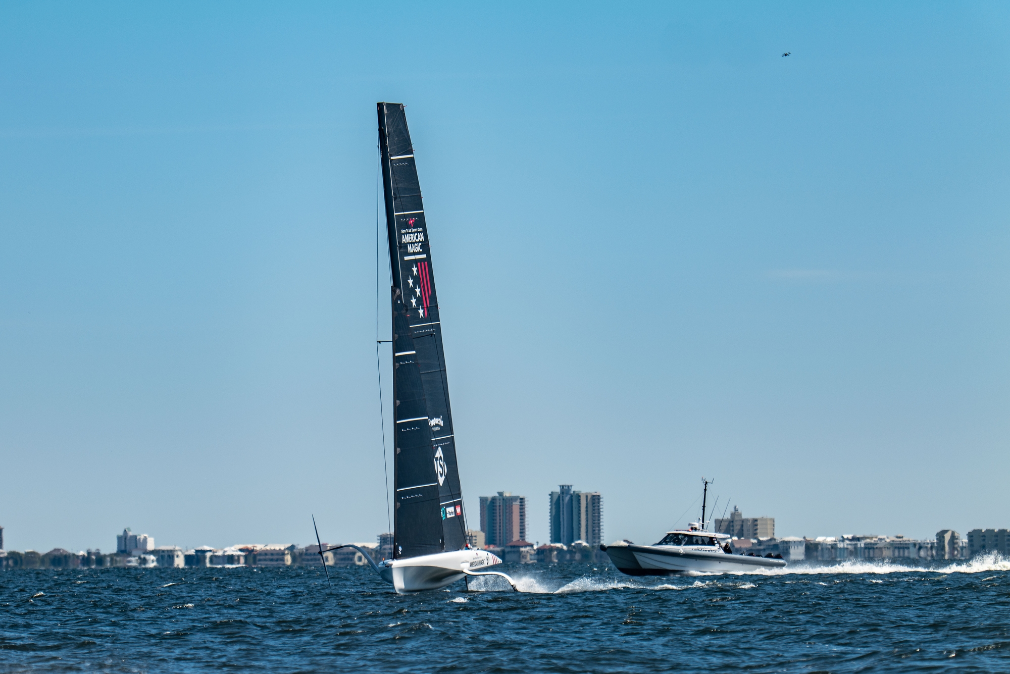 Having started the day with a long systems check as the team brought new, unseen tech into the mainsail control systems, the initial foiling blast was short and in the 10-15 knot breeze, the sailors looked a little uncomfortable (at times) with the J2 jib up. It’s a classic cross-over conundrum where the J2 should be the perfect call to get flying but once up, the trimmers would happily shred the sail and drop to a J3 in a heartbeat. No such luxury as a furling headsail on an AC40 unfortunately so once set, you’re in for the ride. What was very noticeable in the glorious Florida sunshine with the rays angled on the 3DL mainsail was the trim required to keep stable. America’s mainsail was in rapid-fire trim all the way up to the head with more than just the traveller and mainsheet at play – huge cunningham tension could be seen being applied and dispensed as the team kept control upwind through the gusts.