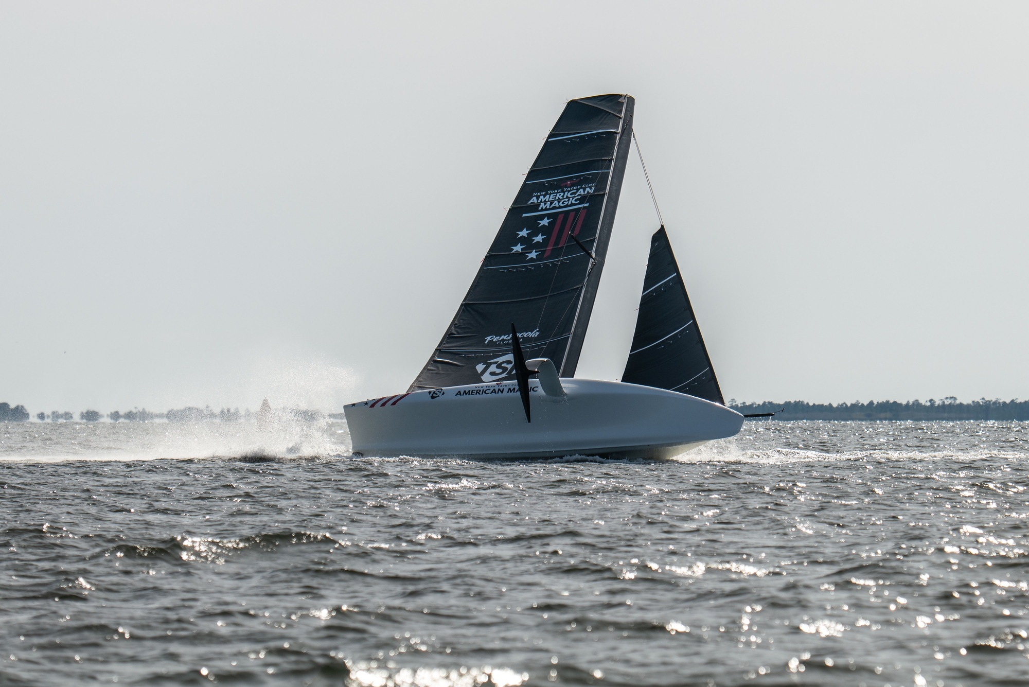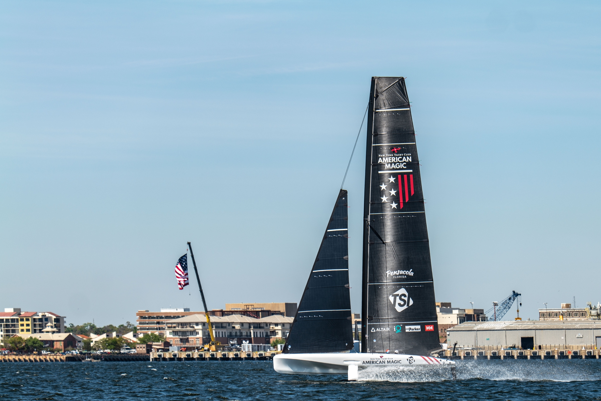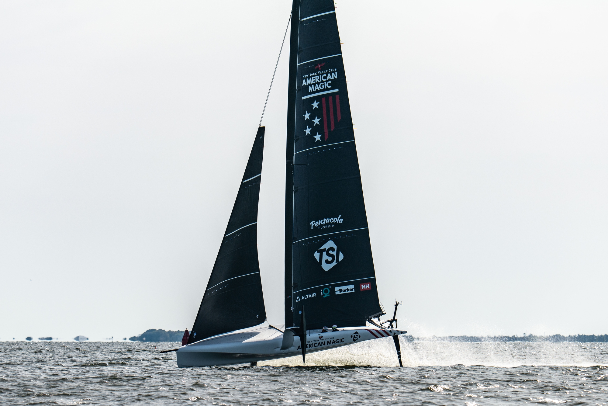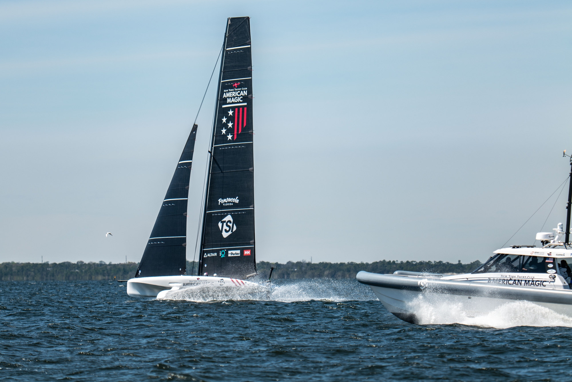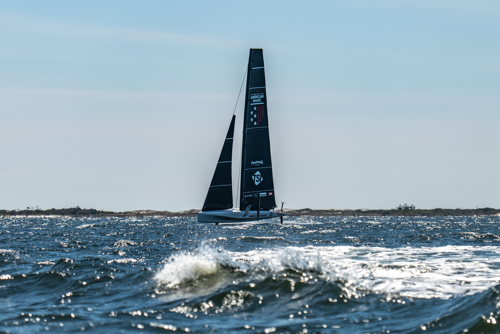 With Tom Slingsby swapped out just after lunch, and just after a bow stuff, as he reportedly was headed to catch a plane flight, Riley Gibbs came on for the afternoon session to accompany Paul Goodison in the helming slot and the J3 call was made with the wind reaching peak speeds with gusts of up to 18 knots. It was relatively flat water inshore in Pensacola Bay but the team didn’t look their usual uber controlled self as flight control was occasionally off kilter and take-offs looked tricky. There looked to be issues with the mainsheet or traveller control and a Chase Boat crewmember could be seen mopping up what looked to be an hydraulic leak around the aft deck.