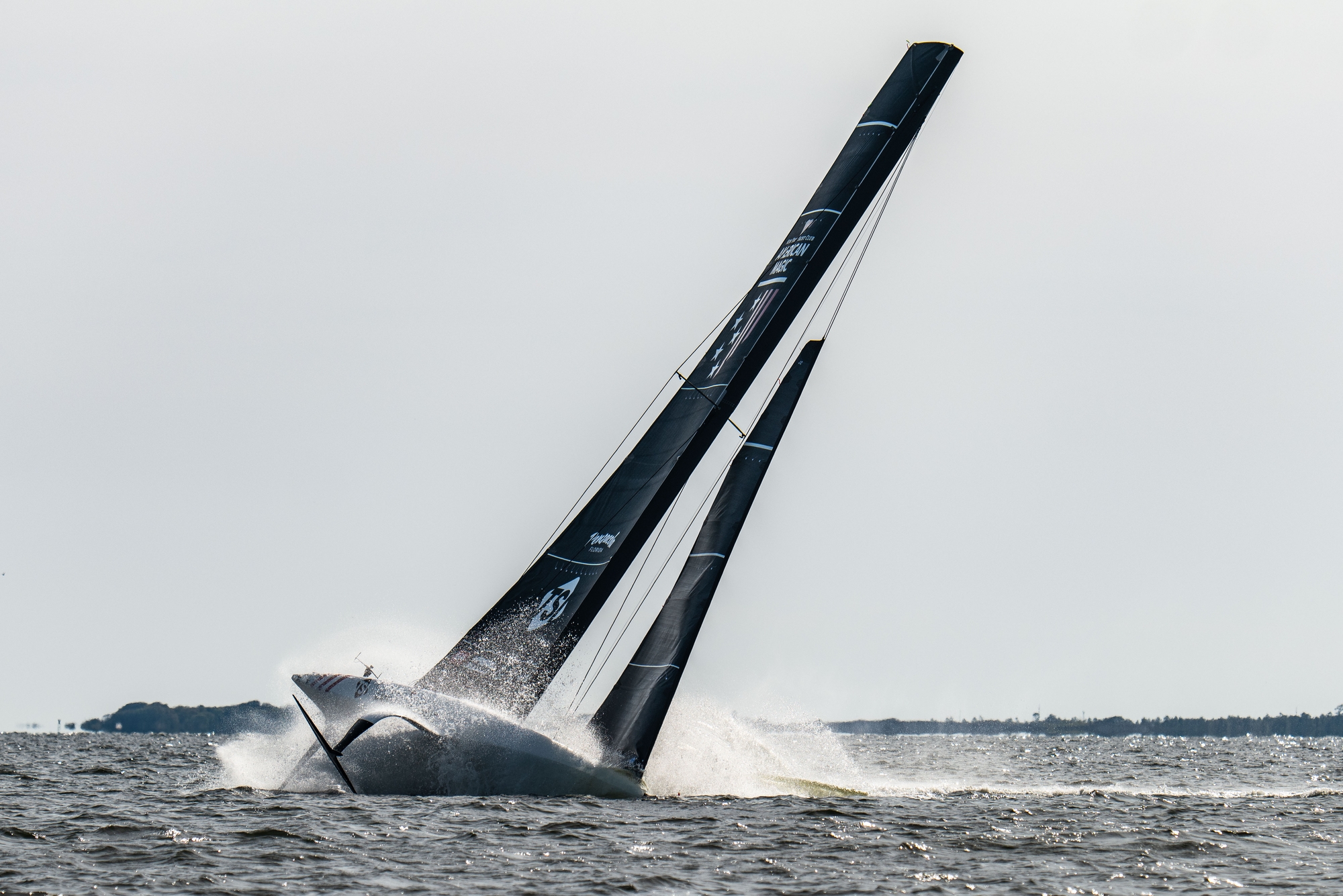At 15:46 America cavitated her rudder and had a massive bow stuff and subsequently capsized. The team had the yacht righted by 15:50 and sailed one more two-minute stint at 16:08. In all, America completed 32 manoeuvres, 13 W/L's, sailed approximately 55nm, and had a flying time of 104min. Top speeds were approximately 30k upwind and 40k downwind. (Magnus Wheatley)