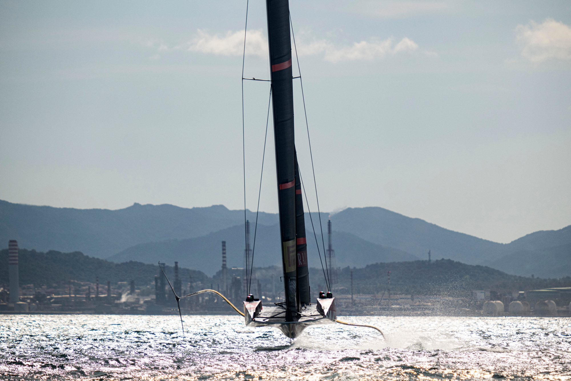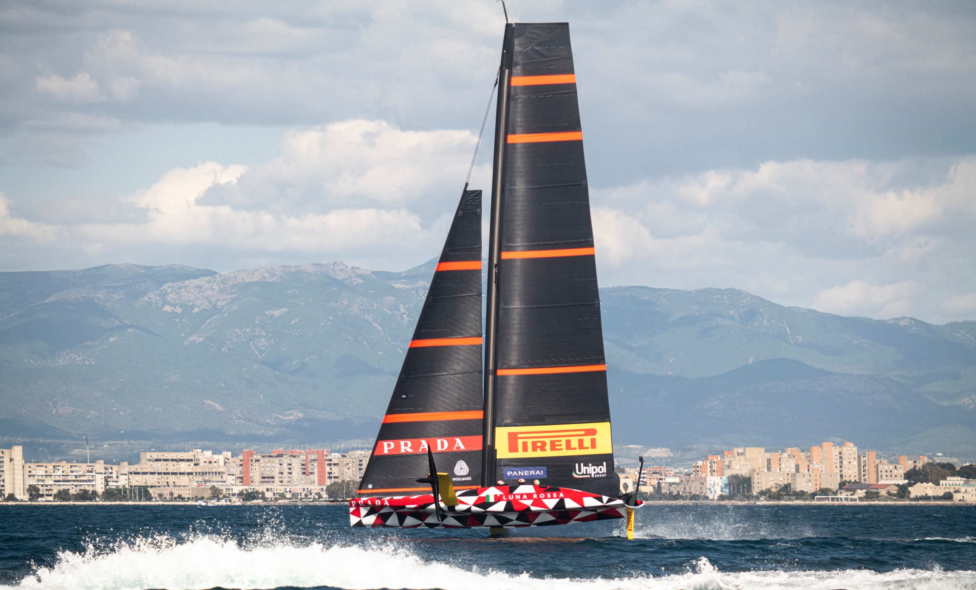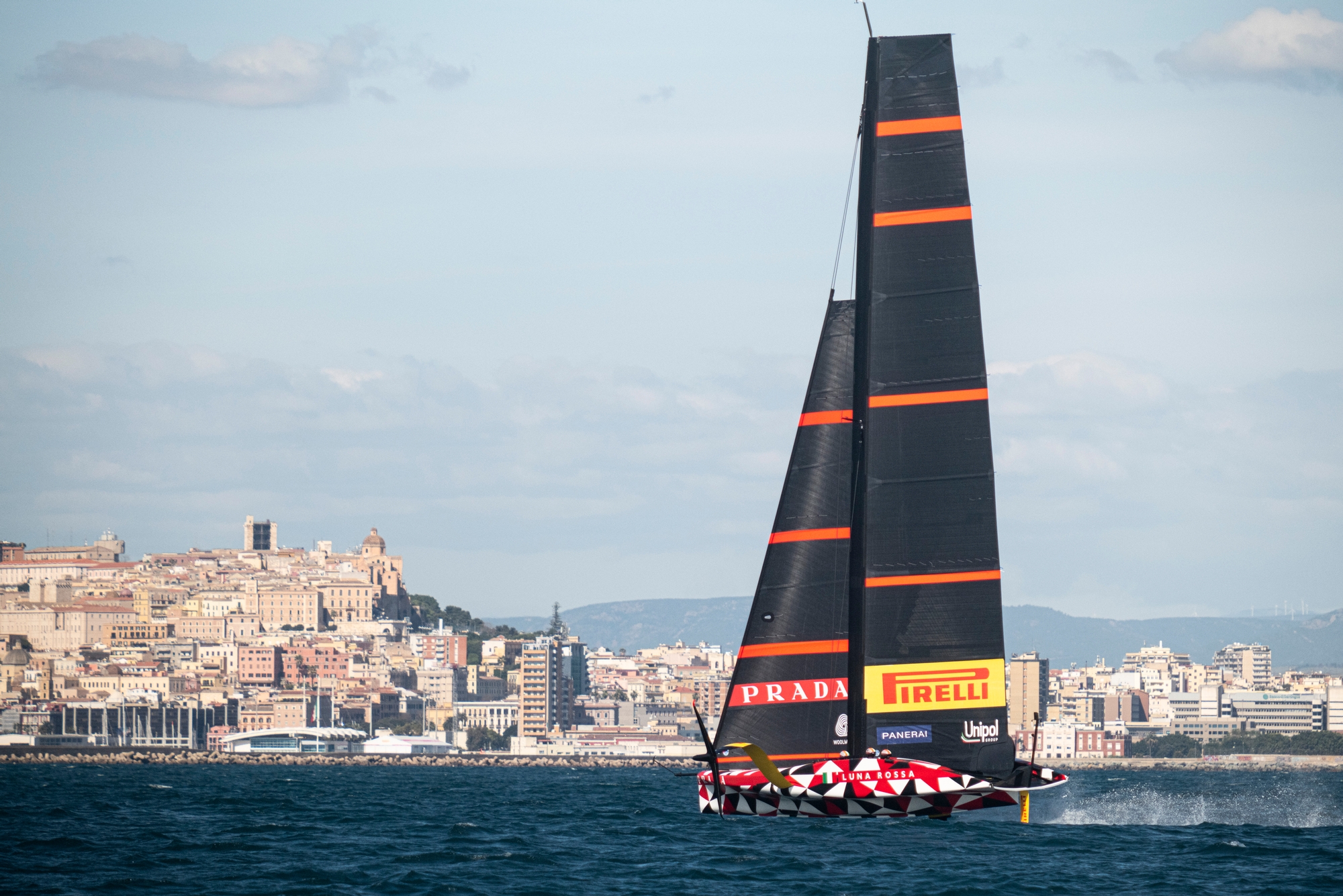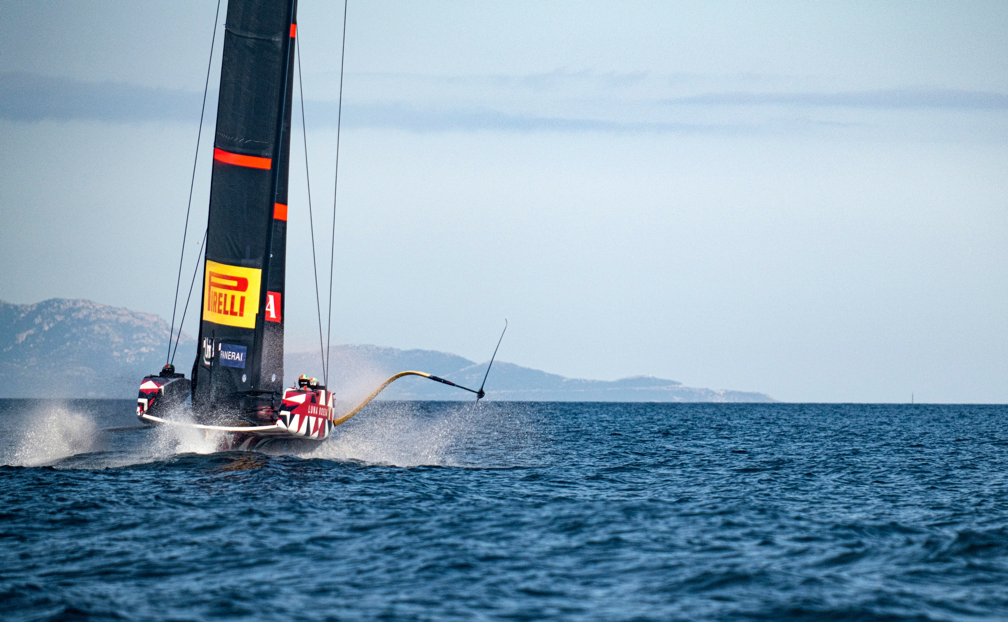 It’s becoming a very good habit. Luna Rossa had another sublime afternoon out on the Bay of Cagliari charging around in perfect conditions, making the most of a brief breeze that topped out at 16-17 knots before fading and all the while collecting gold-dust data as the A/B testing on the switched foils continued over short courses at a blistering canter.