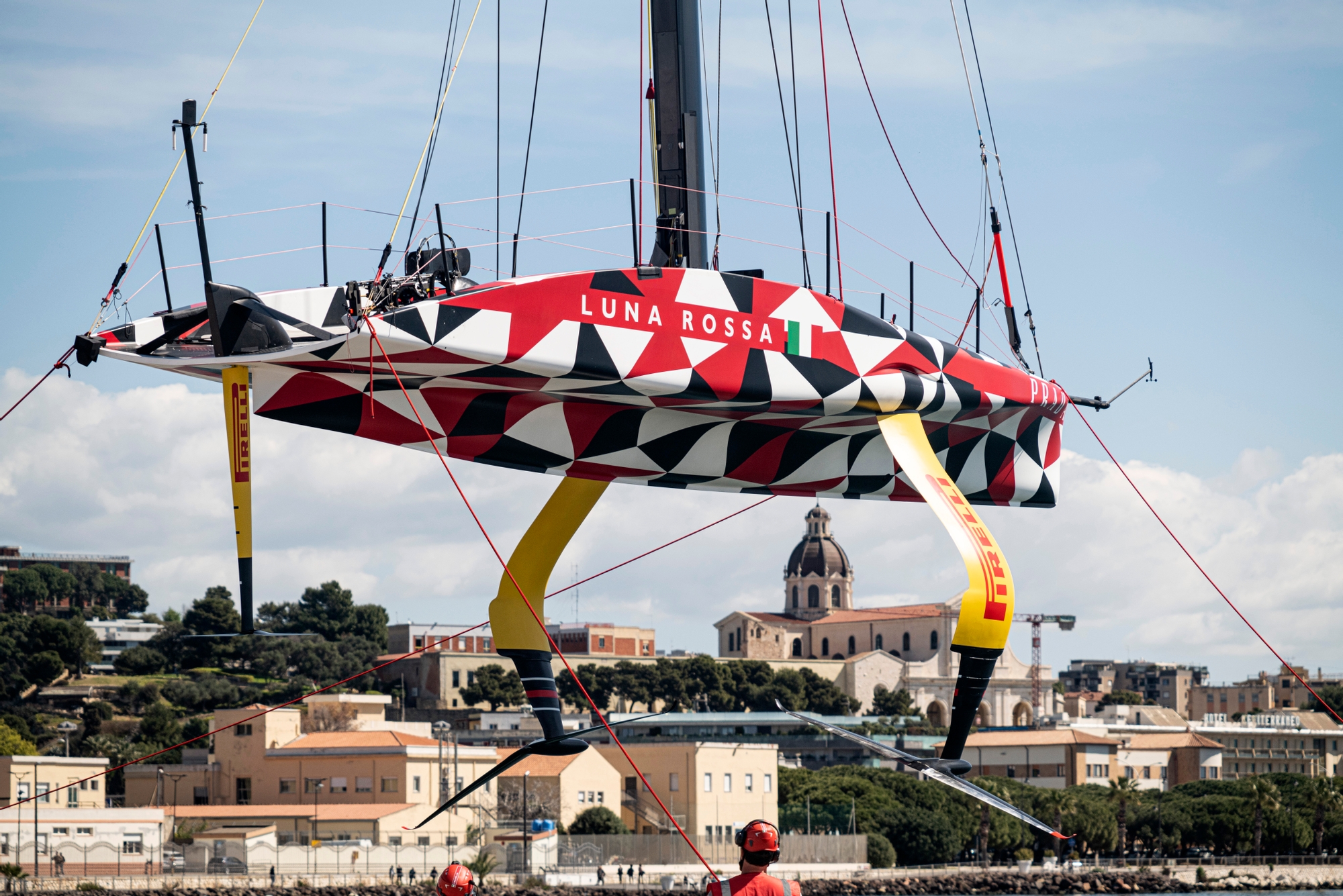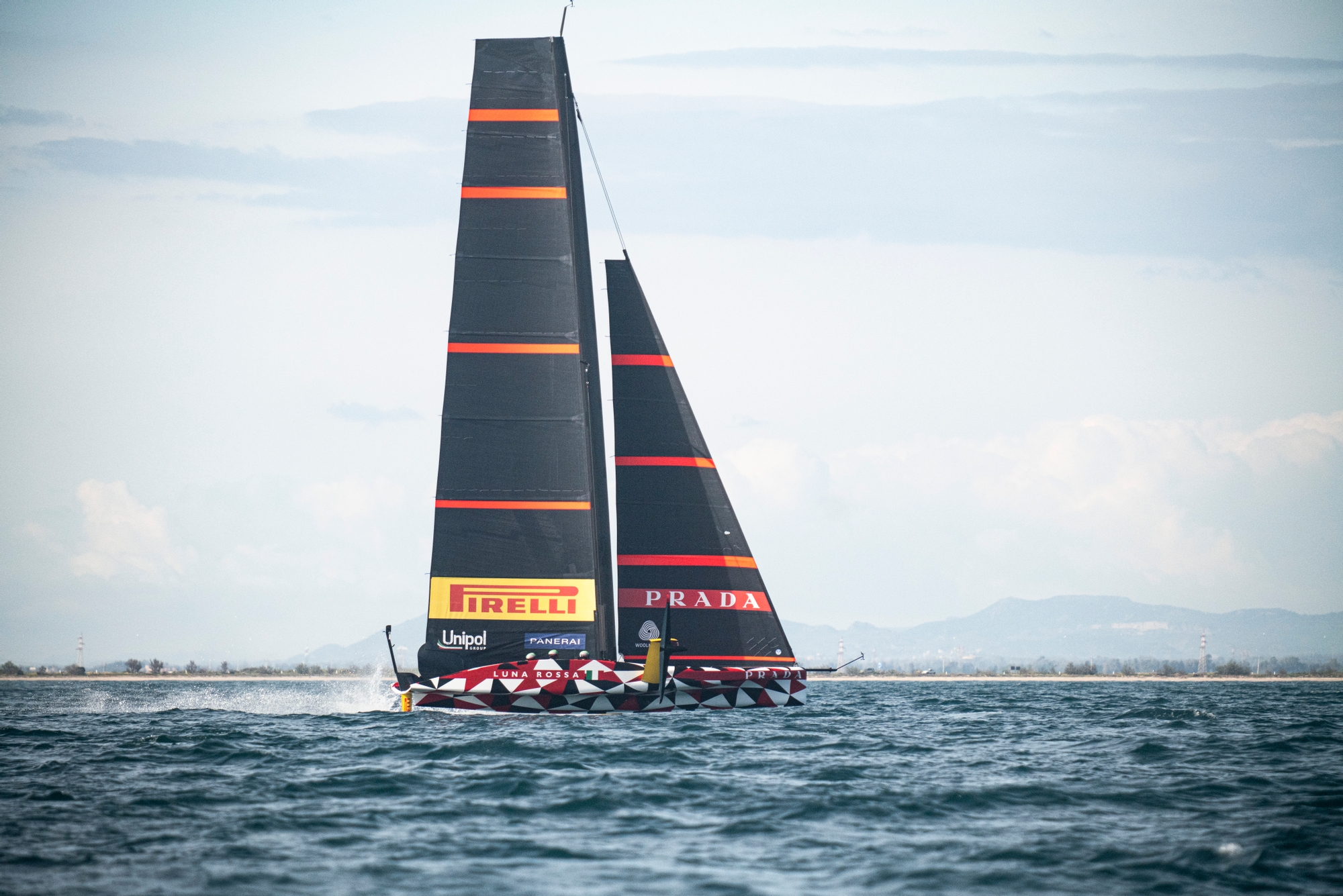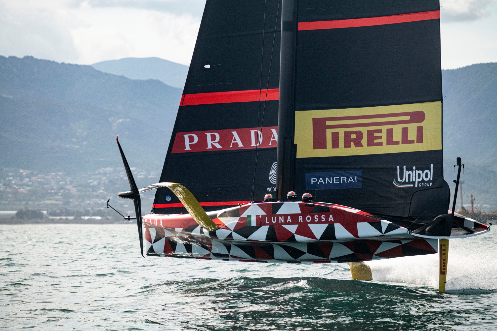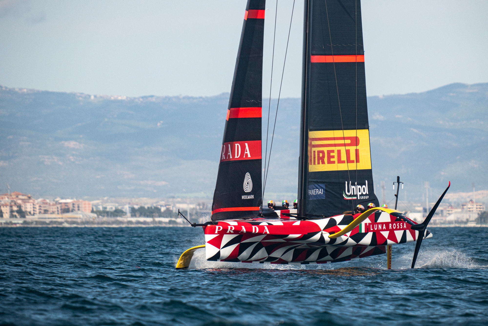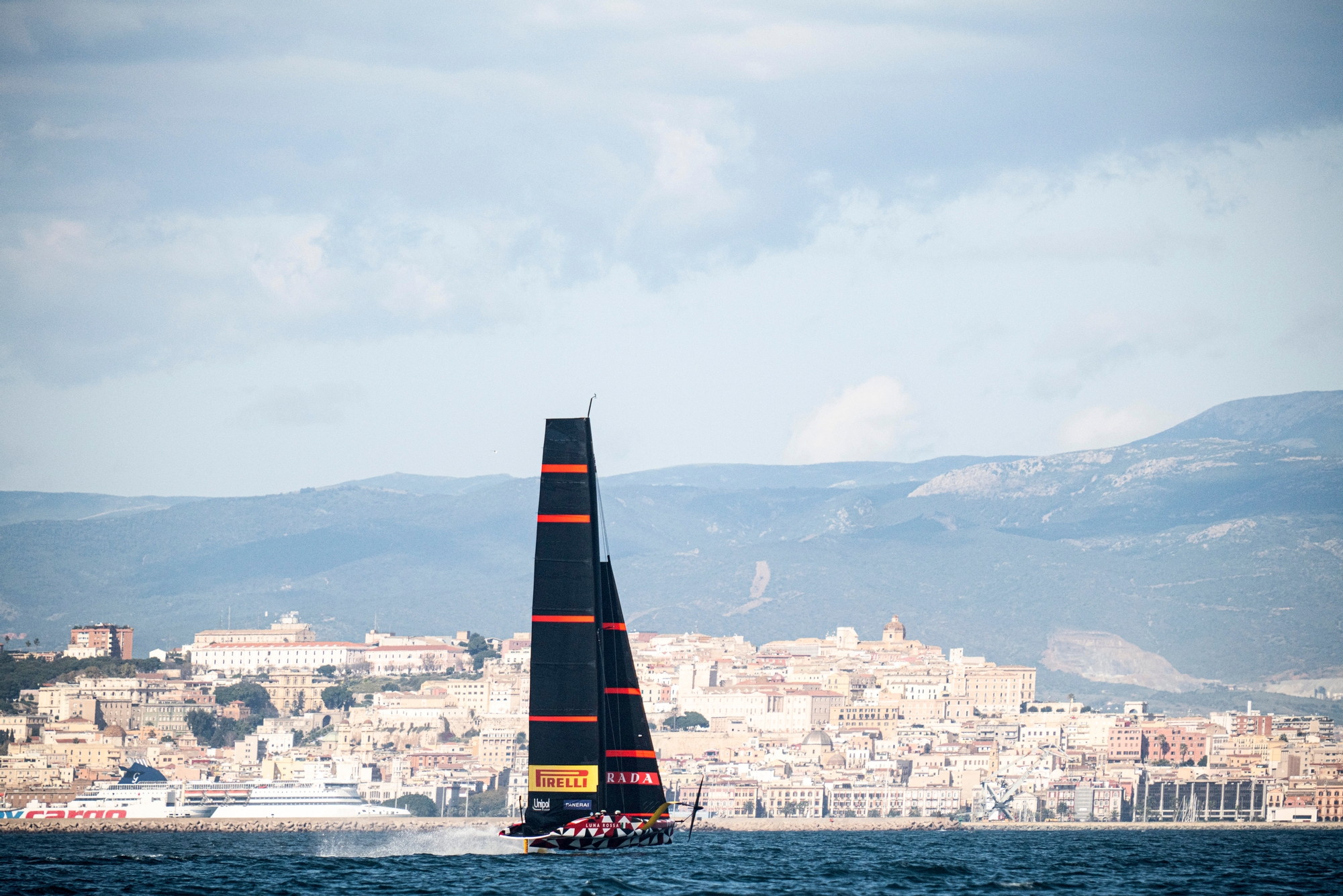 It’s becoming a very good habit. Luna Rossa had another sublime afternoon out on the Bay of Cagliari charging around in perfect conditions, making the most of a brief breeze that topped out at 16-17 knots before fading and all the while collecting gold-dust data as the A/B testing on the switched foils continued over short courses at a blistering canter.