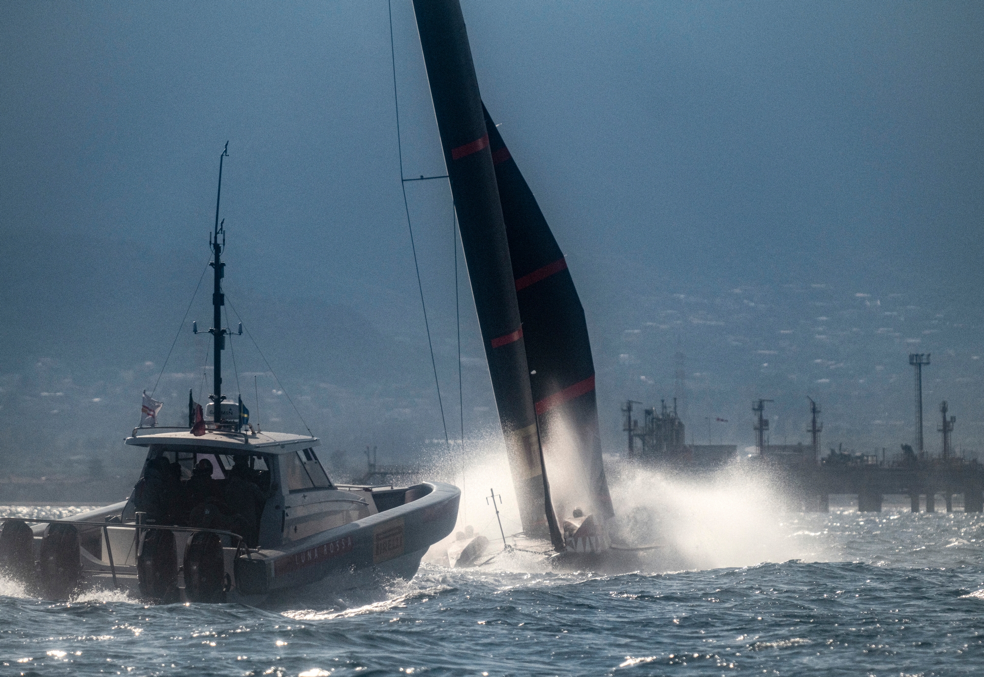 In the leeward gate while rounding up on two boards the prototype almost capsized after a nosedive, the crew greatly saved it after heeling over at approx. 45 degrees. Some checks followed afterwards with inspections by shore crew on the mainsail and ride height sensor aft on portside while the sailors regrouped in the pods.