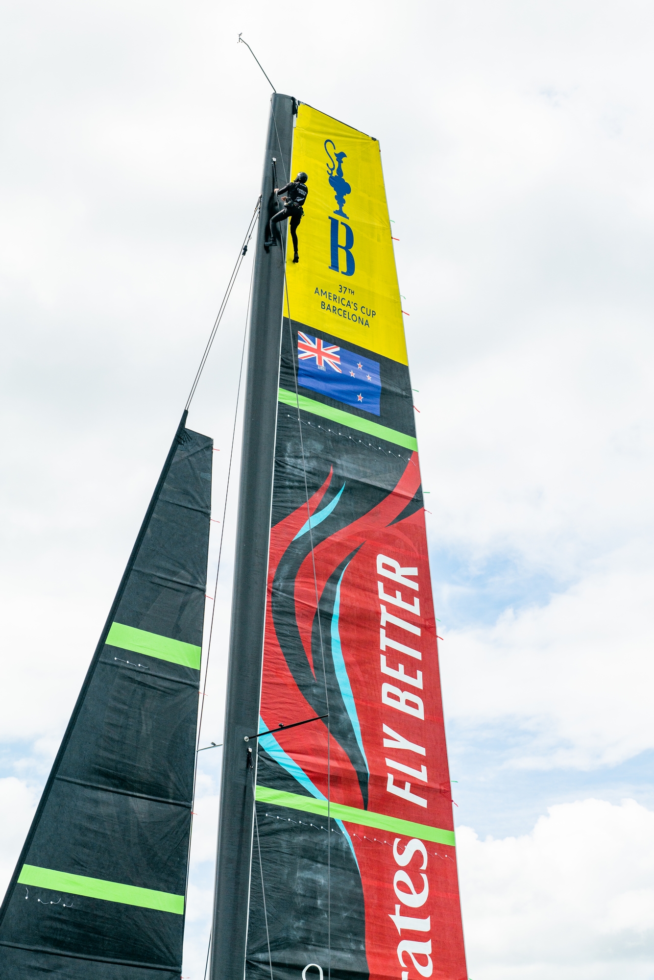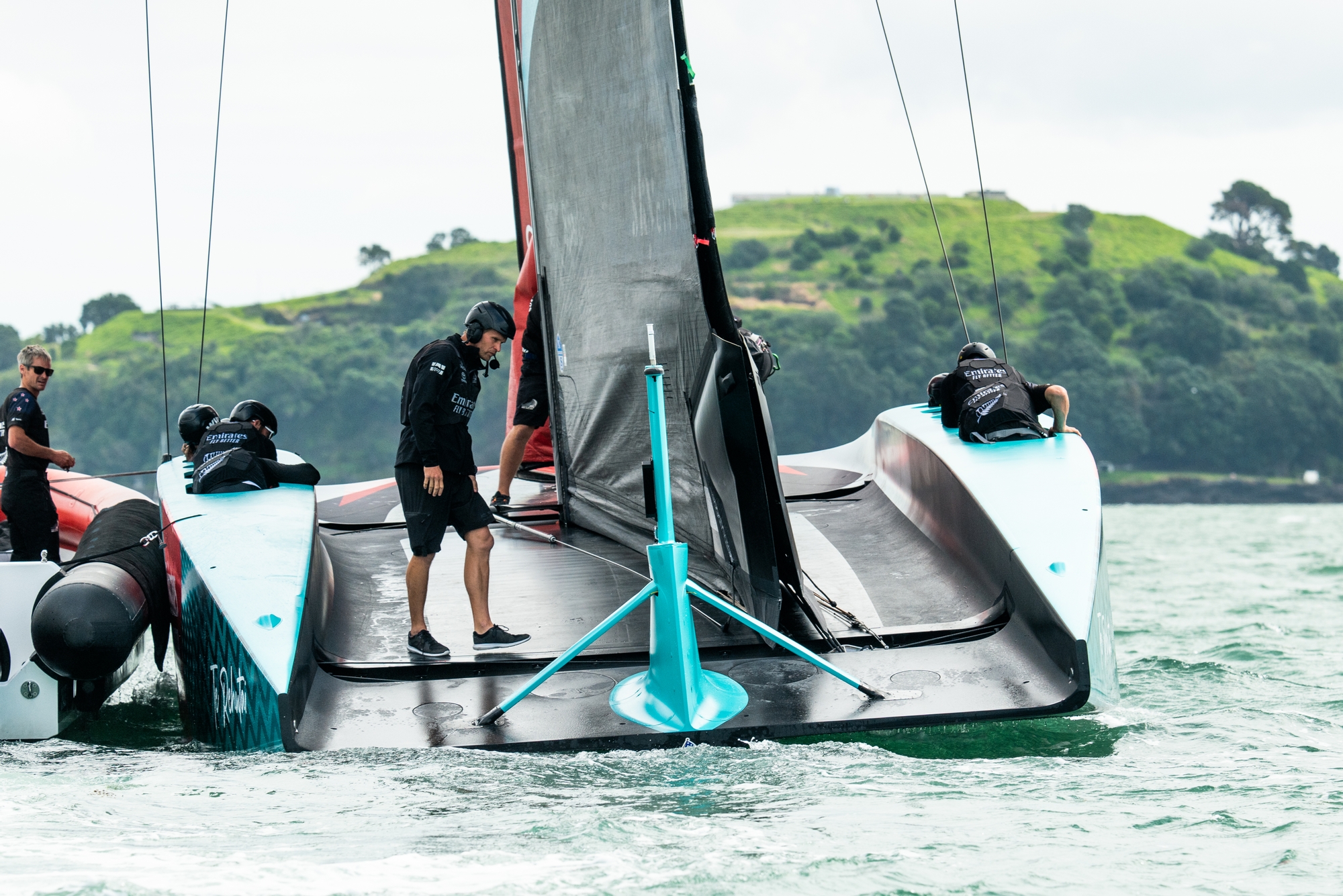 Te Rehutai, lightened and modified, looks to be hitting a performance profile that is in excess of what we saw at AC36 and on Saturday the Flight Controllers held her low upwind whilst the sail control on the mainsail was highly impressive. The Kiwis have worked hard on the internal controls within the double-skinned mainsail and the result is a very even break of the leech all the way from the traveller to the square sectioned top which gives the trimmers immense control to both power-up and de-power at will. Emirates Team New Zealand’s sail control is next level stuff and the power required is being provided highly efficiently from the four-man cyclor team who are almost hidden in the aft pods with a very low aero profile.