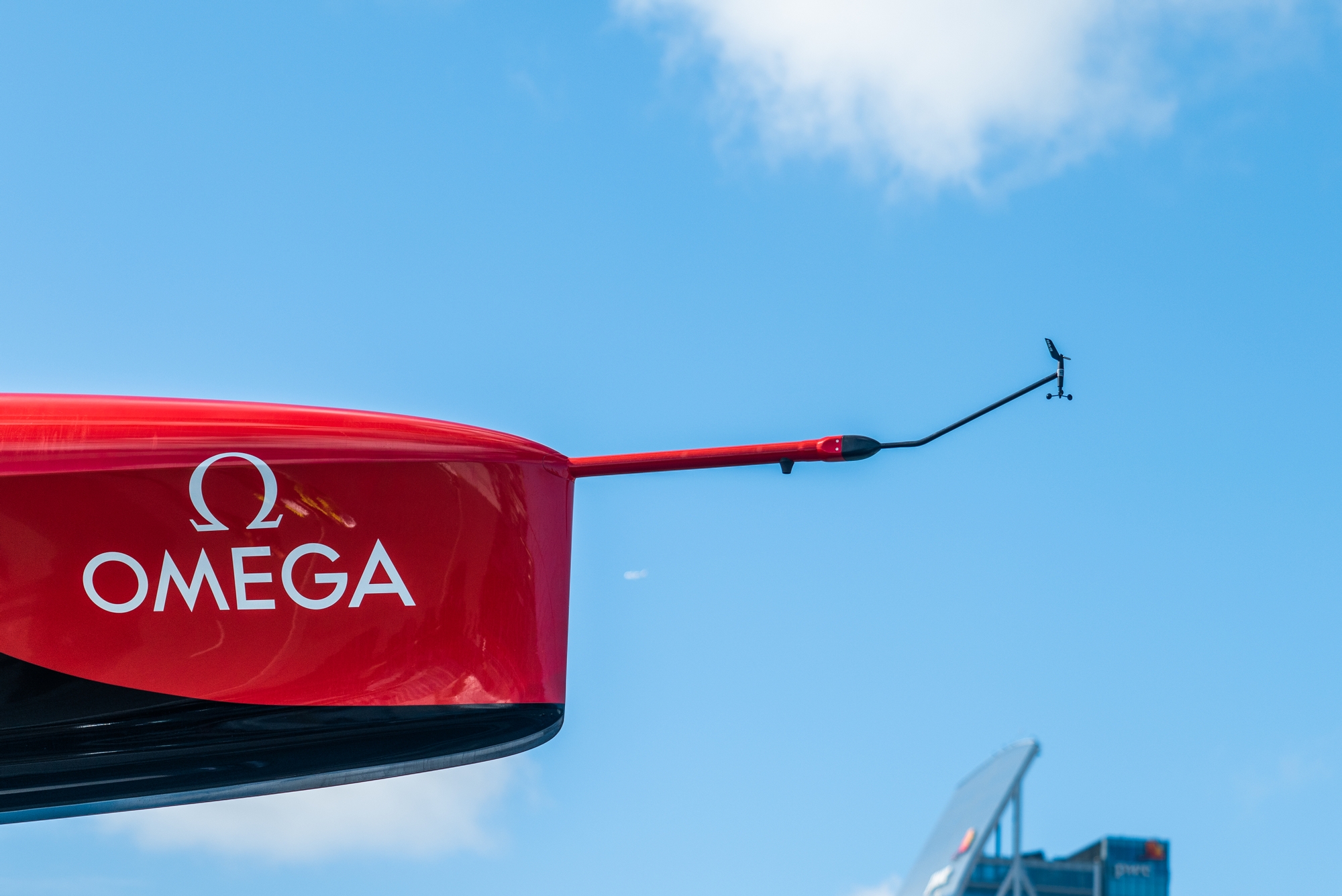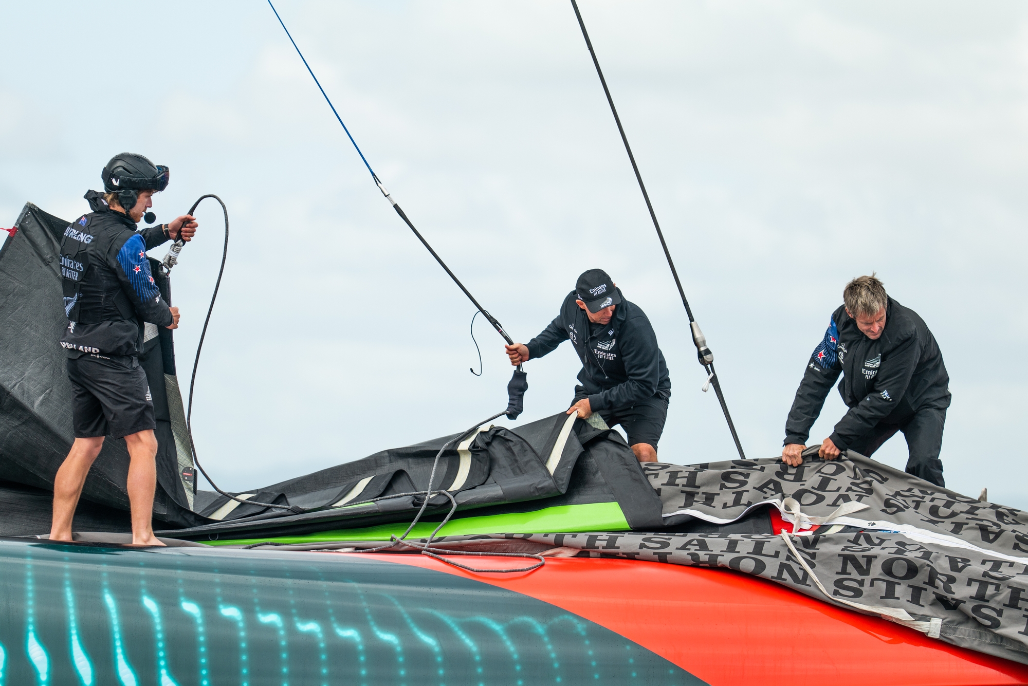 Inshore, as the water flattened, the team were able to capture Te Rehutai up close and after the Kiwis had weathered through an intense gust in displacement, the recon unit observed a “large kink in the forestay, just above the head of the jib.”