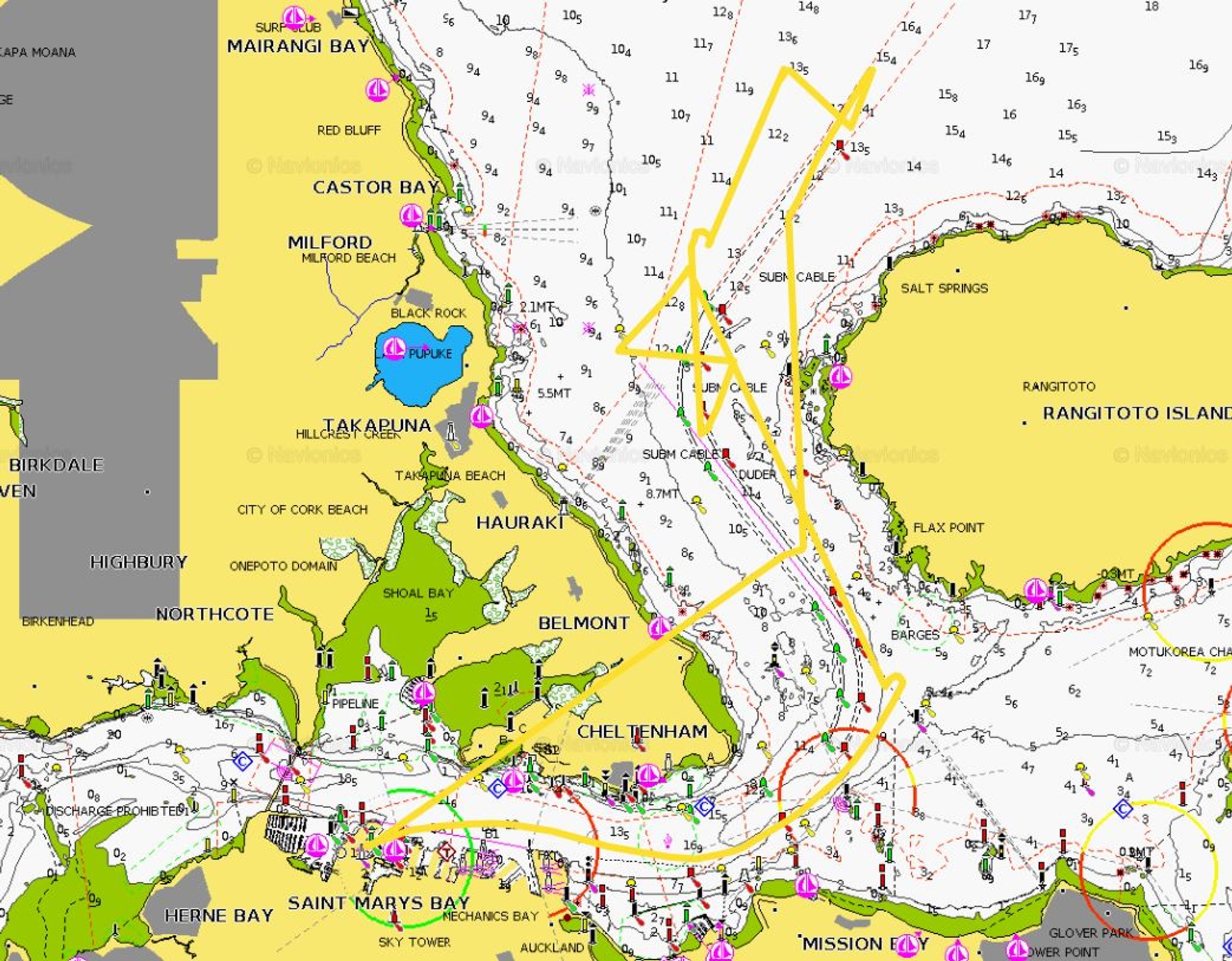 The yacht stopped sailing at 13.36 and did a power group rotation and was sailing again at 13.49. Here she followed a similar pattern with a 7-9 mile run out towards Shearer Rock before hardening up and beating back in towards Takapuna.