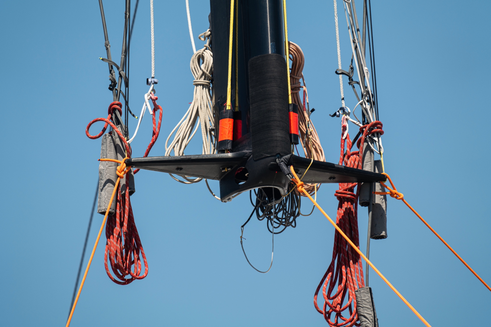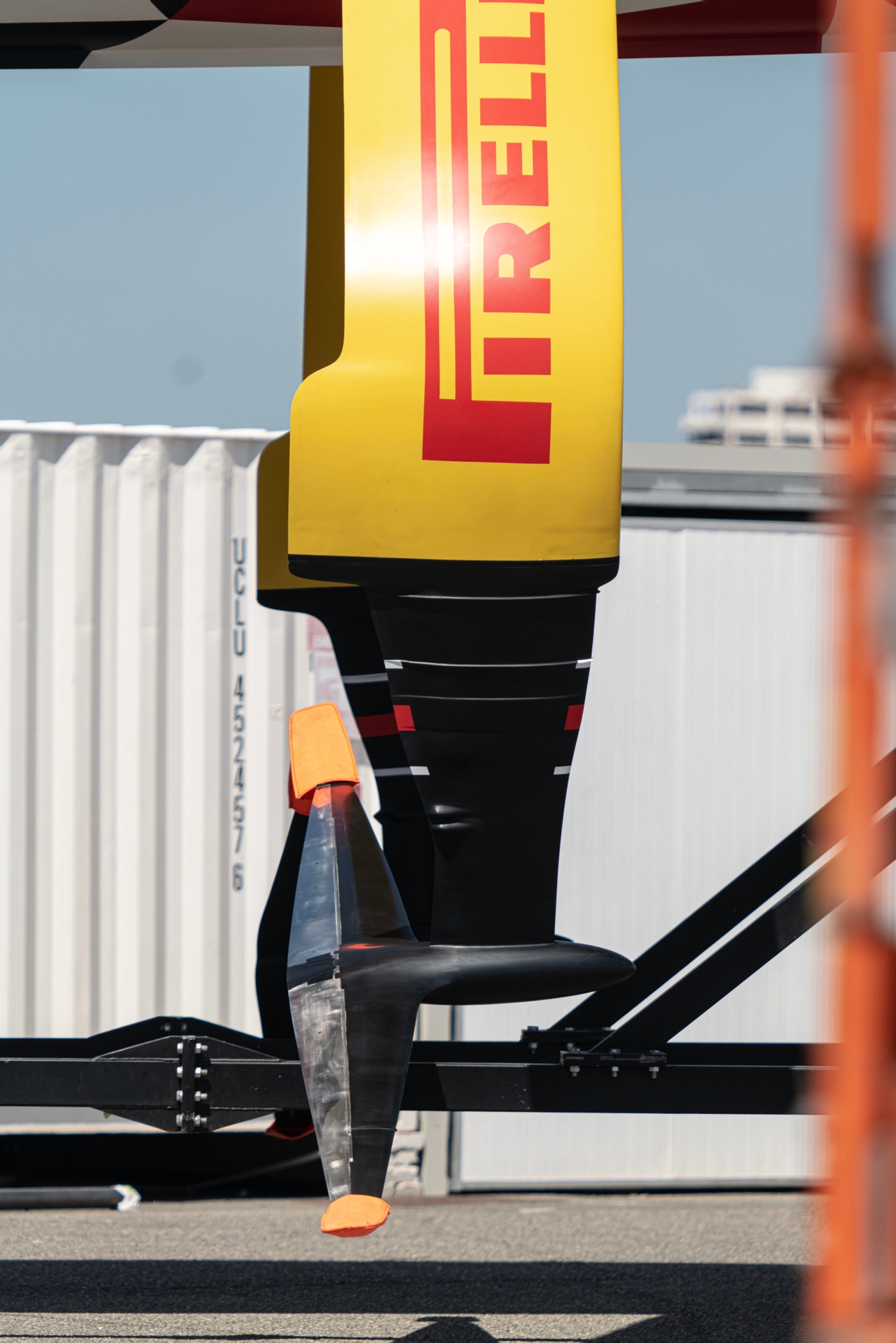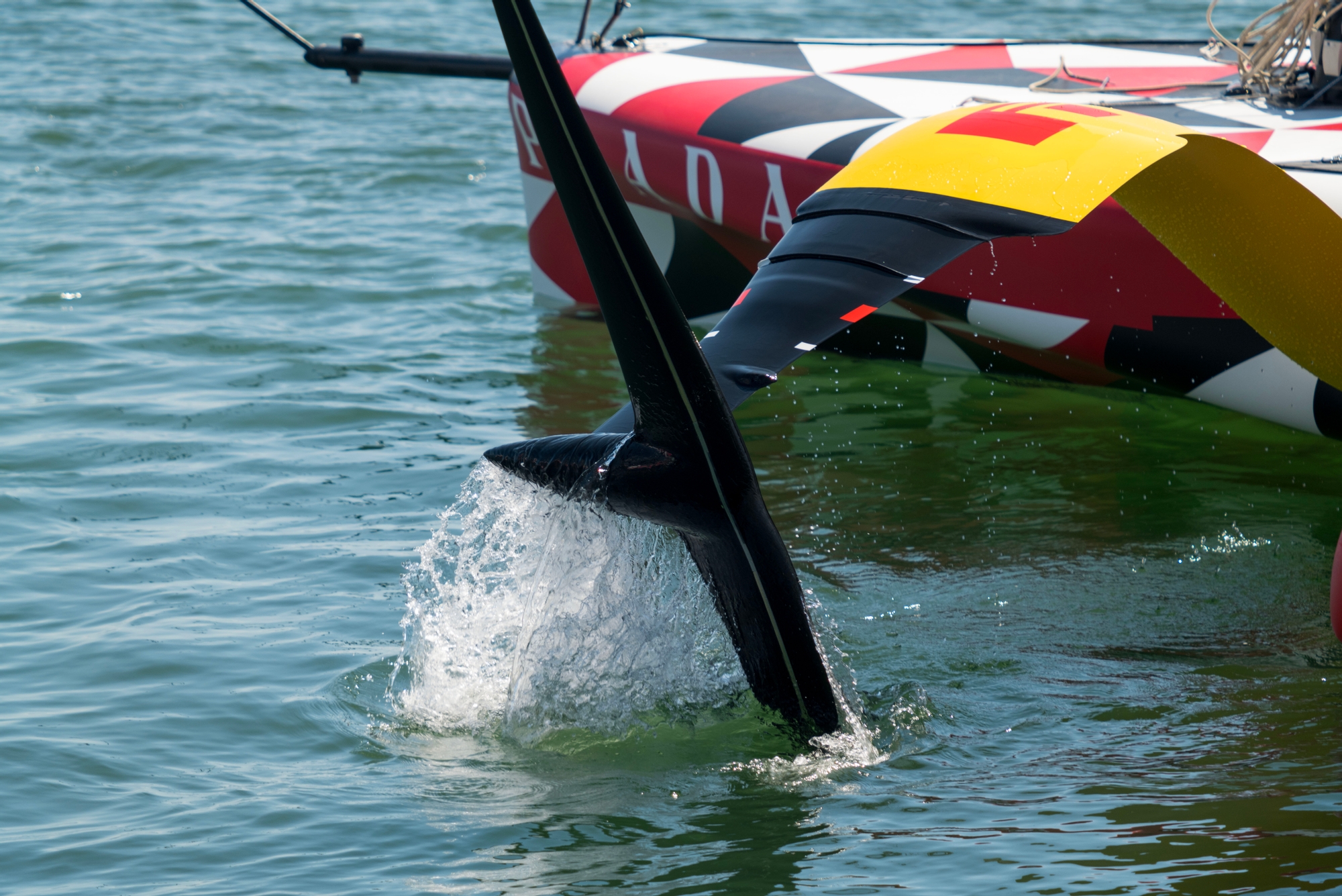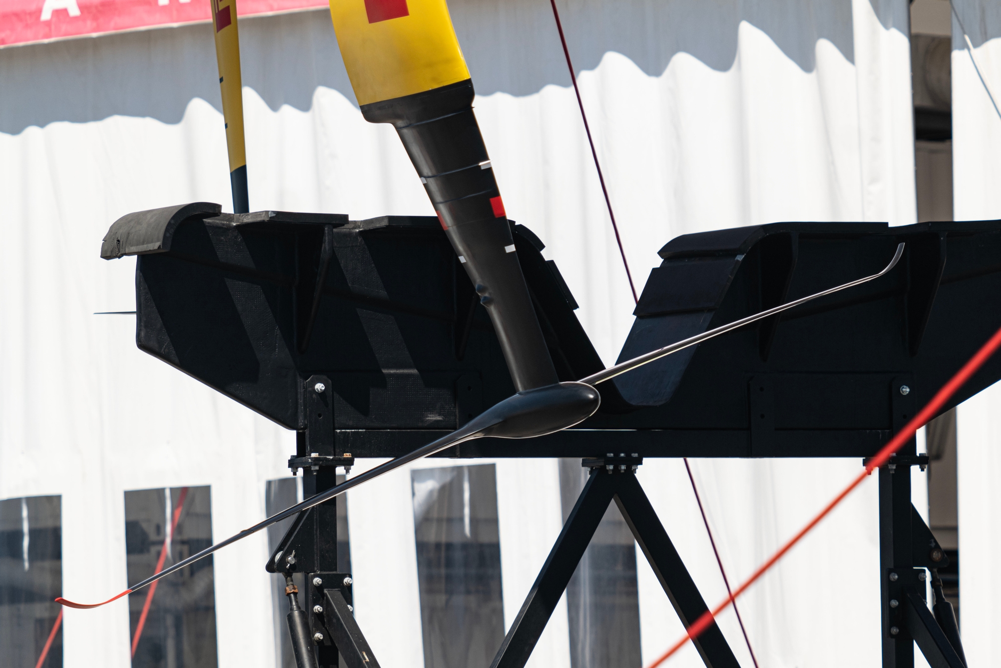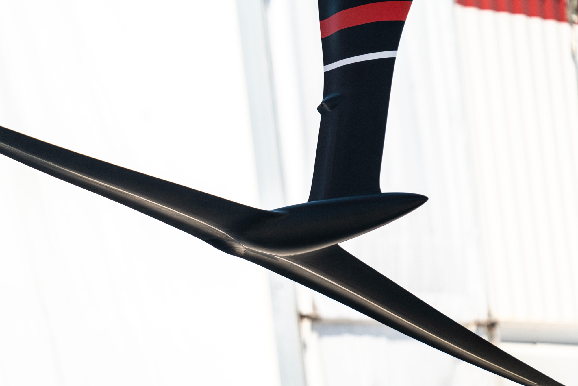 A slender, refined bulb protruding forward with a long span, very flat wing with a reduced foil flap radius is a refinement of the starboard flat foil that the team have been A/B testing and replaces the slender anhedral that the team were running on the portside throughout March. A thing of beauty, there was additional refinement in the lower foil arm, but the flap arrangement is yet to be captured by the recon team who will be looking closely at this in the coming days. It certainly looks a step-on from the original flat wing now running on starboard and the team were anxious to get straight-line data on this first commissioning day.