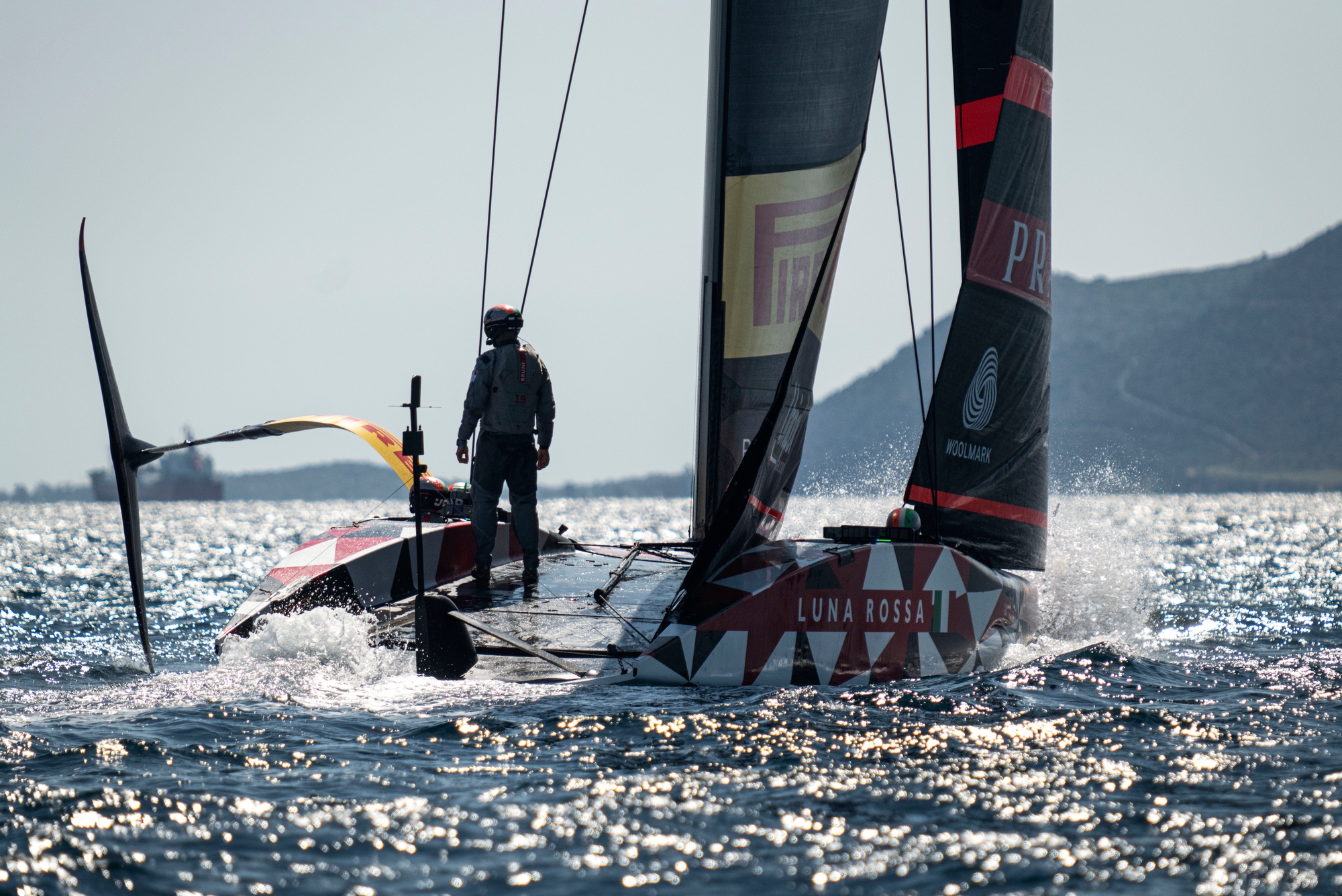 With Ruggero Tita and Vittorio Bissaro both away sailing Nacra 17 ‘s in Palma it was the turn of Jacopo Plazzi, the 49er ace, to partner with Francesco Bruni on the first day back on the water for Luna Rossa Prada Pirelli’s LEQ12 after an extensive ten-day period of maintenance, refit, and upgrade. Immediately out of the shed the newly declared port foil could be seen and offered, perhaps, a distinct clue as to the design direction that the Italians are pursuing.
