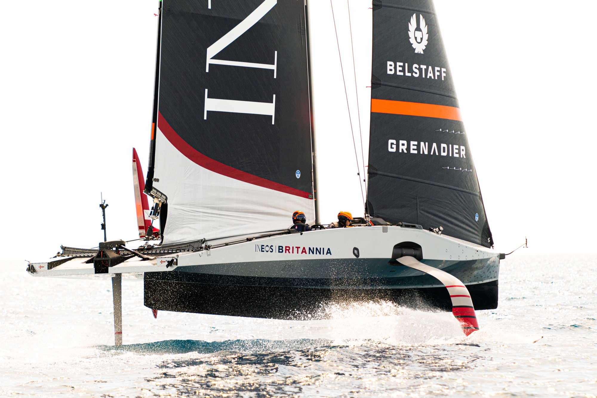 With so much to get to grips with in such a short space of time, INEOS Britannia the Challenger of Record for AC37 in Barcelona, showed today (Tuesday) why they are many people’s pick to go deep in the competition come September 2024. It may well have been a data gathering day with plenty of board-drops, round-ups and bear-aways being tested but the sailing was top level stuff with an impressive 94% return of foil-to foil or touch & go manoeuvres. With the newly declared J1 jib up, take-offs were smart with easy pop to flight, and the flight control was remarkably stable with a smidge of windward heel upwind and deep angles at cant downwind.