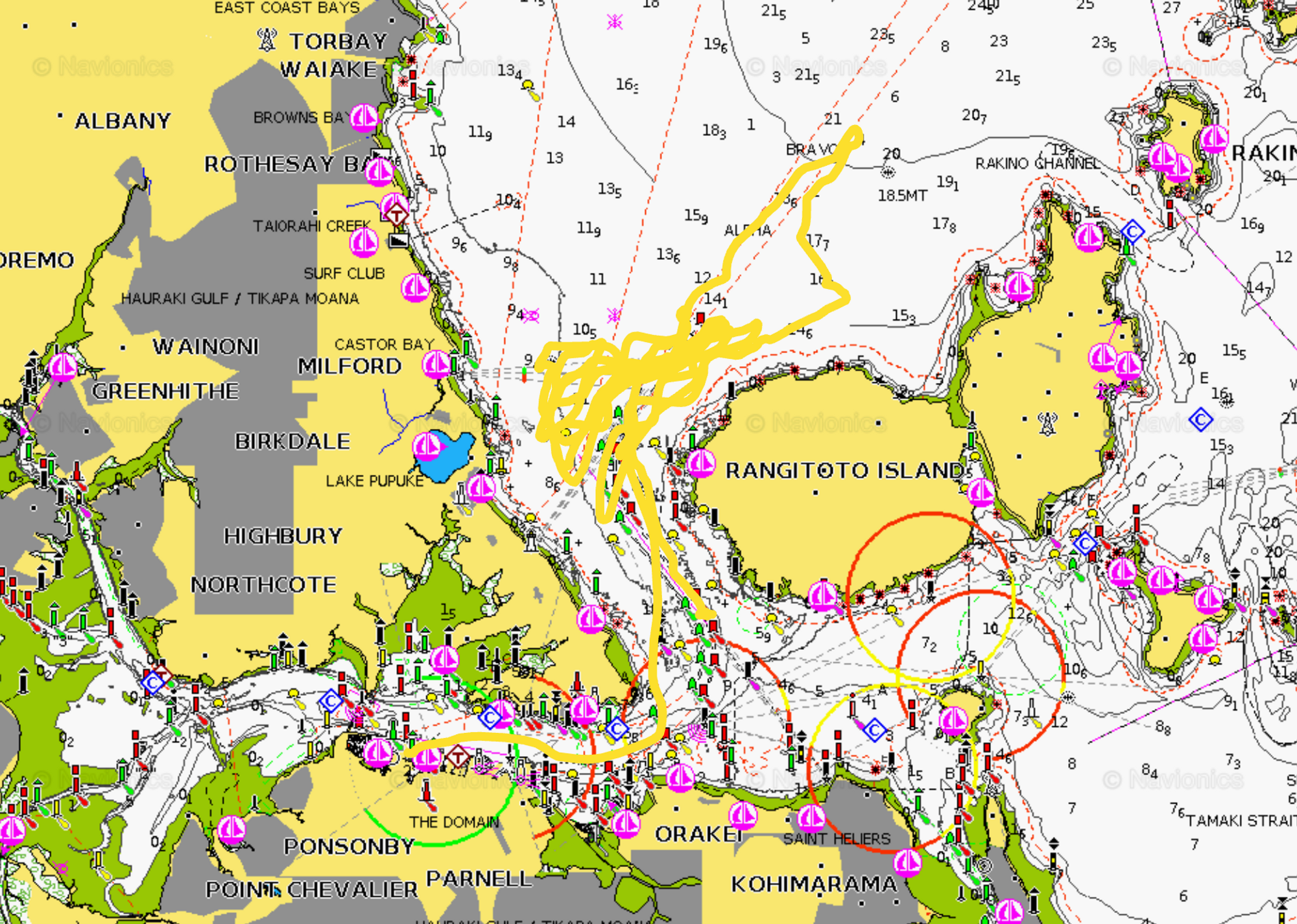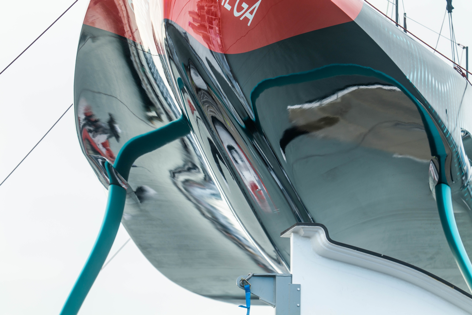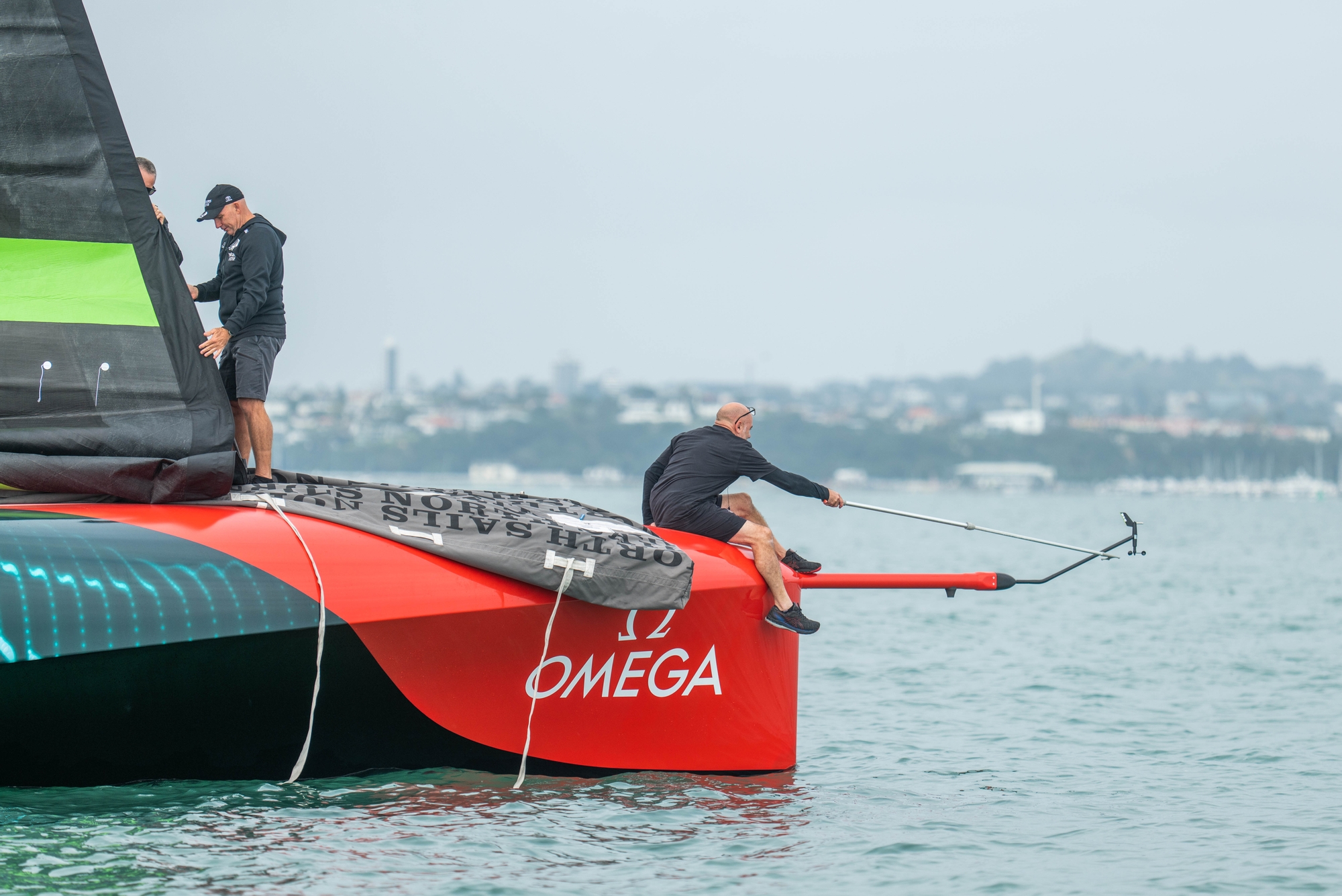 In 10-12 knots of cold south-westerly breeze, she got sailing at 10.36am, zig-zagging on port tack upwind to down before gybing for the North Shore of Rangitoto where she came to stop at 10.50am. The J2 came down at 11.10am and she sat head-to-wind with Chase 1 on her port side with 10-14 knots of south-west breeze, at 11.31am there was a 20 degree shift with an increase of pressure of about 5 knots, Chase 1 tried to compensate but Te Rehutai rolled away from the chase hitting her port foil arm on the underside of the chase boat.