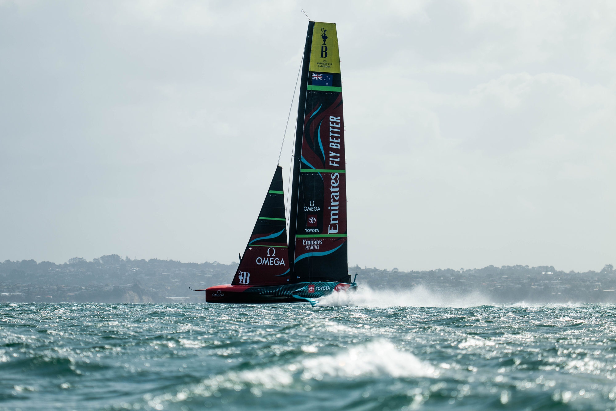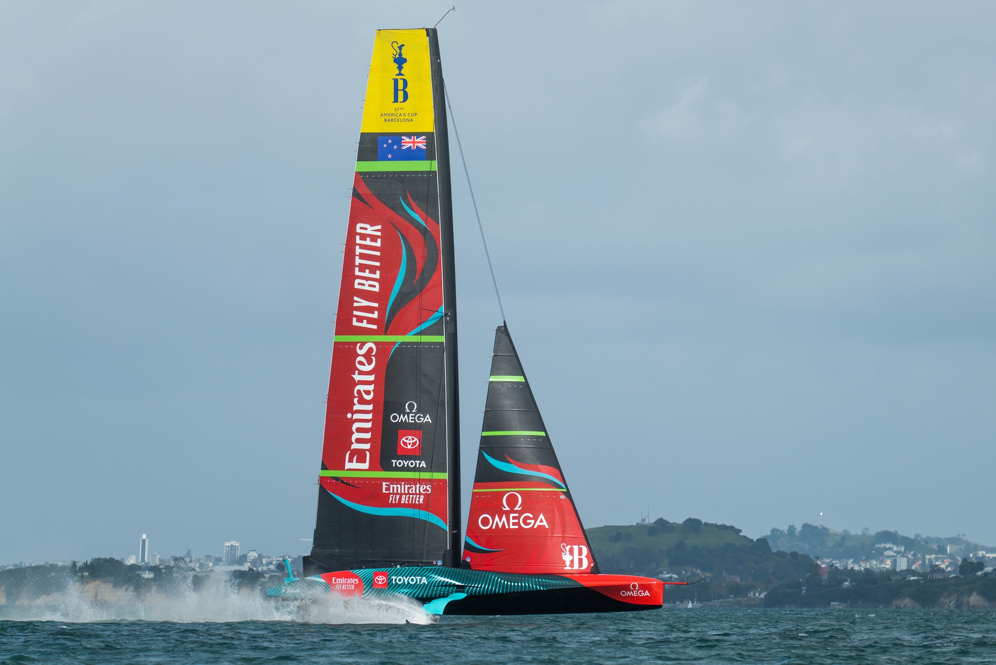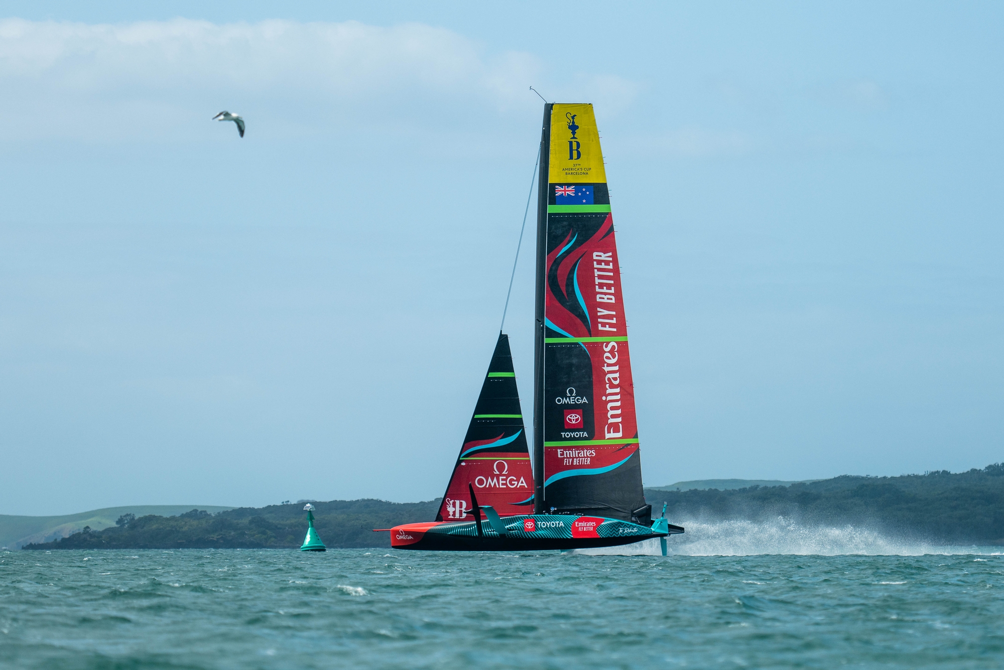 Looking absolutely assured, Emirates Team New Zealand put in a solid, stable session out on the Hauraki Gulf and as the breeze and sea state increased, ‘Te Rehutai’ just got faster and faster. Dynamite sail control all the way up the mainsail leech with minimum traveller movement, tacks were slick and fast, gybes were accurate with the team testing through a variety of ride heights both in a straight-line and through manoeuvres.