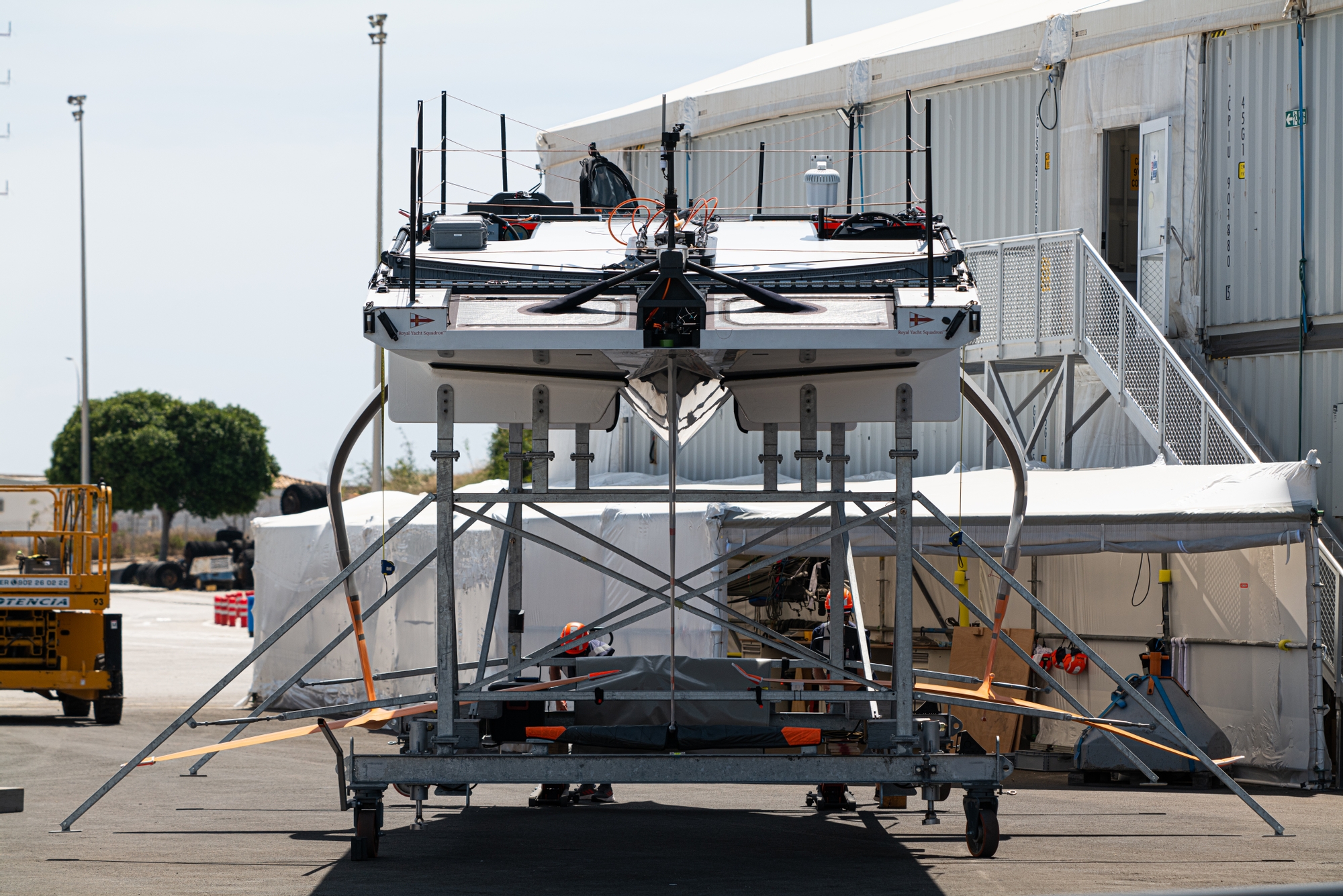 Scheduled as a non-sailing day for the shore team to set up and recalibrate the mast and rigging after the upgrade, what was notable when the boat rolled out was a new starboard foil configuration with the previous inverted w-foil being replaced by a downward facing 'banana' foil. Terminating either end of this foil were upward angled winglets. Interestingly, although the distinct shape of an aft flap and hinge could be seen on the underside of the foil, from our vantage points there did not appear to be any indication of this on the top surface. Three sensors/cameras were mounted on this foil. Two were on the top surface – one on the inner wing section and one in the centre in line with the foil arm connection – with the third mounted underneath in the middle, mirroring the one on top.