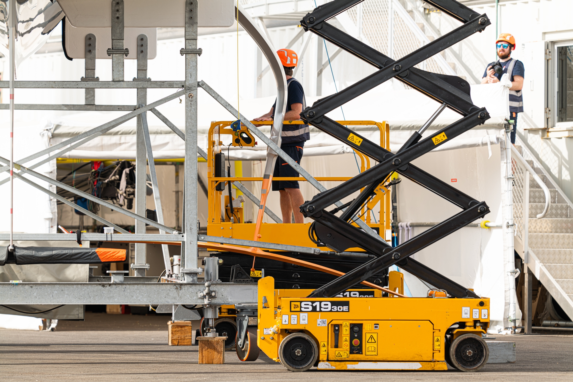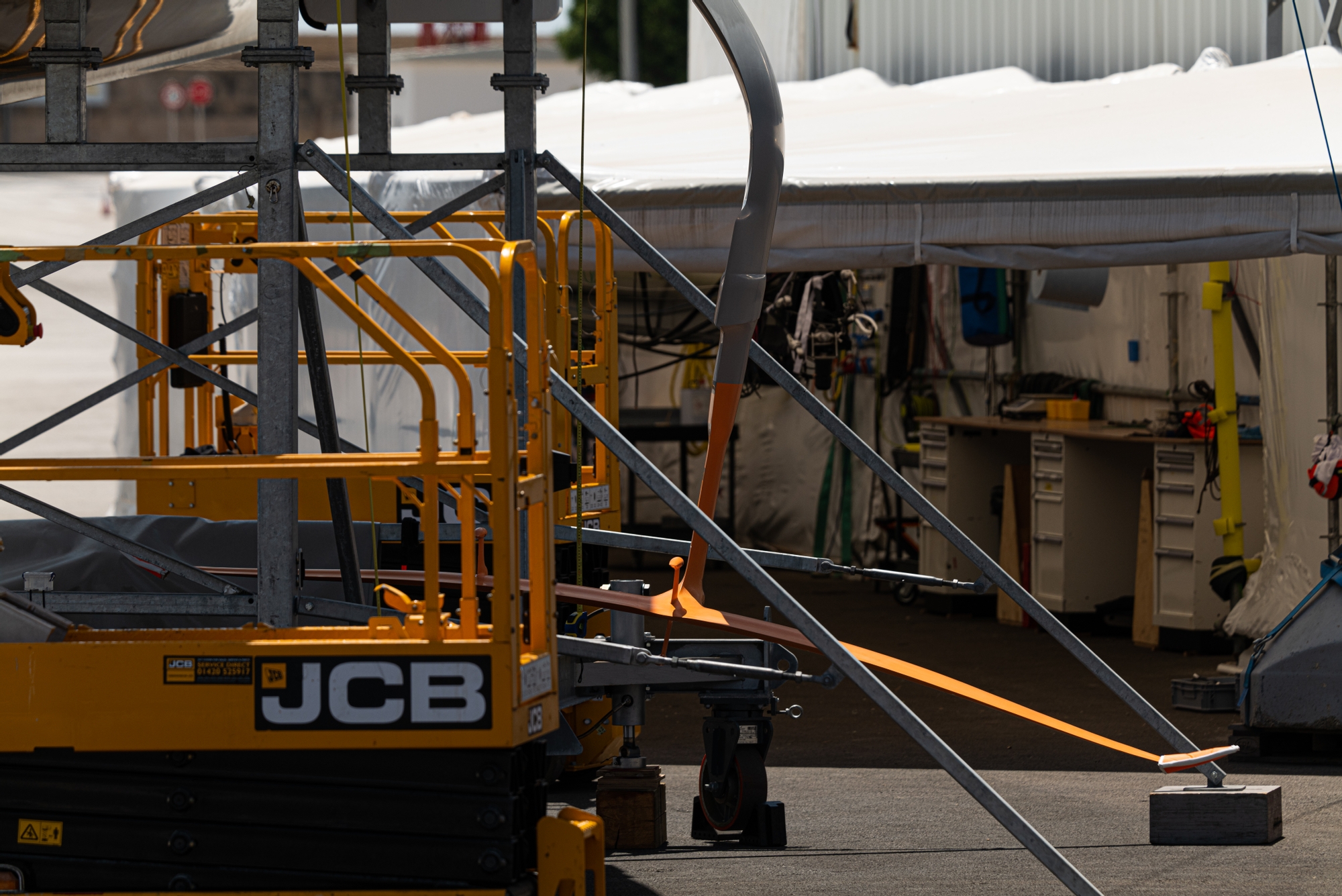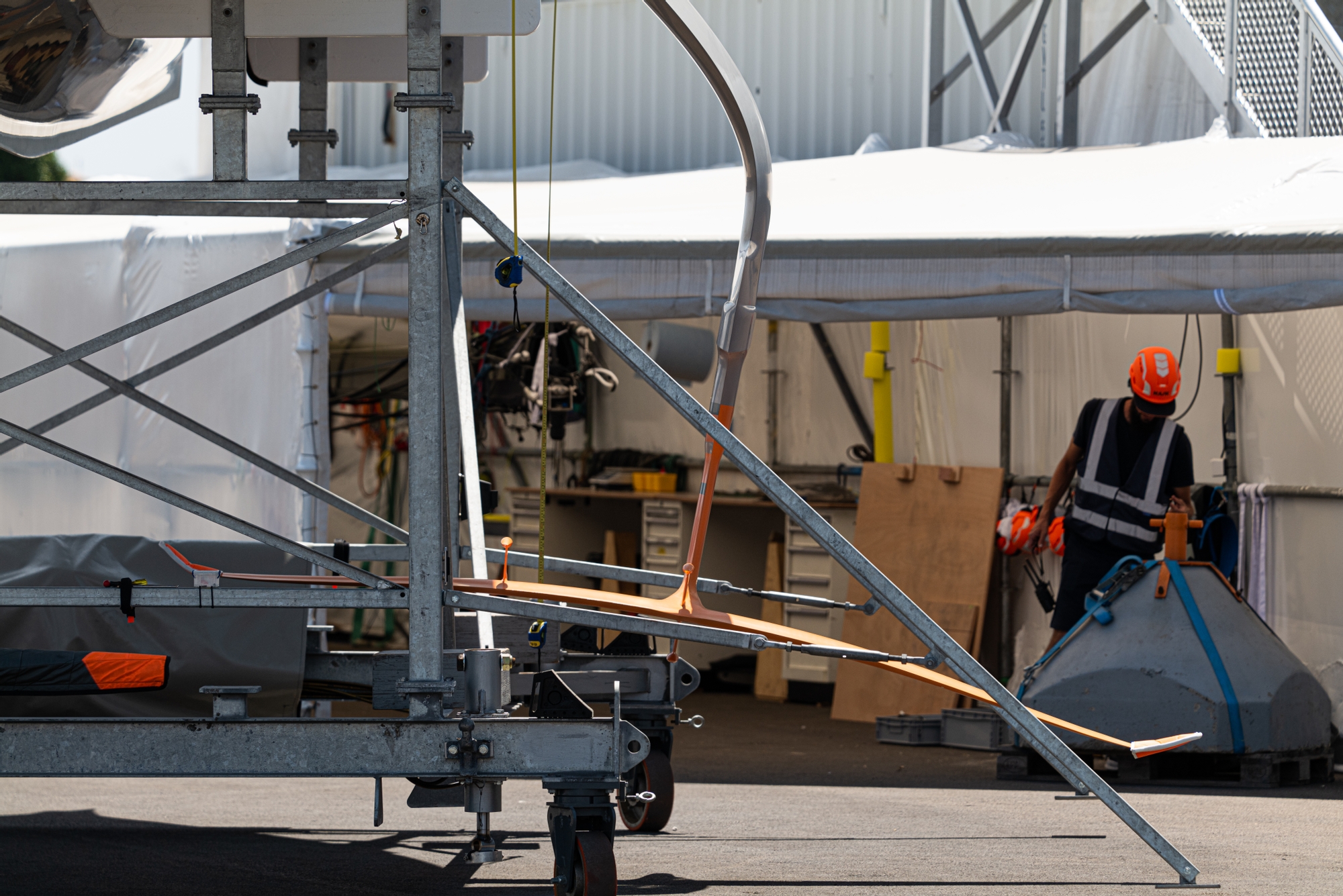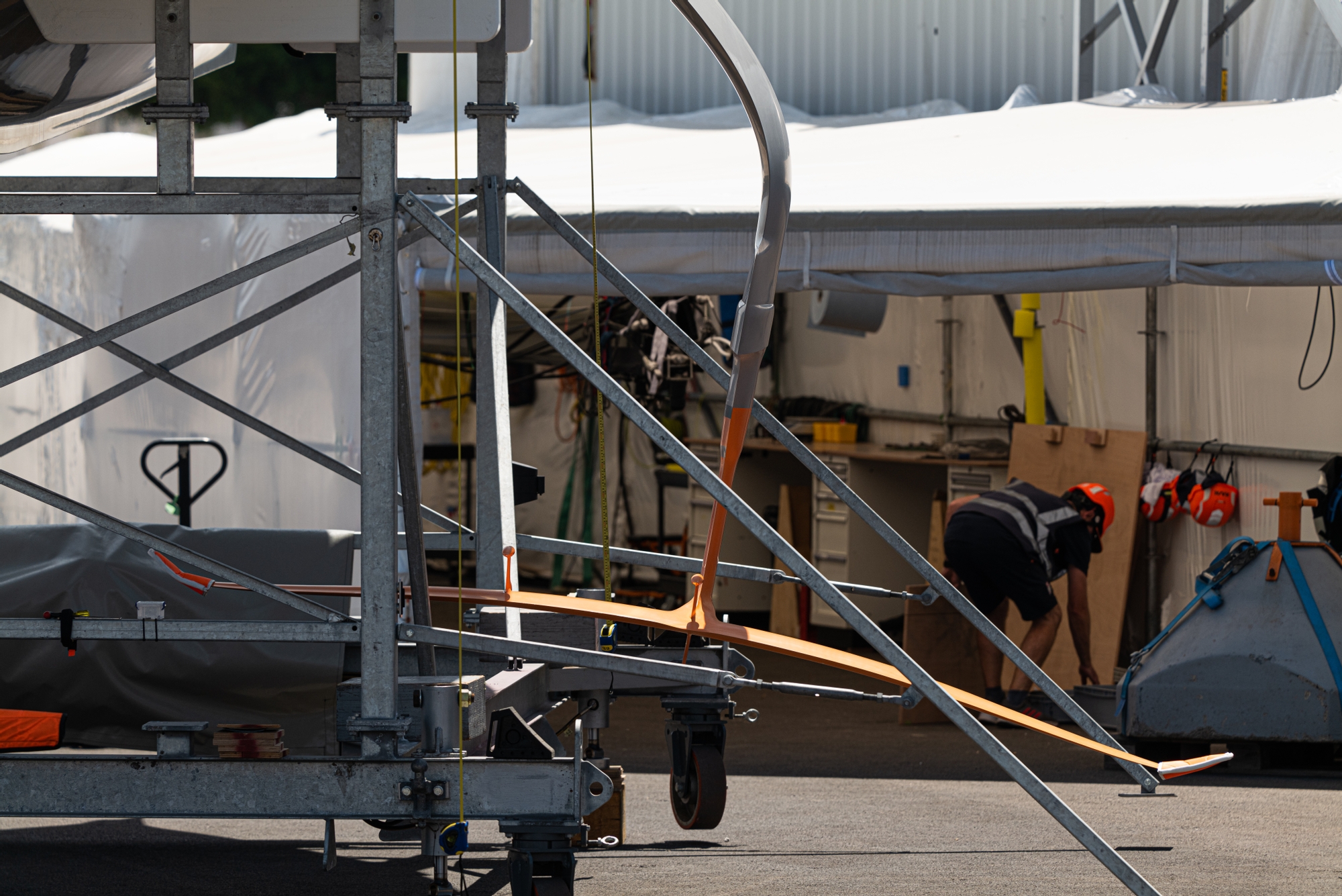 Other than the foils, no other changes to the boat were observed. After rolling out at 0930, the boat was levelled, the mast stepped, and the rig carefully calibrated, and load tested in the now familiar way – using precision equipment including a theodolite. With the rig setup completed by 1400, the mast was un-stepped by 1420, and the boat rolled back in the shed by 1500. A sailing session is scheduled for tomorrow.