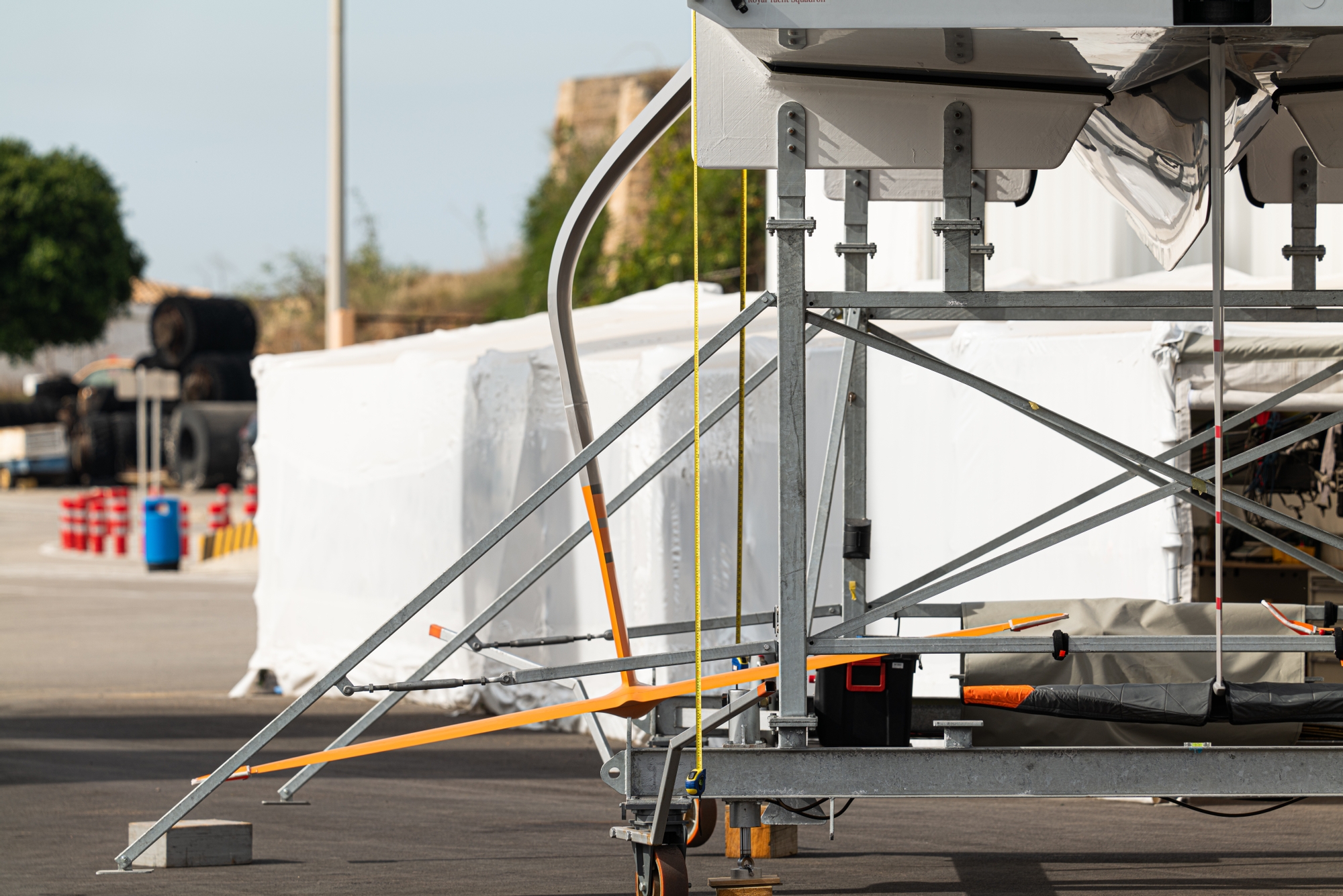 Its replacement on the starboard side is a gently curving anhedral with winglets both inboard and outboard that the on-site recon team immediately nicknamed the ‘banana foil’ that is covered in high mounted cameras – one on the upper inner foil arm, and two mounted above and below the centreline. Painted in high-vis orange and with plenty of immersion markers, the new foil complements the port side profil,e and it will be interesting to see the overall effect on T6’s performance going forward.