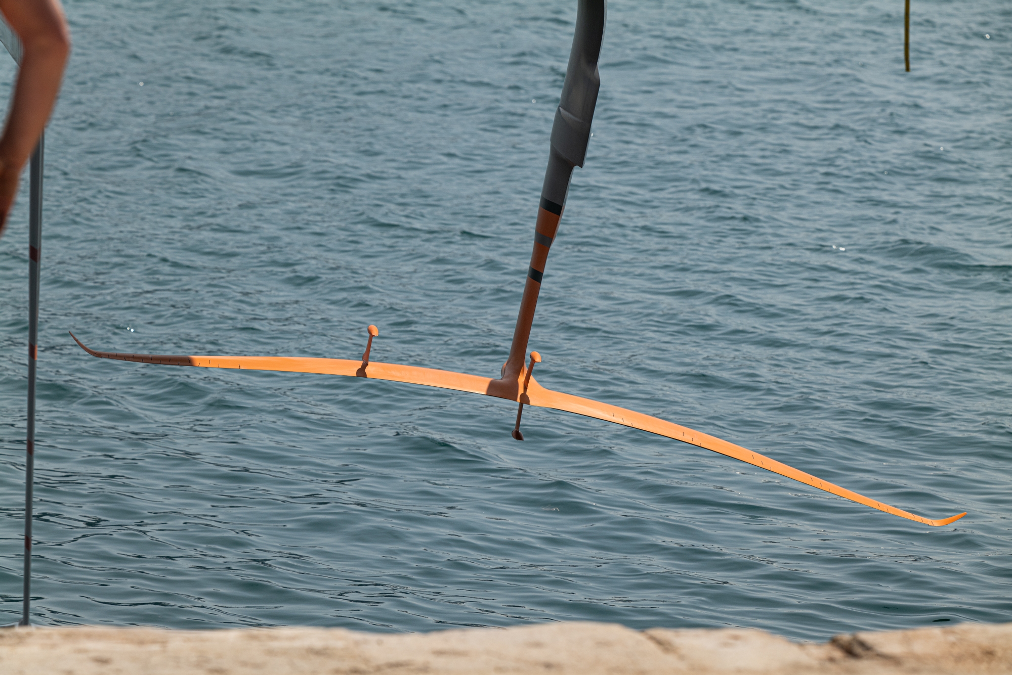 With the breeze up at 15-knots by now the yacht looked a little difficult to control at slow speed and one occasion ended up heeling precariously as it rounded up into the wind. A bow tow was used to get the boat moving forward with flow over the foils on starboard, but the take-off was self-generated. The resulting flight lasted just a couple of minutes however before the boat stopped again after a tack to port. A self-take-off followed which led to a 35-knot tight reach over to flatter water closer to shore for another stop with a chase boat alongside.
