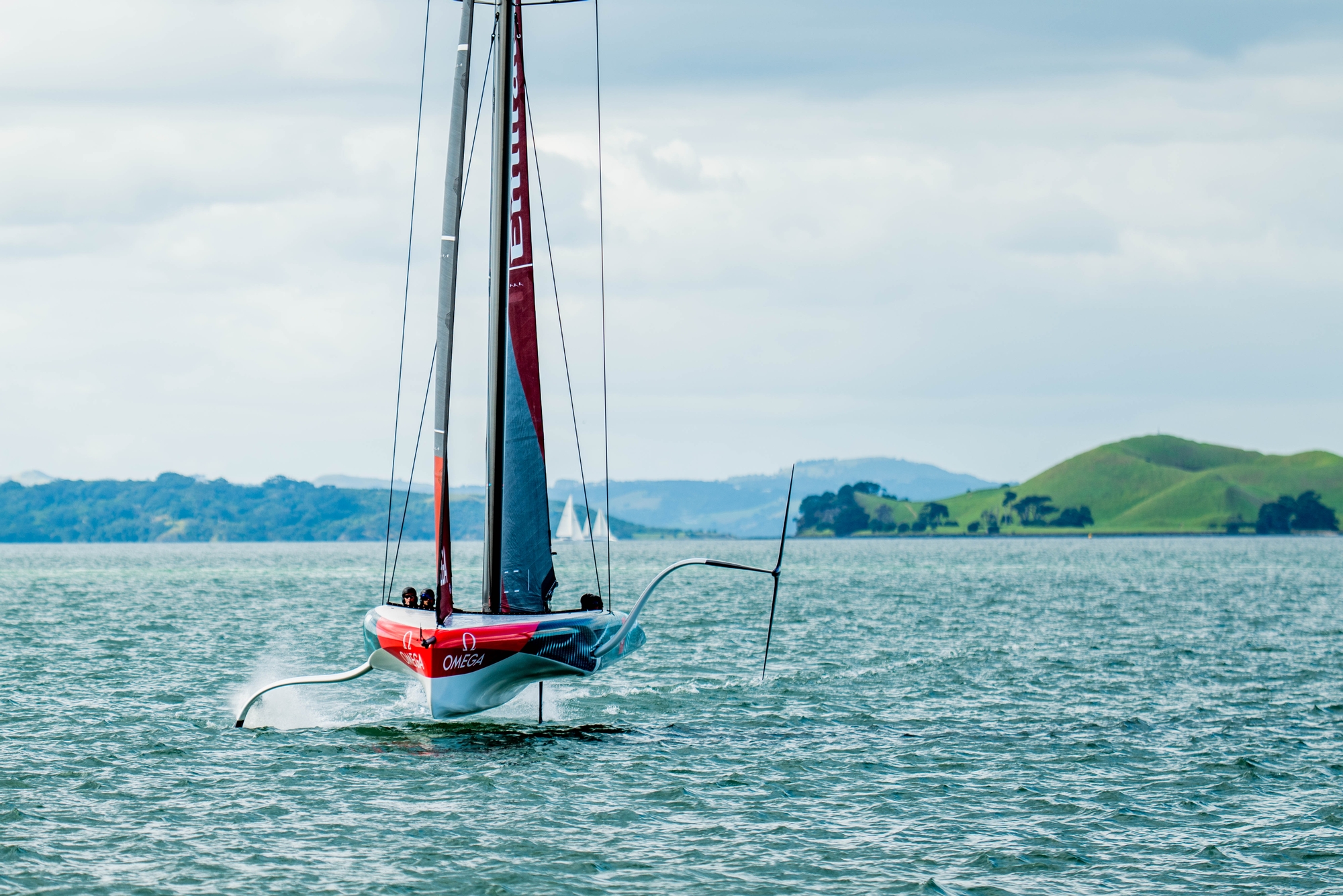 At 14.40 she was back in the water, and she was being towed back out to sea by 14.55. After several attempts to get foiling under the city, the chase boat was hailed and took her in tow. The LEQ12 dropped her tow off Devonport wharf at 15.28. From here she headed down the Rangitoto Channel and out past A buoy. Doing lots of moding on port gybe to check the new foil. After 2 hours of straight lining and moding she went into one prestart drill just off Number 12 buoy. Here the LEQ12 was pushed very hard into two full anti clockwise circles before sheeting on and beating back up the harbour in a dying breeze. She came off the foils just West of the Naval base in a very light spot and the chase came alongside to help douse sails. She was back in the pen at 17.31.