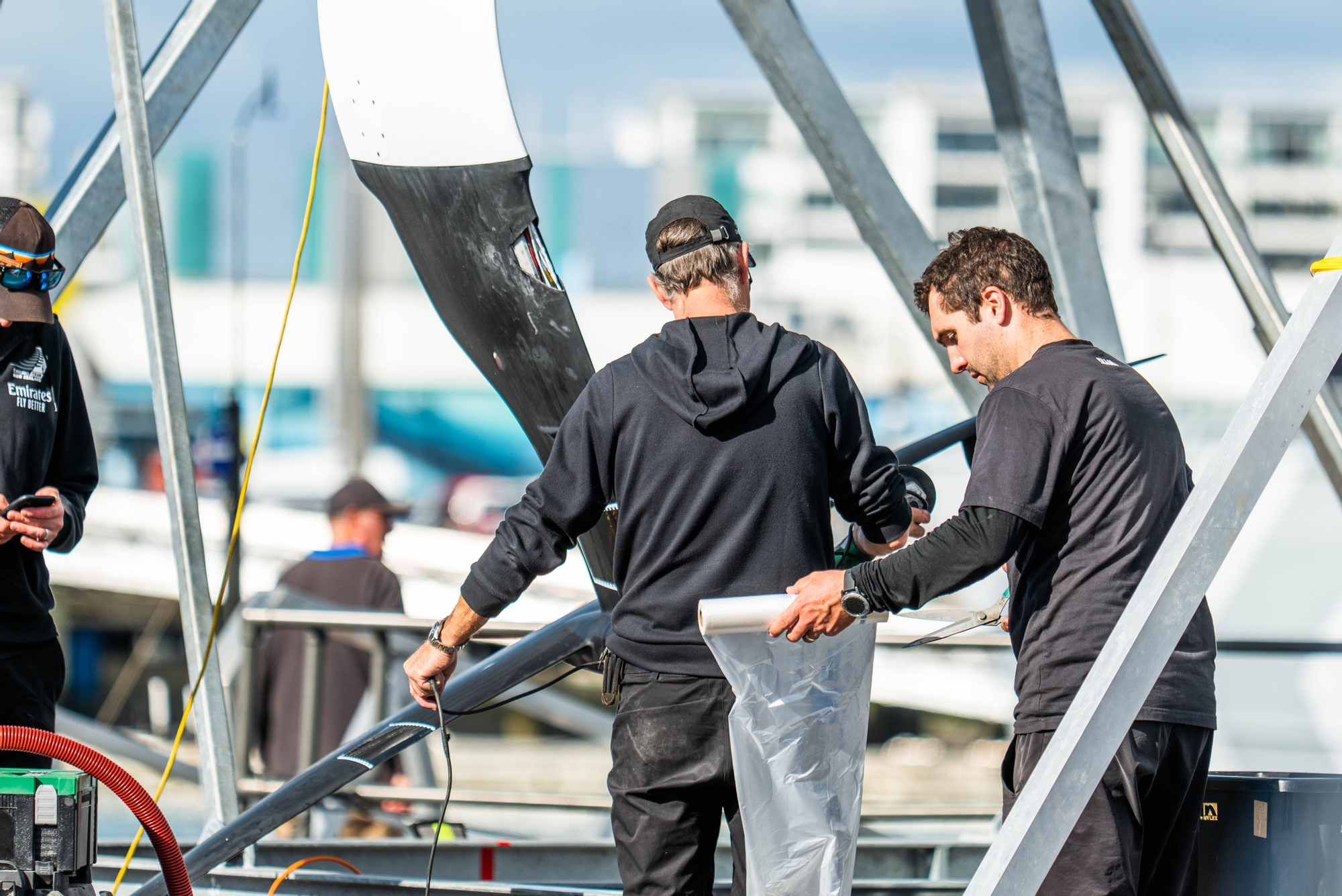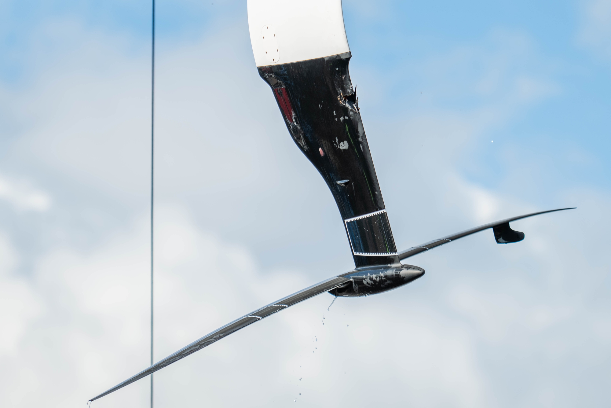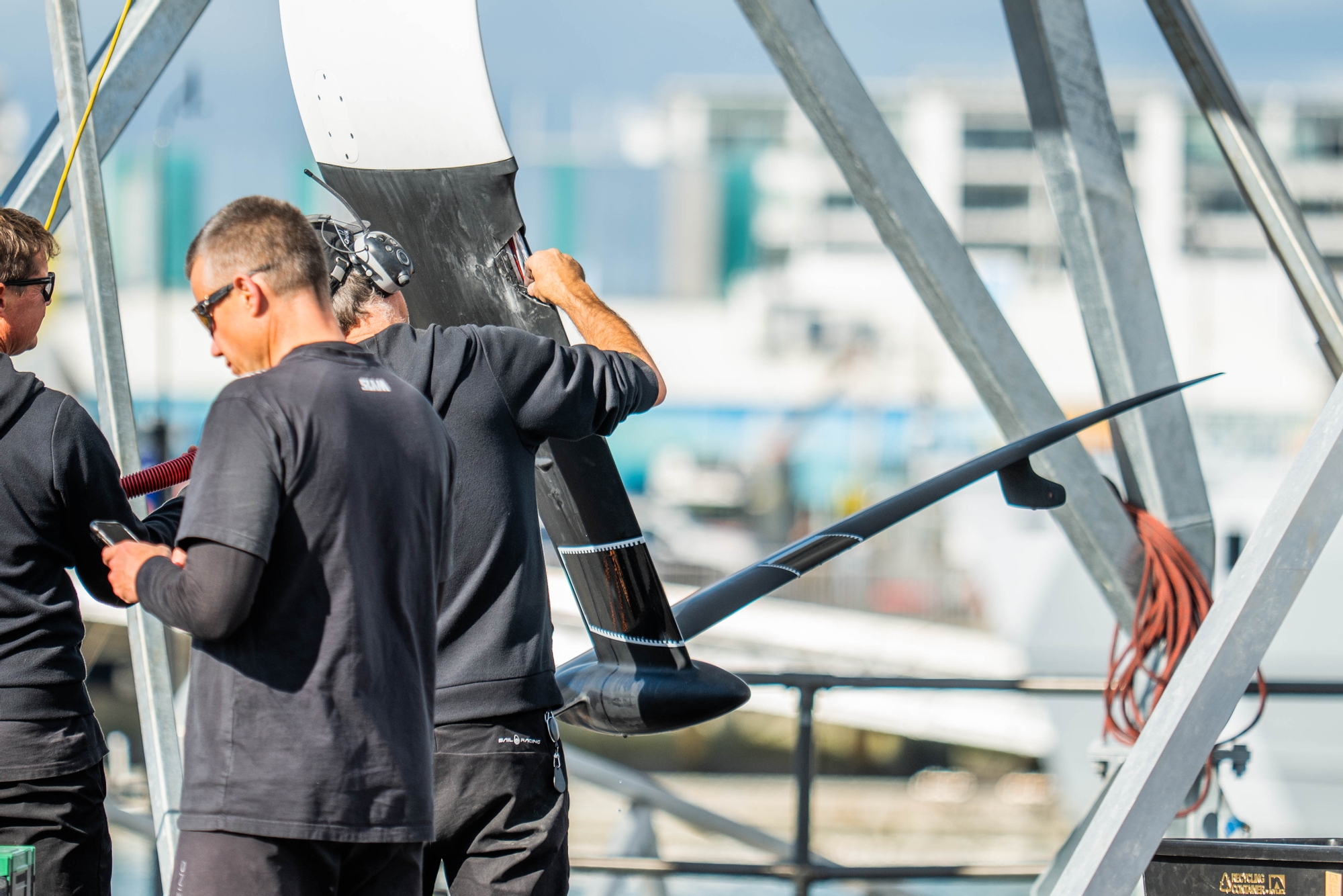 However, a collision with a log at speed on the second tack of the day just off North Head very nearly brought the day to an early conclusion for the LEQ12 with the starboard foil suffering damage just below the intersection with the foil arm. Immediately the sailors lowered the sails, and the chase boat team were in quickly, taking the boat back to the Wynyard Dock and hauling out for a thorough inspection. The maze of wires running down the lower foil arm could be clearly seen exposed, and the carbon fibre shards were quickly cut out and at double-speed, the repair was affected. Top job from the relentless shore team. The LEQ12 was dropped back into the briny a little under an hour later and towed out to join the AC40 with Liv Mackay and Josh Junior aboard for an entertaining afternoon session that stretched into the evening.