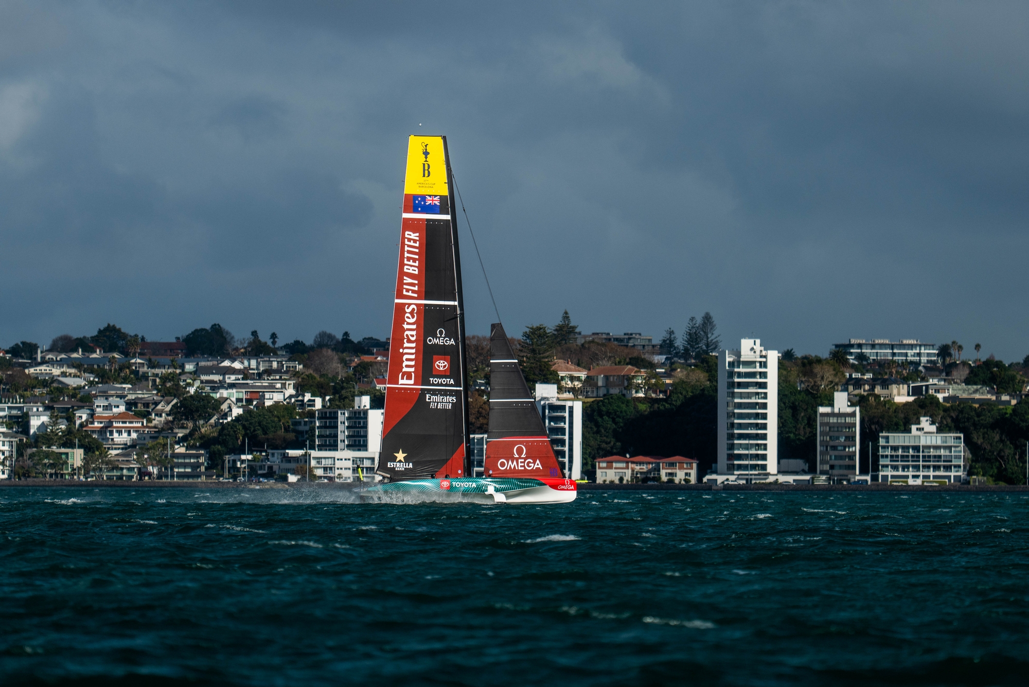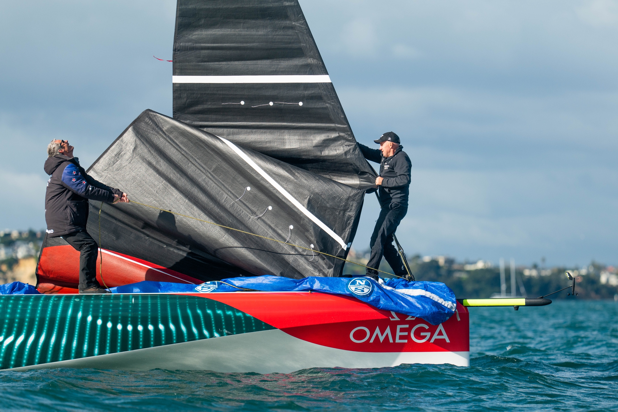 On a day where a pressure ‘cell’ came thundering down the Hauraki Gulf delivering winds in excess of 25 knots, it was all on for this stellar test team and with the smaller M2 mainsail set and the trusty J3 flying on a short afternoon blast, the sailors put down a serious marker to bring to a close their on-water training in Auckland.