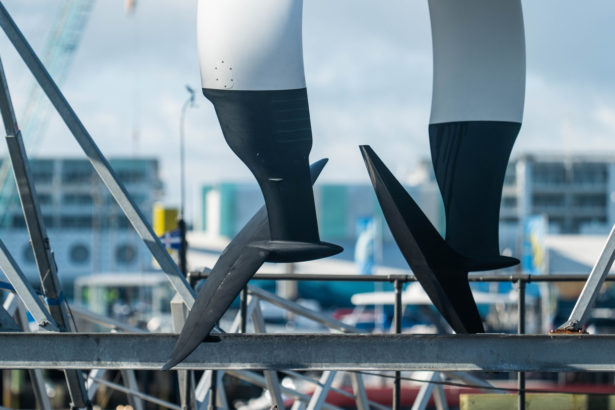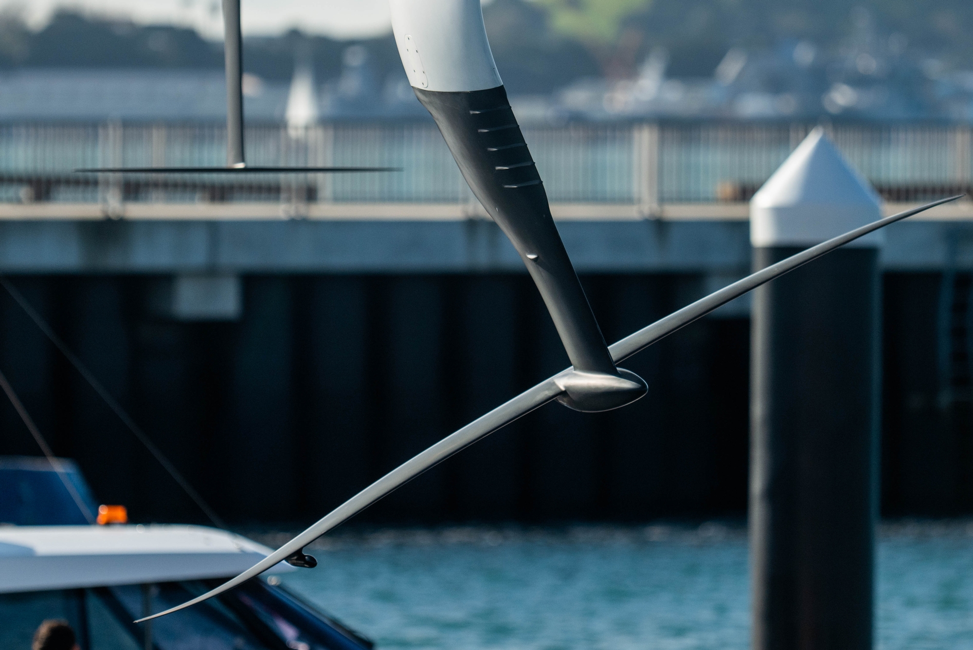 For sure today was a day for really digging into the data around this new foil with its riblets on the trailing edge of the foil arm at just below the surface that would appear to be angled to shift the water upwards at the leading edge, and the fully asymmetric foil arms that are mildly anhedral on the inside foil and curve upwards on the outside. The bulb itself is beefed up around the core with effective sidewalls to stop the effects of leeway and keep all the wight low whilst the connection to the foils themselves is an angular approach that forces water sharply over the inside of the foils and captured by the neatest camera mount about 50 centimetres above on the outside of the foil arm itself.