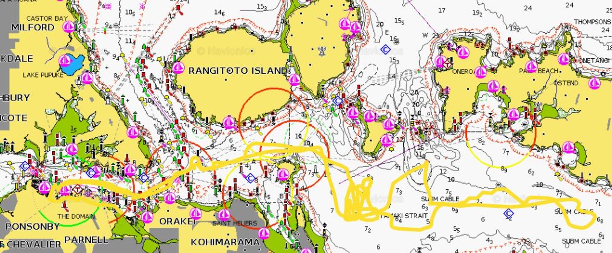 Upwind she went with us trying to keep close into 20-25 knots with a good bumpy wind chopped sea state of up to .7m. She tacked up into Eastern Beach and then ran down towards the Southern end of Motuihe where she came to a stop at 13.11.